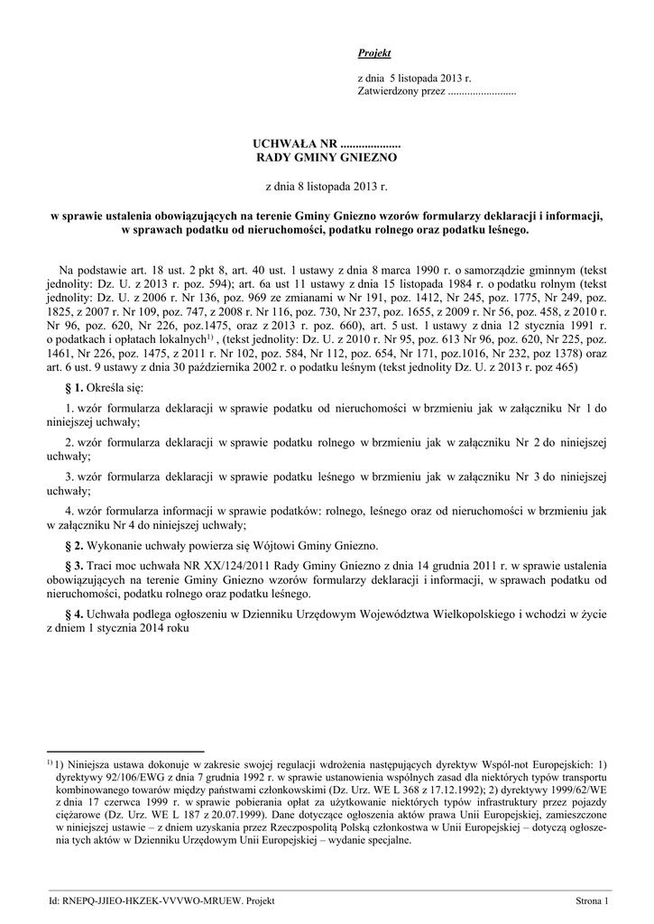 Projekt z dnia 5 listopada 2013 r. Zatwierdzony przez ......................... UCHWAŁA NR .................... RADY GMINY GNIEZNO z dnia 8 listopada 2013 r. w sprawie ustalenia obowiązujących na terenie Gminy Gniezno wzorów formularzy deklaracji i informacji, w sprawach podatku od nieruchomości, podatku rolnego oraz podatku leśnego. Na podstawie art. 18 ust. 2 pkt 8, art. 40 ust. 1 ustawy z dnia 8 marca 1990 r. o samorządzie gminnym (tekst jednolity: Dz. U. z 2013 r. poz. 594); art. 6a ust 11 ustawy z dnia 15 listopada 1984 r. o podatku rolnym (tekst jednolity: Dz. U. z 2006 r. Nr 136, poz. 969 ze zmianami w Nr 191, poz. 1412, Nr 245, poz. 1775, Nr 249, poz. 1825, z 2007 r. Nr 109, poz. 747, z 2008 r. Nr 116, poz. 730, Nr 237, poz. 1655, z 2009 r. Nr 56, poz. 458, z 2010 r. Nr 96, poz. 620, Nr 226, poz.1475, oraz z 2013 r. poz. 660), art. 5 ust. 1 ustawy z dnia 12 stycznia 1991 r. o podatkach i opłatach lokalnych1) , (tekst jednolity: Dz. U. z 2010 r. Nr 95, poz. 613 Nr 96, poz. 620, Nr 225, poz. 1461, Nr 226, poz. 1475, z 2011 r. Nr 102, poz. 584, Nr 112, poz. 654, Nr 171, poz.1016, Nr 232, poz 1378) oraz art. 6 ust. 9 ustawy z dnia 30 października 2002 r. o podatku leśnym (tekst jednolity Dz. U. z 2013 r. poz 465) § 1. Określa się: 1. wzór formularza deklaracji w sprawie podatku od nieruchomości w brzmieniu jak w załączniku Nr 1 do niniejszej uchwały; 2. wzór formularza deklaracji w sprawie podatku rolnego w brzmieniu jak w załączniku Nr 2 do niniejszej uchwały; 3. wzór formularza deklaracji w sprawie podatku leśnego w brzmieniu jak w załączniku Nr 3 do niniejszej uchwały; 4. wzór formularza informacji w sprawie podatków: rolnego, leśnego oraz od nieruchomości w brzmieniu jak w załączniku Nr 4 do niniejszej uchwały; § 2. Wykonanie uchwały powierza się Wójtowi Gminy Gniezno. § 3. Traci moc uchwała NR XX/124/2011 Rady Gminy Gniezno z dnia 14 grudnia 2011 r. w sprawie ustalenia obowiązujących na terenie Gminy Gniezno wzorów formularzy deklaracji i informacji, w sprawach podatku od nieruchomości, podatku rolnego oraz podatku leśnego. § 4. Uchwała podlega ogłoszeniu w Dzienniku Urzędowym Województwa Wielkopolskiego i wchodzi w życie z dniem 1 stycznia 2014 roku 1) 1) Niniejsza ustawa dokonuje w zakresie swojej regulacji wdrożenia następujących dyrektyw Wspól-not Europejskich: 1) dyrektywy 92/106/EWG z dnia 7 grudnia 1992 r. w sprawie ustanowienia wspólnych zasad dla niektórych typów transportu kombinowanego towarów między państwami członkowskimi (Dz. Urz. WE L 368 z 17.12.1992); 2) dyrektywy 1999/62/WE z dnia 17 czerwca 1999 r. w sprawie pobierania opłat za użytkowanie niektórych typów infrastruktury przez pojazdy ciężarowe (Dz. Urz. WE L 187 z 20.07.1999). Dane dotyczące ogłoszenia aktów prawa Unii Europejskiej, zamieszczone w niniejszej ustawie – z dniem uzyskania przez Rzeczpospolitą Polską członkostwa w Unii Europejskiej – dotyczą ogłoszenia tych aktów w Dzienniku Urzędowym Unii Europejskiej – wydanie specjalne. ————————————————————————————————————————————————————————— Id: RNEPQ-JJIEO-HKZEK-VVVWO-MRUEW. Projekt Strona 1 Uzasadnienie Formularze określone Uchwałą Nr XX/124/2011 Rady Gminy Gniezno z dnia 14 grudnia 2011 r. w sprawie ustalenia obowiązujących na terenie Gminy Gniezno wzorów formularzy deklaracji i informacji, w sprawach podatku od nieruchomości, podatku rolnego oraz podatku leśnego zostały zmodyfikowane w związku ze zmianą adresu siedziby Urzędu Gminy Gniezno wskazaną na formularzach jako miejsce składania. ————————————————————————————————————————————————————————— Id: RNEPQ-JJIEO-HKZEK-VVVWO-MRUEW. Projekt Strona 1 1. Numer Identyfikacji Podatkowej podatnika Załącznik Nr 1 do Uchwały Nr …………. Rady Gminy w Gnieźnie z dnia 8 listopada 2013 r. 2. - NIP lub PESEL .......................................................................................... DN-1 DEKLARACJA NA PODATEK OD NIERUCHOMOŚCI .. 3. Rok pieczęć podatnika Podstawa Składający: wna: Ustawa z dnia 12 stycznia 1991 r. o podatkach i opłatach lokalnych (tekst jednolity: Dz. U. z 2010 r. Nr 95, poz.613) Formularz przeznaczony dla osób prawnych, jednostek organizacyjnych oraz spółek niemających osobowości prawnej będących właścicielami nieruchomości lub obiektów budowlanych, posiadaczami samoistnymi nieruchomości lub obiektów budowlanych, użytkownikami wieczystymi gruntów, posiadaczami nieruchomości lub ich części albo obiektów budowlanych lub ich części, stanowiących własność Skarbu Państwa lub jednostki samorządu terytorialnego oraz dla osób fizycznych będących współwłaścicielami lub współposiadaczami z osobami prawnymi, bądź z innymi jednostkami organizacyjnymi nieposiadającymi osobowości prawnej lub ze spółkami nieposiadającymi osobowości prawnej, z wyjątkiem osób fizycznych tworzących wspólnotę mieszkaniową. Termin składania: Do 31 stycznia każdego roku podatkowego lub w terminie 14 dni od zaistnienia okoliczności mających wpływ na powstanie (wygaśnięcie) obowiązku podatkowego, lub wysokość opodatkowania. A. MIEJSCE SKŁADANIA DEKLARACJI Organ podatkowy właściwy ze względu na miejsce położenia przedmiotów opodatkowania. Wójt Gminy Gniezno 4. Nazwa i adres siedziby organu podatkowego Urząd Gminy Gniezno, 62-200 GNIEZNO Al. Reymonta 9-11 B. DANE IDENTYFIKACYJNE I ADRES SKŁADAJĄCEGO DEKLARACJĘ 5. Rodzaj podatnika (zaznaczyć właściwy kwadrat): 1. osoba fizyczna 2. osoba prawna 3. jednostka organizacyjna 6. Rodzaj własności, posiadania (zaznaczyć właściwy kwadrat): 1. właściciel 2. współwłaściciel 5. użytkownik wieczysty 6. współużytkownik wieczysty 4.spółka nieposiadająca osobowości prawn