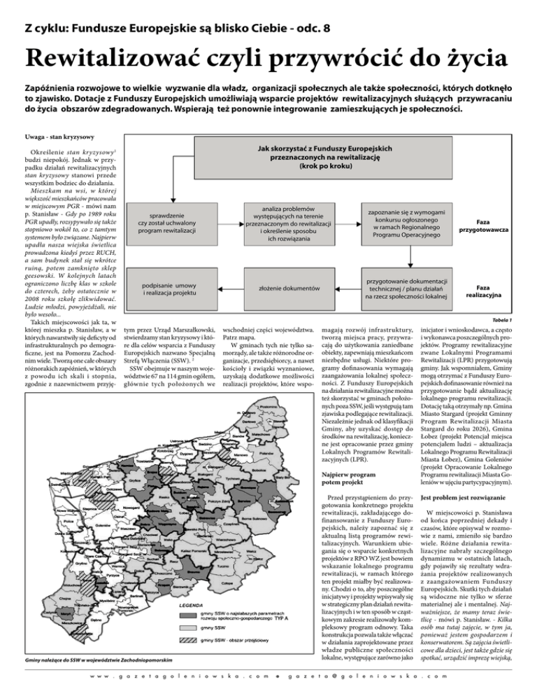 gazeta goleniowska - reklamy i ogłoszenia 18 02.12.2016 r. Z cyklu: Fundusze Europejskie są blisko Ciebie - odc. 8 Rewitalizować czyli przywrócić do życia Zapóźnienia rozwojowe to wielkie wyzwanie dla władz, organizacji społecznych ale także społeczności, których dotknęło to zjawisko. Dotacje z Funduszy Europejskich umożliwiają wsparcie projektów rewitalizacyjnych służących przywracaniu do życia obszarów zdegradowanych. Wspierają też ponownie integrowanie zamieszkujących je społeczności. Uwaga - stan kryzysowy Określenie stan kryzysowy 1 budzi niepokój. Jednak w przypadku działań rewitalizacyjnych stan kryzysowy stanowi przede wszystkim bodziec do działania. Mieszkam na wsi, w której większość mieszkańców pracowała w miejscowym PGR - mówi nam p. Stanisław - Gdy po 1989 roku PGR upadły, rozsypywało się także stopniowo wokół to, co z tamtym systemem było związane. Najpierw upadła nasza wiejska świetlica prowadzona kiedyś przez RUCH, a sam budynek stał się wkrótce ruiną, potem zamknięto sklep geesowski. W kolejnych latach ograniczono liczbę klas w szkole do czterech, żeby ostatecznie w 2008 roku szkołę zlikwidować. Ludzie młodzi, powyjeżdżali, nie było wesoło... Takich miejscowości jak ta, w której mieszka p. Stanisław, a w których nawarstwiły się deficyty od infrastrukturalnych po demograficzne, jest na Pomorzu Zachodnim wiele. Tworzą one całe obszary różnorakich zapóźnień, w których z powodu ich skali i stopnia, zgodnie z nazewnictwem przyję- Jak skorzystać z Funduszy Europejskich przeznaczonych na rewitalizację (krok po kroku) sprawdzenie czy został uchwalony program rewitalizacji podpisanie umowy i realizacja projektu analiza problemów występujących na terenie przeznaczonym do rewitalizacji i określenie sposobu ich rozwiązania zapoznanie się z wymogami konkursu ogłoszonego w ramach Regionalnego Programu Operacyjnego Faza przygotowawcza złożenie dokumentów przygotowanie dokumentacji technicznej / planu działań na rzecz społeczności lokalnej Faza realizacyjna Tabela 1 tym przez Urząd Marszałkowski, stwierdzamy stan kryzysowy i które dla celów wsparcia z Funduszy Europejskich nazwano Specjalną Strefą Włączenia (SSW). 2 SSW obejmuje w naszym województwie 67 na 114 gmin ogółem, głównie tych położonych we wschodniej części województwa. Patrz mapa. W gminach tych nie tylko samorządy, ale także różnorodne organizacje, przedsiębiorcy, a nawet kościoły i związki wyznaniowe, uzyskają dodatkowe możliwości realizacji projektów, które wspo- magają rozwój infrastruktury, tworzą miejsca pracy, przywracają do użytkowania zaniedbane obiekty, zapewniają mieszkańcom niezbędne usługi. Niektóre programy dofinasowania wymagają zaangażowania lokalnej społeczności. Z Funduszy Europejskich na działania rewitalizacyjne można też skorzystać w gminach położonych poza SSW, jeśli występują tam zjawiska podlegające rewitalizacji. Niezależnie jednak od klasyfikacji Gminy, aby uzyskać dostęp do środków na rewitalizację, konieczne jest opracowanie przez gminy Lokalnych Programów Rewitalizacyjnych (LPR). Najpierw program potem projekt Przed przystąpieniem do przygotowania konkretnego projektu rewitalizacji, zakładającego dofinansowanie z Funduszy Europejskich, należy zapoznać się z aktualną listą programów rewitalizacyjnych. Warunkiem ubiegania się o wsparcie konkretnych projektów z RPO WZ jest bowiem wskazanie lokalnego programu rewitalizacji, w ramach którego ten projekt miałby być realizowany. Chodzi o to, aby poszczególne inicjatywy i projekty wpisywały się w strategiczny plan działań rewitalizacyjnych i w ten sposób w cząstkowym zakresie realizowały kompleksowy program odnowy. Taka konstrukcja pozwala także włączać w działania zaprojektowane przez władze publiczne społeczności lokalne, występujące zarówno jako Gminy należące do SSW w województwie Zachodniopomorskim w w w . g a z e t a g o l e n i o w s k a . c o m O inicjator i wnioskodawca, a często i wykonawca poszczególnych projektów. Programy rewitalizacyjne zwane Lokalnymi Programami Rewitalizacji (LPR) przygotowują gminy. Jak wspomniałem, Gminy mogą otrzymać z Funduszy Europejskich dofinasowanie również na przygotowanie bądź aktualizację lokalnego programu rewitalizacji. Dotację taką otrzymały np. Gmina Miasto Stargard (projekt Gminny Program Rewitalizacji Miasta Stargard do roku 2026), Gmina Łobez (projekt Potencjał miejsca potencjałem ludzi – aktualizacja Lokalnego Programu Rewitalizacji Miasta Łobez), Gmina Goleniów (projekt Opracowanie Lokalnego Programu rewitalizacji Miasta Goleniów w ujęciu partycypacyjnym). Jest problem jest rozwiązanie W miejscowości p. Stanisława od końca poprzedniej dekady i czasów, które opisywał w rozmowie z nami, zmieniło się bardzo wiele. Różne działania rewitalizacyjne nabrały szczególnego dynamizmu w ostatnich latach, gdy pojawiły się rezultaty wdrażania projektów realizowanych z zaangażowaniem Funduszy Europejskich. Skutki tych działań są widoczne nie tylko w sferze materialnej ale i mentalnej. Najważniejsze, że mamy teraz świetlicę - mówi p. Stanisław. - Kilka osób ma tutaj zajęcie, w tym ja, ponieważ jestem gospodarzem i konserwatorem. Są zajęcia świetlicowe dla dzieci, jest także gdzie się spotkać, urządzić imprezę wiejską, g a z e t a @ g o l e n i o w s k a . c o m gazeta goleniowska - reklamy i ogłoszenia 02.12.2016 r. Świetlica w Krzywicach, gmina Osina, wybudowana z funduszy PROW można bez wstydu zaprosić osoby z odczytami czy na spotkania literackie. Wszystko to było możliwe, gdy na wieś trafiły Fundusze Europejskie. Te same, które stanowią podstawę finansowania projektów rewitalizacyjnych RPO WZ na najbliższe lata. Obecnie wsparcie będzie udzielane m. in. w trybie działania 9.3 RPOWZ 9.3 Wspieranie rewitalizacji fizycznej, gospodarczej i społe
