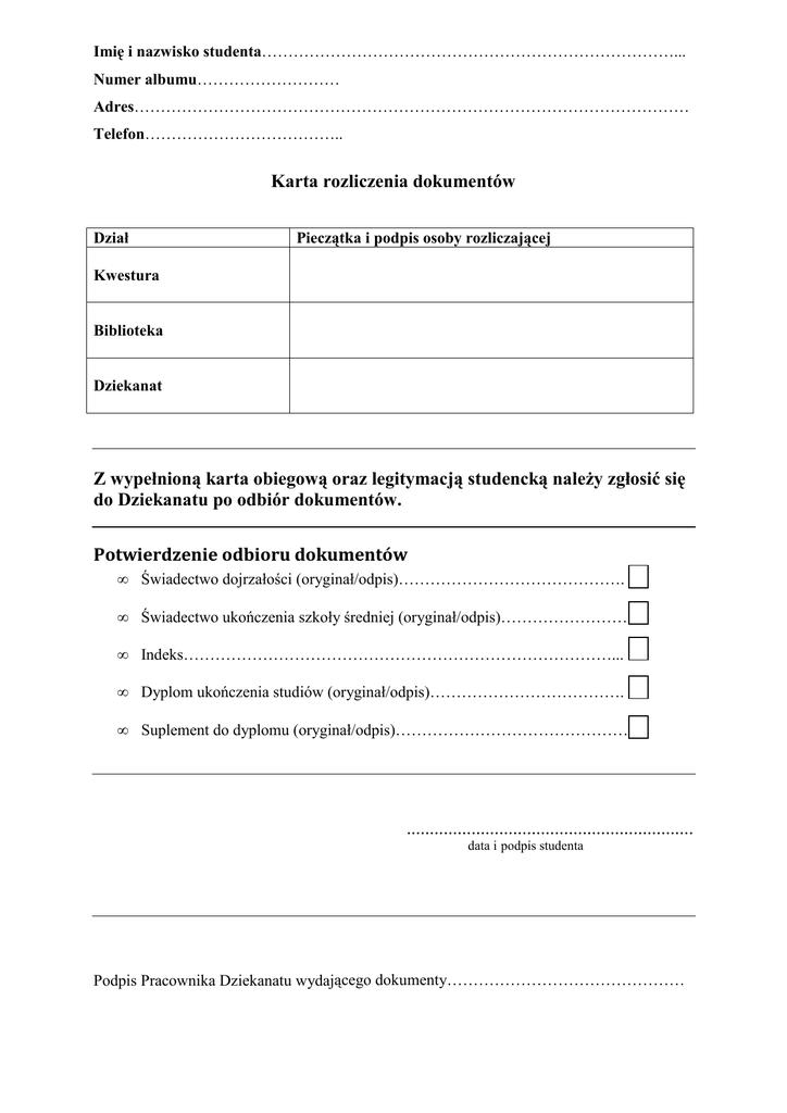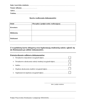 Imię i nazwisko studenta……………………………………………………………………... Numer albumu……………………… Adres…………………………………………………………………………………………… Telefon……………………………….. Karta rozliczenia dokumentów Pieczątka i podpis osoby rozliczającej Dział Kwestura Biblioteka Dziekanat Z wypełnioną karta obiegową oraz legitymacją studencką należy zgłosić się do Dziekanatu po odbiór dokumentów. Potwierdzenie odbioru dokumentów • Świadectwo dojrzałości (oryginał/odpis)……………………………………. • Świadectwo ukończenia szkoły średniej (oryginał/odpis)………………………. • Indeks………………………………………………………………………... • Dyplom ukończenia studiów (oryginał/odpis)………………………………. • Suplement do dyplomu (oryginał/odpis)……………………………………… .............................................................. data i podpis studenta Podpis Pracownika Dziekanatu wydającego dokumenty………………………………………
