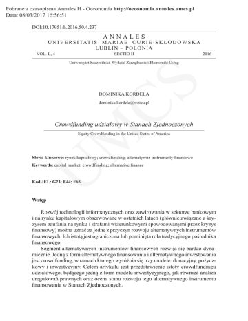 Pobrane z czasopisma Annales H - Oeconomia http://oeconomia.annales.umcs.pl Data: 08/03/2017 16:56:51 DOI:10.17951/h.2016.50.4.237 ANNALES U N I V E R S I TAT I S M A R I A E C U R I E - S K Ł O D O W S K A LU BLI N – P O L ONIA VOL. L, 4 SECTIO H 2016 CS Uniwersytet Szczeciński. Wydział Zarządzania i Ekonomiki Usług DOMINIKA KORDELA [email protected] M Crowdfunding udziałowy w Stanach Zjednoczonych Equity Crowdfunding in the United States of America Słowa kluczowe: rynek kapitałowy; crowdfunding; alternatywne instrumenty finansowe U Keywords: capital market; crowdfunding; alternative finance Kod JEL: G23; E44; F65 Wstęp Rozwój technologii informatycznych oraz zawirowania w sektorze bankowym i na rynku kapitałowym obserwowane w ostatnich latach (głównie związane z kryzysem zaufania na rynku i stratami wizerunkowymi spowodowanymi przez kryzys finansowy) można uznać za jedne z przyczyn rozwoju alternatywnych instrumentów finansowych. Ich istotą jest ograniczona lub pominięta rola tradycyjnego pośrednika finansowego. Segment alternatywnych instrumentów finansowych rozwija się bardzo dynamicznie. Jedną z form alternatywnego finansowania i alternatywnego inwestowania jest crowdfunding, w ramach którego wyróżnia się trzy modele: donacyjny, pożyczkowy i inwestycyjny. Celem artykułu jest przedstawienie istoty crowdfundingu udziałowego, będącego jedną z form modelu inwestycyjnego, jak również analiza uregulowań prawnych oraz ocena stanu rozwoju tego alternatywnego instrumentu finansowania w Stanach Zjednoczonych. Pobrane z czasopisma Annales H - Oeconomia http://oeconomia.annales.umcs.pl Data: 08/03/2017 16:56:51 238 DOMINIKA KORDELA 1. Crowdfunding jako konsekwencja wirtualizacji rynku finansowego U M CS Postęp technologiczny związany z rozwojem technologii internetowych oraz postępująca globalizacja w obszarze realnej gospodarki i rynków finansowych zmieniły i wciąż zmieniają nie tylko wiele aspektów codzienności, ale również funkcjonowanie rynku finansowego. Konsekwencje przeobrażeń w obszarze rynku finansowego to m.in. powstawanie nowych kanałów dystrybucji usług finansowych i instrumentów finansowych, tworzenie alternatywnych platform giełdowych, skrócenie czasu realizacji transakcji, łatwy i szybki dostęp do rachunków bankowych i inwestycyjnych, nieograniczony geograficznie dostęp do źródeł finansowania i inwestycji oraz powstawanie nowych instrumentów finansowych. Efektem cyfryzacji rynku finansowego jest nie tylko wzrost liczby internetowych rachunków bankowych i inwestycyjnych, ale także rozwój internetowych usług finansowych bez udziału instytucji finansowych (lub z udziałem ograniczającym się tylko do rozliczenia transakcji). Na malejące znaczenie tradycyjnych pośredników na rynku finansowym oraz rozwój alternatywnych instrumentów finansowych wskazują również Klimontowicz i Harasim [2015, s. 230]. Przykładem inicjatyw alternatywnego finansowania jest crowdfunding, rozumiany jako użycie małych kwot pieniędzy pozyskiwanych od dużej liczby osób indywidualnych lub organizacji na sfinansowanie projektu, przedsięwzięcia lub pożyczki oraz innych potrzeb za pośrednictwem internetowych platform [Kirby, Worner, 2014, s. 4]. W polskiej literaturze przedmiotu Dziuba definiuje crowdfunding jako dowolną formę gromadzenia środków finansowych przez sieć komputerową (ujęcie szersze), wskazuje też węższe ujęcie definicyjne, określając tym terminem proces zbierania środków przez przedsiębiorstwa, artystów lub organizacje non-profit na potrzeby realizacji projektów, organizacji przedsięwzięć i inwestycje [Dziuba, 2012, s. 84]. W swoim raporcie UKIE wyróżniło trzy modele crowdfundingu: donacyjny, pożyczkowy oraz inwestycyjny, w ramach którego wyróżnia się crowdfunding udziałowy (equity crowdfunding). W modelu inwestycyjnym środki przekazywane są w zamian za obietnicę objęcia udziału w przedsiębiorstwie (crowdfunding udziałowy) lub zyskach (tzw. model zbiorowego inwestowania, inwestor otrzymuje prawo do udziału w zyskach lub przychodach generowanych przez finansowany projekt, natomiast nie otrzymuje udziałów [akcji] w przedsiębiorstwie realizującym projekt) [UKIE, 2012]. Model donacyjny rozwinął się jako pierwszy. Sukces platform działających w formie rewards-based crowdfunding (istotą jest symboliczne wynagradzanie uczestników wspierających finansowo różne projekty) spowodował wykorzystanie potencjału internetu dla celów pozyskania kapitałów przez przedsiębiorstwa, będące na etapie start-upu, za pośrednictwem wyspecjalizowanych platform. Podstawową cechą crowdfundingu, bez względu na jego formy, jest zatem przebieg i realizacja transakcji w internecie, w zasadzie bez korzystania z usług pośredników finansowych (poza momentem rozliczenia transakcji). Pobrane z czasopisma Annales H - Oeconomia http://oeconomia.annales.umcs.pl Data: 08/03/2017 16:56:51 Crowdfunding udziałowy w Stanach Zjednoczonych 239 2. Crowdfunding udziałowy – systematyka pojęć, rozwój instrumentu U M CS Istota crowdfundingu udziałowego polega na skierowaniu przez przedsiębiorstwa za pośrednictwem internetu oferty sprzedaży udziałów do wielu inwestorów w celu pozyskania środków finansowych na rozwój działalności. Kojarzeniem przedsiębiorstw i inwestorów zajmują się wyspecjalizowane platformy internetowe, które zapewniają środki do realizacji transakcji. Platformy internetowe dostarczają zwykle stosownego oprogramowania, tworzą regulaminy zapewniające legalność transakcji, umożliwiają finansową realizację transakcji przy udziale określonych kanałów płatności [Ahlers i in., 2015, s. 957]. Proces finansowania i inwestowania za pośrednictwem platform crowdfundingu udziałowego jest inicjowany przez przedsiębiorstwo mające zapotrzebowanie na kapitał (zwykle na określony i opisany cel). Potencjalni inwestorzy wyszukują interesujące oferty i p