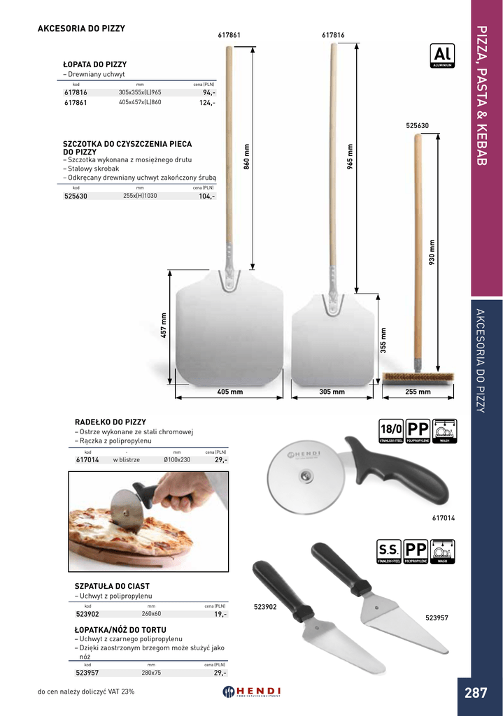 617861 PIZZA, PASTA & KEBAB AKCESORIA DO PIZZY 617816 ŁOPATA DO PIZZY ––Drewniany uchwyt kod 617816 617861 mm cena (PLN) 94,124,- 305x355x(L)965 405x457x(L)860 860 mm SZCZOTKA DO CZYSZCZENIA PIECA DO PIZZY ––Szczotka wykonana z mosiężnego drutu ––Stalowy skrobak ––Odkręcany drewniany uchwyt zakończony śrubą kod mm cena (PLN) 104,- 255x(H)1030 355 mm Akcesoria do pizzy 457 mm 930 mm 525630 965 mm 525630 405 mm 305 mm 255 mm RADEŁKO DO PIZZY ––Ostrze wykonane ze stali chromowej ––Rączka z polipropylenu kod 617014 - mm w blistrze Ø100x230 cena (PLN) 29,- 617014 SZPATUŁA DO CIAST ––Uchwyt z polipropylenu kod 523902 mm 260x60 cena (PLN) 19,- 523902 523957 ŁOPATKA/NÓŻ DO TORTU ––Uchwyt z czarnego polipropylenu ––Dzięki zaostrzonym brzegom może służyć jako nóż kod 523957 do cen należy doliczyć VAT 23% mm 280x75 cena (PLN) 29,- 287 PIZZA, PASTA & KEBAB TORBY TERMOIZOLACYJNE ––Opakowania termoizolacyjne pozwolą zaoszczędzić czas i pieniądze, jak i poprawić jakość Państwa usług ––Produkt dotrze do klienta gorący i zachowa walory smakowe ––Dostępne w dwóch wielkościach TORBA DO PIZZY - KARTON 350x350 mm ––Szczelne, regulowane zamknięcie na rzepy ––Mocny i łatwy do czyszczenia materiał kod 709825 pojemność wymiary (mm) 4 kartony 350x350 cena (PLN) 99,- TORBA DO PIZZY - KARTON 450x450 mm ––Szczelne, regulowane zamknięcie na rzepy ––Mocny i łatwy do czyszczenia materiał kod 709818 999881 pojemność wymiary (mm) 4 kartony 450x450 3 kartony 450x450 cena (PLN) 129,38,- TORBY TERMOIZOLACYJNE 709825 Na wierzchu przezroczyste kieszenie na rachunki 709818 709849 TORBA LUNCHBOX kod 709900 - 709849 6 lunchboxów mm cena (PLN) 109,- 450x290(H)300 PODKŁADKI DYSTANSOWE DO PIZZY ––Opakowanie 500 szt. ––Wysokość podkładki: 35 mm kod 709900 288 cena (PLN) 29,- do cen należy doliczyć VAT 23%