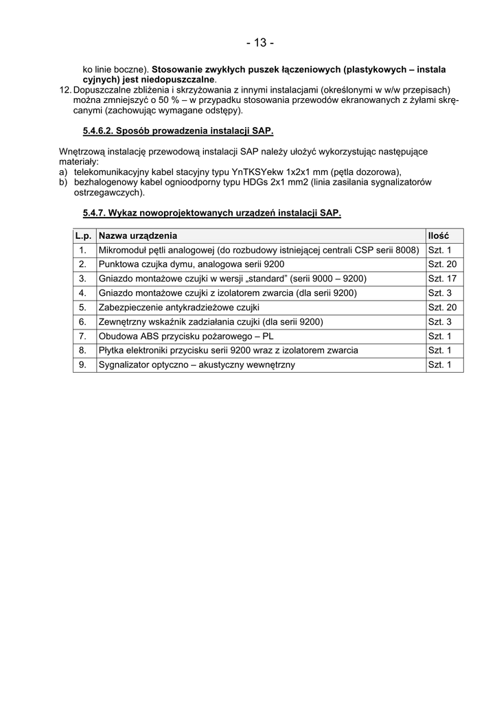 - 13 ko linie boczne). Stosowanie zwykłych puszek łączeniowych (plastykowych – instala cyjnych) jest niedopuszczalne. 12. Dopuszczalne zbliżenia i skrzyżowania z innymi instalacjami (określonymi w w/w przepisach) można zmniejszyć o 50 % – w przypadku stosowania przewodów ekranowanych z żyłami skręcanymi (zachowując wymagane odstępy). 5.4.6.2. Sposób prowadzenia instalacji SAP. Wnętrzową instalację przewodową instalacji SAP należy ułożyć wykorzystując następujące materiały: a) telekomunikacyjny kabel stacyjny typu YnTKSYekw 1x2x1 mm (pętla dozorowa), b) bezhalogenowy kabel ognioodporny typu HDGs 2x1 mm2 (linia zasilania sygnalizatorów ostrzegawczych). 5.4.7. Wykaz nowoprojektowanych urządzeń instalacji SAP. L.p. Nazwa urządzenia Ilość 1. Mikromoduł pętli analogowej (do rozbudowy istniejącej centrali CSP serii 8008) Szt. 1 2. Punktowa czujka dymu, analogowa serii 9200 Szt. 20 3. Gniazdo montażowe czujki w wersji „standard” (serii 9000 – 9200) Szt. 17 4. Gniazdo montażowe czujki z izolatorem zwarcia (dla serii 9200) Szt. 3 5. Zabezpieczenie antykradzieżowe czujki Szt. 20 6. Zewnętrzny wskaźnik zadziałania czujki (dla serii 9200) Szt. 3 7. Obudowa ABS przycisku pożarowego – PL Szt. 1 8. Płytka elektroniki przycisku serii 9200 wraz z izolatorem zwarcia Szt. 1 9. Sygnalizator optyczno – akustyczny wewnętrzny Szt. 1 - 12 Założenia przyjęte przy opracowaniu dokumentacji – gwarantujące możliwość wykonania zaprojektowanej instalacji sygnalizacji pożarowej: a) istniejąca w budynku ochrony „ogólnobudynkowa” centrala sygnalizacji pożarowej typu 8008 posiada możliwość wymaganej obecnie rozbudowy (istnieje możliwość zamontowania dodatkowego mikromodułu pętli analogowej), b) kable sieci wiążącej – przyłączeniowej pomiędzy istniejącą na obiekcie (w obrębie przebudowy) puszką łączeniową posiadają minimum 4 wolne żyły o odpowiednim przekroju – do poprowadzenia nowoprojektowanej pętli dozorowej oznaczonej symbolem XX bezpośrednio od budynku portierni, c) w obrębie rozbudowy instalacji SAP (II piętro w części „1 – G” budynku głównego) istnieje linia sygnalizatorów ostrzegawczych, do których można podłączyć nowe urządzenia (w przypadku braku takiej linii należy dodatkowo zamontować zasilacz buforowy 24 V DC oraz moduł pętlowy) – z ewentualnym zastrzeżeniem ujętym w podpunkcie UWAGA nr 2. 5.4.5. Linia sygnalizatorów ostrzegawczych. Linia SYG X: a) wersja nr I – istniejąca, obejmuje X sygnalizatorów ostrzegawczych zamontowanych w strefie X obiektu. W chwili obecnej, do istniejącej linii SYG X przewiduje się podłączenie 1. dodatkowego sygnalizatora optyczno – akustycznego przewidzianego do zamontowania na korytarzu Oddziału (w obszarze obecnej przebudowy / modernizacji części Oddziału Hepatobiliarnego). b) wersja nr II – nowoprojektowana, obejmuje 1. sygnalizator optyczno – akustyczny przewidziany do zamontowania na korytarzu Oddziału (w obszarze obecnej przebudowy / modernizacji części Oddziału Hepatobiliarnego) – zasilany z indywidualnego zasilacza buforowego 24 V DC. 5.4.6. Wymagania w zakresie montażu. Instalację elektryczną instalacji SAP należy wykonać zgodnie ze Specyfikacją Techniczną PKN – CEN / TS 54 –14 : 2006 „Systemy sygnalizacji pożarowej. Projektowanie, zakładanie, odbiór, eksploatacja i konserwacja instalacji”, normą BN – 84 / 8984 – 10 – „Zakładowe sieci telekomunikacyjne przewodowe. Instalacje wnętrzowe. Wymagania ogólne”, aktualnie obowiązującymi przepisami, normami BHP i ppoż. oraz Polskimi Normami. 5.4.6.1. Sposób wykonania instalacji SAP. 1. Przewody pętli dozorowej, linii sygnalizatorów ostrzegawczych (24 V DC) oraz przewody o napięciu 230 V AC powinny przechodzić przez ściany i stropy oddzielnymi przebiciami (odpowiednio zabezpieczonymi). 2. Przy skrzyżowaniu z innymi instalacjami, przewód instalacji ppoż. powinien iść jak najniżej (najbliżej ściany) – zachowując wymagane odstępy. 3. Przewody muszą być odpowiednio chronione, prowadzone i zamocowane oraz spełniać wymagania stawiane przez samo pomieszczenie. 4. Przewody muszą być układane na stałe, przy pomocy odpowiedniego osprzętu instalacyjnego tak, aby możliwość ich uszkodzenia była znikoma. 5. Nie wolno mocować przewodów do linek nośnych opraw oświetleniowych. 6. Instalację należy wykonać za pomocą przewodów wyszczególnionych w punkcie 3.4.6.2. 7. Nie zaleca się równoległego łączenia żył w celu zwiększenia ich przekroju. 8. Należy dążyć do tego, aby ilość połączeń była jak najmniejsza. 9. Zabronione jest skręcanie żył w celu ich połączenia. 10. Połączenia powinny być lutowane lub wykonane niezawodną, mechaniczną metodą (np. przy zastosowaniu połączeń śrubowych lub zacisków). 11. Wszelkie połączenia przewodów linii sygnalizatorów ostrzegawczych powinny być wykonane przy pomocy puszek metalowych zawierających porcelanowe / ceramiczne listwy zaciskowe (z bezpiecznikami wewnętrznymi – w przypadku podłączenia sygnalizatorów ostrzegawczych, ja - 11 W chwili obecnej, w momencie wykrycia zagrożenia pożarowego w obrębie pomieszczeń wchodzących w zakres opracowania (na sygnał pochodzący z systemu SAP), nie przewiduje się: a) automatycznego wyłączenia urządzeń technologicznych na Oddziale, b) automatycznego wyłączenia urządzeń wentylacji (z uwagi na ich ograniczony obszar działania – wyłącznie pomieszczenia sanitarne), c) automatycznego wyłączenia napięcia elektrycznego na Oddziale. 5.4.3. Dobór czujek. Na obecnym etapie opracowania (Projekt Budowlany) nie określono szczegółowo rodzaju czujek dymu, które należy zastosować do detekcji dymu w danym pomieszczeniu, czy przestrzeni obiektu. W uzgodnieniu z Użytkownikiem obiektu i Rzeczoznawcą ds. Zabezpieczenia Przeciwpożarowego, na etapie projektu wykonawczego należy uzgodnić / dobrać, ja