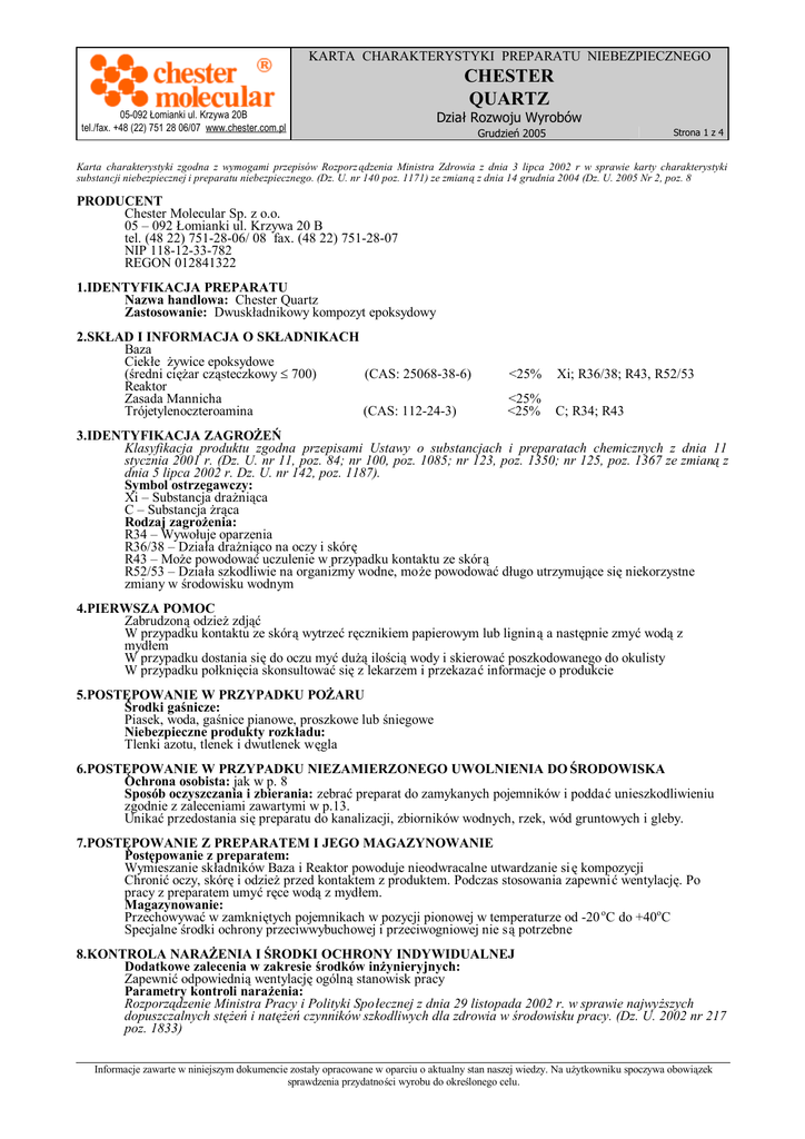 KARTA CHARAKTERYSTYKI PREPARATU NIEBEZPIECZNEGO 05-092 Łomianki ul. Krzywa 20B tel./fax. +48 (22) 751 28 06/07 www.chester.com.pl CHESTER QUARTZ Dział Rozwoju Wyrobów Grudzień 2005 Strona 1 z 4 Karta charakterystyki zgodna z wymogami przepisów Rozporz ądzenia Ministra Zdrowia z dnia 3 lipca 2002 r w sprawie karty charakterystyki substancji niebezpiecznej i preparatu niebezpiecznego. (Dz. U. nr 140 poz. 1171) ze zmianą z dnia 14 grudnia 2004 (Dz. U. 2005 Nr 2, poz. 8 PRODUCENT Chester Molecular Sp. z o.o. 05 – 092 Łomianki ul. Krzywa 20 B tel. (48 22) 751-28-06/ 08 fax. (48 22) 751-28-07 NIP 118-12-33-782 REGON 012841322 1.IDENTYFIKACJA PREPARATU Nazwa handlowa: Chester Quartz Zastosowanie: Dwuskładnikowy kompozyt epoksydowy 2.SKŁAD I INFORMACJA O SKŁADNIKACH Baza Ciekłe żywice epoksydowe (średni ciężar cząsteczkowy ≤ 700) (CAS: 25068-38-6) Reaktor Zasada Mannicha Trójetylenoczteroamina (CAS: 112-24-3) <25% Xi; R36/38; R43, R52/53 <25% <25% C; R34; R43 3.IDENTYFIKACJA ZAGROŻEŃ Klasyfikacja produktu zgodna przepisami Ustawy o substancjach i preparatach chemicznych z dnia 11 stycznia 2001 r. (Dz. U. nr 11, poz. 84; nr 100, poz. 1085; nr 123, poz. 1350; nr 125, poz. 1367 ze zmianą z dnia 5 lipca 2002 r. Dz. U. nr 142, poz. 1187). Symbol ostrzegawczy: Xi – Substancja drażniąca C – Substancja żrąca Rodzaj zagrożenia: R34 – Wywołuje oparzenia R36/38 – Działa drażniąco na oczy i skórę R43 – Może powodować uczulenie w przypadku kontaktu ze skórą R52/53 – Działa szkodliwie na organizmy wodne, może powodować długo utrzymujące się niekorzystne zmiany w środowisku wodnym 4.PIERWSZA POMOC Zabrudzoną odzież zdjąć W przypadku kontaktu ze skórą wytrzeć ręcznikiem papierowym lub lignin ą a następnie zmyć wodą z mydłem W przypadku dostania się do oczu myć dużą ilością wody i skierować poszkodowanego do okulisty W przypadku połknięcia skonsultować się z lekarzem i przekazać informacje o produkcie 5.POSTĘPOWANIE W PRZYPADKU POŻARU Środki gaśnicze: Piasek, woda, gaśnice pianowe, proszkowe lub śniegowe Niebezpieczne produkty rozkładu: Tlenki azotu, tlenek i dwutlenek węgla 6.POSTĘPOWANIE W PRZYPADKU NIEZAMIERZONEGO UWOLNIENIA DO ŚRODOWISKA Ochrona osobista: jak w p. 8 Sposób oczyszczania i zbierania: zebrać preparat do zamykanych pojemników i poddać unieszkodliwieniu zgodnie z zaleceniami zawartymi w p.13. Unikać przedostania się preparatu do kanalizacji, zbiorników wodnych, rzek, wód gruntowych i gleby. 7.POSTĘPOWANIE Z PREPARATEM I JEGO MAGAZYNOWANIE Postępowanie z preparatem: Wymieszanie składników Baza i Reaktor powoduje nieodwracalne utwardzanie si ę kompozycji Chronić oczy, skórę i odzież przed kontaktem z produktem. Podczas stosowania zapewnić wentylację. Po pracy z preparatem umyć ręce wodą z mydłem. Magazynowanie: Przechowywać w zamkniętych pojemnikach w pozycji pionowej w temperaturze od -20 oC do +40oC Specjalne środki ochrony przeciwwybuchowej i przeciwogniowej nie są potrzebne 8.KONTROLA NARAŻENIA I ŚRODKI OCHRONY INDYWIDUALNEJ Dodatkowe zalecenia w zakresie środków inżynieryjnych: Zapewnić odpowiednią wentylację ogólną stanowisk pracy Parametry kontroli narażenia: Rozporządzenie Ministra Pracy i Polityki Społecznej z dnia 29 listopada 2002 r. w sprawie najwyższych dopuszczalnych stężeń i natężeń czynników szkodliwych dla zdrowia w środowisku pracy. (Dz. U. 2002 nr 217 poz. 1833) Informacje zawarte w niniejszym dokumencie zostały opracowane w oparciu o aktualny stan naszej wiedzy. Na użytkowniku spoczywa obowiązek sprawdzenia przydatności wyrobu do określonego celu. KARTA CHARAKTERYSTYKI PREPARATU NIEBEZPIECZNEGO 05-092 Łomianki ul. Krzywa 20B tel./fax. +48 (22) 751 28 06/07 www.chester.com.pl CHESTER QUARTZ Dział Rozwoju Wyrobów Grudzień 2005 Strona 2 z 4 Wartości dopuszczalnych stężeń w środowisku pracy dla składników preparatu: (CAS: 25068-38-6) – nie określono Zasada Mannicha – nie określono (CAS: 112-24-3) – nie określono Zalecenia dotyczące procedury monitoringu – metodyka pomiarów: Rozporządzenie Ministra Zdrowia z dnia 9 lipca 1996 r. w sprawie badań i pomiarów czynników szkodliwych dla zdrowia w środowisku pracy. (Dz. U. 1996 nr 86 poz. 394 ze zm. Dz. U. 2003 nr 21 poz. 180) PN-86/Z-01001/06 – Ochrona czystości powietrza. Nazwy, określenia, jednostki. Terminologia dotycząca badań jakości powietrza na stanowiskach pracy. PN-Z-04008-07:2002 – Ochrona czystości powietrza. Pobieranie próbek. Zasady pobierania próbek powietrza w środowisku pracy i interpretacja wyników. Ochrona dróg oddechowych: nie jest wymagana Ochrona rąk: rękawice ochronne – w warunkach stosowania dużych ilości preparatu Ochrona oczu: okulary ochronne – w warunkach narażenia na rozpryski Ochrona ciała: ubranie robocze Stosowane środki ochrony muszą spełniać wymogi Rozporządzenia Rady Ministrów z dnia 9 listopada 1999 r. w sprawie wykazu wyrobów wyprodukowanych w Polsce, a także wyrobów importowanych do Polski po raz pierwszy, mogących stwarzać zagrożenie albo służących ochronie lub ratowaniu życia, zdrowia lub środowiska, podlegających obowiązkowi certyfikacji na znak bezpiecze ństwa i oznaczania tym znakiem, oraz wyrobów podlegających obowiązkowi wystawiania przez producenta deklaracji zgodności. (Dz. U. 2000 nr 5 poz. 53) 9.WŁAŚCIWOŚCI FIZYKOCHEMICZNE postać baza-płynna reaktor-płynna barwa baza-bezbarwna reaktor-miodowa zapach baza-charakterystyczny, słabo wyczuwalny reaktor-aminowy gęstość po utwardzeniu 1.0 g/cm 33 gęstość bazy 1.0 g/cm 3 gęstość reaktora 1.0 g/cm temp. zapłonu >350oC granice wybuchowości nie dotyczy temp. samozapłonu nie dotyczy reaktywność nie dotyczy właściwości korozyjne nie dotyczy Wymieszanie składników Baza i Reaktor powoduje nieodwracalne utwardzanie si ę kompozycji 10.STABILNOŚĆ I REAKTYWNOŚĆ Stabilność: Produkt jest stabilny w zalecanych