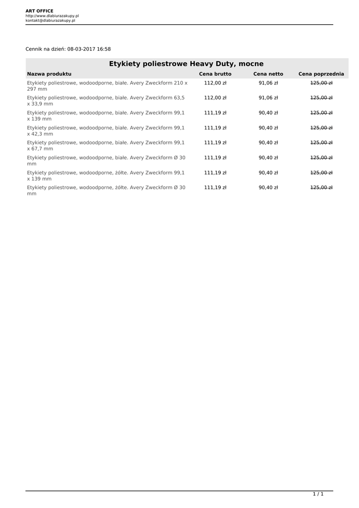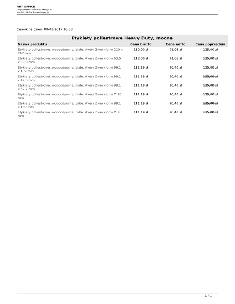 ART OFFICE http://www.dlabiurazakupy.pl [email protected] Cennik na dzień: 08-03-2017 16:58 Etykiety poliestrowe Heavy Duty, mocne Nazwa produktu Cena brutto Cena netto Cena poprzednia Etykiety poliestrowe, wodoodporne, białe. Avery Zweckform 210 x 297 mm 112,00 zł 91,06 zł 125,00 zł Etykiety poliestrowe, wodoodporne, białe. Avery Zweckform 63,5 x 33,9 mm 112,00 zł 91,06 zł 125,00 zł Etykiety poliestrowe, wodoodporne, białe. Avery Zweckform 99,1 x 139 mm 111,19 zł 90,40 zł 125,00 zł Etykiety poliestrowe, wodoodporne, białe. Avery Zweckform 99,1 x 42,3 mm 111,19 zł 90,40 zł 125,00 zł Etykiety poliestrowe, wodoodporne, białe. Avery Zweckform 99,1 x 67,7 mm 111,19 zł 90,40 zł 125,00 zł Etykiety poliestrowe, wodoodporne, białe. Avery Zweckform Ø 30 mm 111,19 zł 90,40 zł 125,00 zł Etykiety poliestrowe, wodoodporne, żółte. Avery Zweckform 99,1 x 139 mm 111,19 zł 90,40 zł 125,00 zł Etykiety poliestrowe, wodoodporne, żółte. Avery Zweckform Ø 30 mm 111,19 zł 90,40 zł 125,00 zł 1/1 Powered by TCPDF (www.tcpdf.org)