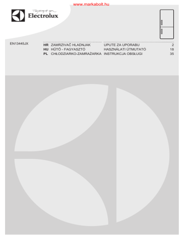www.markabolt.hu EN13445JX HR ZAMRZIVAČ HLADNJAK UPUTE ZA UPORABU HU HŰTŐ - FAGYASZTÓ HASZNÁLATI ÚTMUTATÓ PL CHŁODZIARKO-ZAMRAŻARKA INSTRUKCJA OBSŁUGI 2 18 35 www.markabolt.hu 2 www.electrolux.com SADRŽAJ 1. INFORMACIJE O SIGURNOSTI........................................................................ 3 2. SIGURNOSNE UPUTE...................................................................................... 4 3. OPIS PROIZVODA............................................................................................. 6 4. RAD UREĐAJA.................................................................................................. 7 5. SVAKODNEVNA UPORABA..............................................................................7 6. SAVJETI............................................................................................................. 9 7. ČIŠĆENJE I ODRŽAVANJE.............................................................................11 8. RJEŠAVANJE PROBLEMA..............................................................................12 9. POSTAVLJANJE.............................................................................................. 14 10. TEHNIČKI PODACI........................................................................................ 16 MISLIMO NA VAS Hvala vam što ste kupili Electrolux uređaj. Izabrali ste proizvod koji sa sobom donosi desetljeća profesionalnog iskustva i inovacija. Domišljat i elegantan, projektiran je misleći na vas. Stoga, uvijek kada ga koristite, možete biti sigurni znajući da ćete svaki put dobiti izvrsne rezultate. Dobrodošli u Electrolux. Posjetite našu internetsku stranicu za: Dobivanje savjeta o korištenju, prospekata, rješavanju problema, servisnim informacija: www.electrolux.com Registriranje vašeg proizvoda za bolji servis: www.registerelectrolux.com Kupovinu dodatne opreme, potrošnog materijala i originalnih rezervnih dijelova za vaš uređaj: www.electrolux.com/shop BRIGA O KUPCIMA I SERVIS Preporučujemo uporabu originalnih rezervnih dijelova. Prilikom kontaktiranja ovlaštenog servisnog centra, provjerite da su vam dostupni sljedeći podaci: Model, PNC, serijski broj. Informacije možete pronaći na nazivnoj pločici. Upozorenje / Oprez - sigurnosne informacije Opće informacije i savjeti Ekološke informacije Zadržava se pravo na izmjene. www.markabolt.hu HRVATSKI 1. 3 INFORMACIJE O SIGURNOSTI Prije postavljanja i korištenja uređaja, pažljivo pročitajte isporučene upute. Proizvođač nije odgovoran ako nepravilno postavljanje i uporaba uređaja uzrokuje ozljede i oštećenja. Upute uvijek čuvajte s uređajem, za buduće potrebe. 1.1 Sigurnost djece i slabijih osoba • • • • Ovaj uređaj mogu koristiti djeca od 8 godina pa na više i osobe smanjenih tjelesnih, osjetilnih ili mentalnih mogućnosti ili osobe koje ne raspolažu iskustvom ili znanjem ako su pod nadzorom osobe odgovorne za njihovu sigurnost i rade po uputama koje se odnose na sigurno korištenje uređaja te razumiju uključene opasnosti. Ne dozvolite djeci da se igraju s uređajem. Čišćenje i održavanje uređaja ne smiju obavljati djeca bez nadzora. Svu ambalažu čuvajte izvan dohvata djece. 1.2 Opća sigurnost • • • • • Ovaj uređaj namijenjen je za upotrebu u kućanstvu i za slične namjene kao što su: – Farme, čajne kuhinje koje upotrebljavaju zaposleni u prodavaonicama, uredima i drugim radnim prostorima – Klijenti hotela, motela, bed&breakfast ustanova i drugih vrsta smještaja Ventilacijski otvori na kućištu uređaja ili ugradbenom elementu ne smiju biti blokirani. Ne koristite mehaničke uređaje ili druga sredstva za ubrzavanje postupka odmrzavanja osim onih koje preporučuje proizvođač. Pazite da ne oštetite sustav hlađenja. Ne koristite električne uređaje u odjeljcima za čuvanje namirnica ako nisu preporučeni od strane proizvođača. www.markabolt.hu 4 www.electrolux.com • • • • Za čišćenje uređaja ne koristite raspršivanje vode i pare. Uređaj očistite vlažnom mekom krpom. Koristite isključivo neutralni deterdžent. Nikada ne koristite abrazivna sredstva, jastučiće za ribanje, otapala ili metalne predmete. U ovaj uređaj ne spremajte eksplozivna sredstva, poput limenki spreja sa zapaljivim punjenjem. Ako je kabel za napajanje oštećen, proizvođač ili ovlašteni serviser ili osoba sličnih kvalifikacija mora ga zamijeniti kako bi se izbjegla opasnost. 2. SIGURNOSNE UPUTE 2.1 Postavljanje UPOZORENJE! Samo kvalificirana osoba smije postaviti ovaj uređaj. • • • • • • • • • • • Odstranite svu ambalažu Ne postavljajte i ne koristite oštećeni uređaj. Pridržavajte se uputa za instalaciju isporučenih s uređajem. Budite pažljivi kada pomičete uređaj jer je težak. Obavezno nosite zaštitne rukavice. Provjerite može li zrak kružiti oko uređaja. Pričekajte najmanje 4 sata prije priključivanja uređaja na električno napajanje. Na taj način se omogućuje povrat ulja u kompresor. Uređaj ne postavljajte u blizini radijatora, štednjaka, pećnica ili ploča za kuhanje. Stražnji dio uređaja mora biti postavljen uz zid. Uređaj ne postavljajte na direktno sunčevo svjetlo. Ne postavljajte ovaj uređaj na prevlažna i prehladna mjesta, poput gradilišta, garaža ili vinskih podruma. Prilikom pomicanja kućišta podignite prednji kraj kako biste izbjegli ogrebotine na podu. 2.2 Spajanje na električnu mrežu UPOZORENJE! Opasnost od požara i strujnog udara. • • • • • • • • • Uređaj mora biti uzemljen. Sva spajanja na električnu mrežu treba izvršiti kvalificirani električar. Provjerite podudaraju li se električni podaci na nazivnoj pločici s električnim napajanjem. Ako to nije slučaj, kontaktirajte električara. Uvijek koristite pravilno ugrađenu utičnicu sa zaštitom od strujnog udara. Ne koristite adaptere s više utičnica i produžne kabele. Pazite da ne oštetite električne komponente (npr