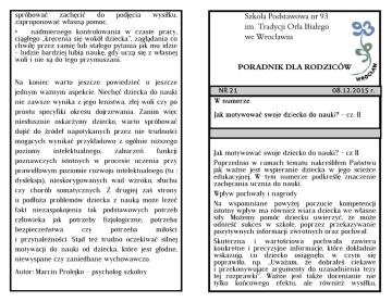 spr óbowa? zach?ci? do podj?cia wysi?ku, zapr oponowa? w?asn? pomoc, nadmier nego kontr olowania w czasie pr acy, ci?g?ego ?kr ?cenia si? wokó? dziecka?, zagl?dania co chwil? pr zez r ami? lub sta?ego pytania jak mu idzie ? ludzie bar dziej lubi? nauk?, gdy ucz? si? z w?asnej woli i nie s? do tego pr zymuszani. Szko?a Podstawowa nr 93 im. Tradycji O r?a Bia?ego we Wroc?awiu POR A D N I K D LA ROD Z I CÓW Na koniec war to jeszcze powiedzie? o jeszcze jednym wa?nym aspekcie. Niech?? dziecka do nauki nie zawsze wynika z jego lenistwa, z?ej woli czy po pr ostu specyfiki okr esu dojr zewania. Zanim wi?c nies?usznie oskar ?ymy dziecko, war to spr óbowa? doj?? do ?r óde? napotykanych pr zez nie tr udno?ci mog?cych wynika? pr zyk?adowo z ogólnie ni?szego poziomy intelektualnego, zabur ze? funkcji poznawczych istotnych w pr ocesie uczenia pr zy pr awid?owym poziomie r ozwoju intelektualnego (tu : dysleksja), nieskor ygowanych wad wzr oku, s?uchu czy chor ób somatycznych. Z dr ugiej za? str ony u pod?o?a pr oblemów dziecka z nauk? mo?e le?e? fakt niezaspokojenia tak podstawowych potr zeb cz?owieka jak potr zeby fizjologiczne, potr zeba bezpiecze?stwa czy potr zeba mi?o?ci i pr zynale?no?ci. St?d te? tr udno oczekiwa? silnej motywacji do nauki od dziecka, któr e jest g?odne, niewyspane czy zaniedbane wychowawczo. Autor : Mar cin Pr olejko ? psycholog szkolny NR 21 08.12.2015 r. W numer ze Jak motywowa? swoje dziecko do nauki? - cz. II Jak motywowa? swoje dziecko do nauki? - cz II Popr zednio w r amach tematu nakr e?li?em Pa?stwu jak wa?ne jest wspier anie dziecka w jego scie?ce edukacyjnej. W tym numer ze podkr e?l? znaczenie zach?cania ucznia do nauki. Wp?yw pochwa?y i nagr ody Na wspomniane powy?ej poczucie kompetencji istotny wp?yw ma r ównie? wiar a dziecka we w?asne si?y. Mo?emy pomóc dziecku uwier zy?, ?e mo?e odnie?? sukces w szkole, popr zez pr zekazywanie pozytywnych infor macji zwr otnych or az pochwa?. Skuteczna i war to?ciowa pochwa?a zawier a konkr etne i pr ecyzyjne infor macje, któr e dok?adnie wskazuj?, co dziecko osi?gn??o, w czym si? popr awi?o, np. ?Uwa?am, ?e dobr a?e? ciekawe i pr zekonywuj?ce ar gumenty do uzasadnienia tezy tej r ozpr awki?. Wa?ne jest tak?e docenianie nie tylko ko?cowego efektu, ale r ównie? wysi?ku, wytr wa?o?ci jak? dziecko wykaza?o podczas wykonywania zadania (?Widz?, ze bar dzo si? star a?e? i w?o?y?e? du?o wysi?ku w pr zygotowanie tego pr ojektu?). Wiar ? we w?asne si?y mo?emy wzmocni? w dziecku tak?e popr zez : odwo?ywanie si? do wcze?niejszych, pozytywnych do?wiadcze? dziecka, np. sytuacji gdy por adzi?o si? pr ostsz? wer sj? aktualnego zadania, pr zypominanie o tym, co ju? wie i potr afi, wyr a?ne komunikowanie, ?e wier zymy w dziecko (wspar cie emocjonalne) Pr zy wyr a?aniu pochwa? nale?y z kolei unika?: nieszczer ych pochwa? tylko po to by dziecko poczu?o si? lepiej, zbyt cz?stego chwalenia, komunikatów spr awiaj?cych, ?e dziecko b?dzie czu?o si? kontr olowane lub manipulowane, np. ?Dobr ze, zr obi?e? dok?adnie to co chcia?am? ogólnikowych zwr otów w stylu:? Dobr a r obota?, ??wietnie ci posz?o!? Nagr ody cho? same w sobie nie s? z?e, to jednak nagminne nagr adzanie dziecka za to ?e si? uczy mo?e spowodowa? zanik zainter esowania nauk?, r zeczywist? ch?? zdobycia wiedzy czy umiej?tno?ci ? dziecko b?dzie uczy?o si? tylko w celu zdobycia nagr ody, a nie dlatego ?e mu zale?y by dowiedzie? si? czego? nowego. Ponadto pr zekupstwa mog? spowodowa? os?abienie samodzielno?ci dziecka, spr awiaj?c, i? czuje si? kontr olowane pr zez osob? nagr adzaj?c?. Nagr ody nale?y stosowa? spor adycznie i z umiar em, je?li zawiod? ju? wszelkie sposoby nak?onienia dziecka do nauki. Szczególnie du?? war to?? maj? nagr ody podkr e?laj?ce kompetencje dziecka ? cer tyfikaty, oznaki lub takie, któr e spr zyjaj? wzbudzaniu zainter esowania nauk? ? ciekawy edukacyjny pr ogr am komputer owy, nowa ksi??ka, wy?cie na wystaw?. Wa?ne jest natomiast, by zapr zesta? nagr adzania, za co? co dziecko i tak ju? inter esuje lub co lubi wykonywa? z w?asnej woli. Zachowania i postawy r odziców wp?ywaj?ce negatywnie na motywacj? dziecka do nauki. Mówi?c o czynnikach war unkuj?cych motywacj? dziecka do nauki, war to sobie u?wiadomi?, i? niektór e z naszych postaw i zachowa? mog? wp?ywa? negatywnie na stosunek dzieci do nauki. W zwi?zku z tym powinni?my unika? : gr o?enia i oskar ?ania , np. ?Je?li nie zabier zesz si? do nauki, po?a?ujesz?, wyr a?ania negatywnego podej?cia do nauki w szkole. np. ? A kto powiedzia? ze nauka musi by? zabawna ??, ?Matematyka jest nudna, ale musisz niestety pr zez ni? pr zebr n???, komentar zy, pr zedstawiaj?cych nasz? osob? jako wzór negatywny : ?Ja tez nigdy nie umia?em matematyki? ? takie wyznania mog? stanowi? dla dziecka dobr ? wymówk?, por ównywania mniej zdolnego dziecka z r odze?stwem, posiadania wygór owanych oczekiwa?, nieadekwatnych do faktycznych mo?liwo?ci dziecka ? niemo?no?? spr ostania naszym ambicjom mo?e wp?dzi? dziecko w fr ustr acj?, poczucie winy i pog??bi? niech?? do nauki, zapr zeczania na si?? i mówienia, ?e zadanie jest bar dzo ?atwe, w sytuacji gdy dziecko twier dzi, ?e co? jest dla niego zbyt tr udne ? lepiej wyr azi? wtedy zr ozumienie dla tr udno?ci dziecka,