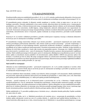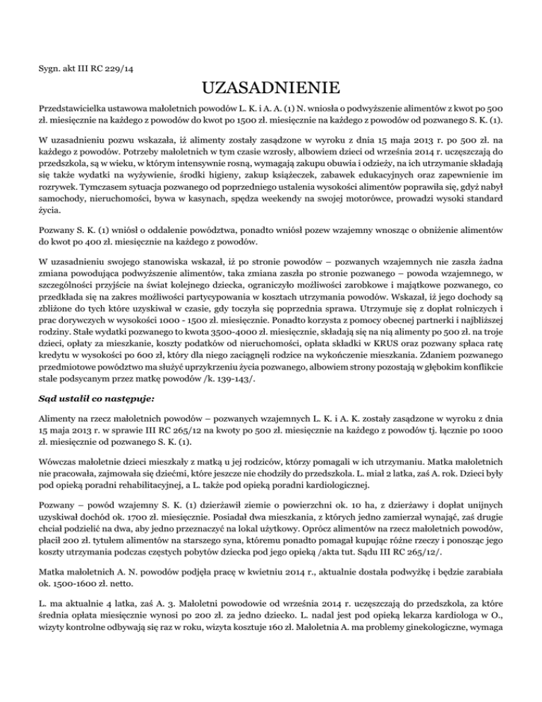 Sygn. akt III RC 229/14 UZASADNIENIE Przedstawicielka ustawowa małoletnich powodów L. K. i A. A. (1) N. wniosła o podwyższenie alimentów z kwot po 500 zł. miesięcznie na każdego z powodów do kwot po 1500 zł. miesięcznie na każdego z powodów od pozwanego S. K. (1). W uzasadnieniu pozwu wskazała, iż alimenty zostały zasądzone w wyroku z dnia 15 maja 2013 r. po 500 zł. na każdego z powodów. Potrzeby małoletnich w tym czasie wzrosły, albowiem dzieci od września 2014 r. uczęszczają do przedszkola, są w wieku, w którym intensywnie rosną, wymagają zakupu obuwia i odzieży, na ich utrzymanie składają się także wydatki na wyżywienie, środki higieny, zakup książeczek, zabawek edukacyjnych oraz zapewnienie im rozrywek. Tymczasem sytuacja pozwanego od poprzedniego ustalenia wysokości alimentów poprawiła się, gdyż nabył samochody, nieruchomości, bywa w kasynach, spędza weekendy na swojej motorówce, prowadzi wysoki standard życia. Pozwany S. K. (1) wniósł o oddalenie powództwa, ponadto wniósł pozew wzajemny wnosząc o obniżenie alimentów do kwot po 400 zł. miesięcznie na każdego z powodów. W uzasadnieniu swojego stanowiska wskazał, iż po stronie powodów – pozwanych wzajemnych nie zaszła żadna zmiana powodująca podwyższenie alimentów, taka zmiana zaszła po stronie pozwanego – powoda wzajemnego, w szczególności przyjście na świat kolejnego dziecka, ograniczyło możliwości zarobkowe i majątkowe pozwanego, co przedkłada się na zakres możliwości partycypowania w kosztach utrzymania powodów. Wskazał, iż jego dochody są zbliżone do tych które uzyskiwał w czasie, gdy toczyła się poprzednia sprawa. Utrzymuje się z dopłat rolniczych i prac dorywczych w wysokości 1000 - 1500 zł. miesięcznie. Ponadto korzysta z pomocy obecnej partnerki i najbliższej rodziny. Stałe wydatki pozwanego to kwota 3500-4000 zł. miesięcznie, składają się na nią alimenty po 500 zł. na troje dzieci, opłaty za mieszkanie, koszty podatków od nieruchomości, opłata składki w KRUS oraz pozwany spłaca ratę kredytu w wysokości po 600 zł, który dla niego zaciągnęli rodzice na wykończenie mieszkania. Zdaniem pozwanego przedmiotowe powództwo ma służyć uprzykrzeniu życia pozwanego, albowiem strony pozostają w głębokim konflikcie stale podsycanym przez matkę powodów /k. 139-143/. Sąd ustalił co następuje: Alimenty na rzecz małoletnich powodów – pozwanych wzajemnych L. K. i A. K. zostały zasądzone w wyroku z dnia 15 maja 2013 r. w sprawie III RC 265/12 na kwoty po 500 zł. miesięcznie na każdego z powodów tj. łącznie po 1000 zł. miesięcznie od pozwanego S. K. (1). Wówczas małoletnie dzieci mieszkały z matką u jej rodziców, którzy pomagali w ich utrzymaniu. Matka małoletnich nie pracowała, zajmowała się dziećmi, które jeszcze nie chodziły do przedszkola. L. miał 2 latka, zaś A. rok. Dzieci były pod opieką poradni rehabilitacyjnej, a L. także pod opieką poradni kardiologicznej. Pozwany – powód wzajemny S. K. (1) dzierżawił ziemie o powierzchni ok. 10 ha, z dzierżawy i dopłat unijnych uzyskiwał dochód ok. 1700 zł. miesięcznie. Posiadał dwa mieszkania, z których jedno zamierzał wynająć, zaś drugie chciał podzielić na dwa, aby jedno przeznaczyć na lokal użytkowy. Oprócz alimentów na rzecz małoletnich powodów, płacił 200 zł. tytułem alimentów na starszego syna, któremu ponadto pomagał kupując różne rzeczy i ponosząc jego koszty utrzymania podczas częstych pobytów dziecka pod jego opieką /akta tut. Sądu III RC 265/12/. Matka małoletnich A. N. powodów podjęła pracę w kwietniu 2014 r., aktualnie dostała podwyżkę i będzie zarabiała ok. 1500-1600 zł. netto. L. ma aktualnie 4 latka, zaś A. 3. Małoletni powodowie od września 2014 r. uczęszczają do przedszkola, za które średnia opłata miesięcznie wynosi po 200 zł. za jedno dziecko. L. nadal jest pod opieką lekarza kardiologa w O., wizyty kontrolne odbywają się raz w roku, wizyta kosztuje 160 zł. Małoletnia A. ma problemy ginekologiczne, wymaga stosowania maści i odpowiednich płynów do higieny intymnej. Dzieci w ostatnim roku w związku z pójściem do przedszkola dużo chorowały na choroby wieku dziecięcego. Nadal matka z powodami mieszka u swoich rodziców, z którymi prowadzi wspólne gospodarstwo domowe, rodzice A. N. pomagają w jej utrzymaniu oraz w utrzymaniu dzieci, przekazują około 3 tyś miesięcznie na ich utrzymanie. Ojciec przedstawicielki ustawowej małoletnich pracuje w przedsiębiorstwie wodociągowym, gdzie zarabia ok. 3 tyś zł. miesięcznie oraz ma prywatną klinikę weterynaryjną, zaś jej matka pracuje w szkole, gdzie zarabia ok. 1700 zł. miesięcznie. Rodzice A. N. ponoszą koszty opłat za dom i raty pożyczek w łącznej wysokości 2400 zł. miesięcznie. A. N. jest właścicielką samochodu O. (...) z 2007 r., udział w nieruchomości w N. gm. S. sprzedała pozwanemu / dowód: wyjaśnienia przedstawicielki ustawowej małoletnich powodów A. N. k. 528-529, zeznania świadka Z. N. k. 527v-528, wydruki z ksiąg wieczystych k. 11-15, 18-27, odpisy aktów urodzenia k. 7, 8, zaświadczenia lekarskie k. 16-17, zawiadomienia komornicze k. 29-31, faktury k. 32-119, 498- 524, wydruki z Internetu k. 491-497, 544-547, 557-559, zwolnienia lekarskie, zaśw. lekarskie i faktury za leki k. 586-611/. Pozwany S. K. (1) nadal korzysta z dopłat unijnych, w łącznej wysokości ok. 7 tyś. zł. rocznie. Opłaca ubezpieczenie w KRUS w wysokości 520 zł co kwartał. Ponadto aktualnie podejmuje prace dorywcze u swojego szwagra przy montażu mebli, z tych prac osiąga miesięcznie zarobki w wysokości ok. 500 zł. Z wynajmu mieszkania na ul. (...) uzyskuje kwotę 500 zł. miesięcznie. Mieszkanie na ul. (...) oraz jedno z mieszkań na ul. (...) pozwany sprzedał, zaś pieniądze przeznaczył na zakup mieszkania na ul. (...), w którym aktualnie mieszka ze swoją obecną partnerką