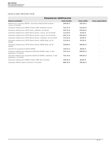 ART OFFICE http://www.dlabiurazakupy.pl [email protected] Cennik na dzień: 08-03-2017 16:58 Zszywacze elektryczne Nazwa produktu Cena brutto Cena netto Cena poprzednia Elektryczny zszywacz REXEL i dziurkacz Polaris1420 srebrnoczarny 14 kartek 248,46 zł 202,00 zł - Zszywacz elektryczny RAPID Fixativ 20EX 20kartek Czarny 153,75 zł 125,00 zł - Zszywacz elektryczny LEITZ duży, niebieski, 20 kartek 301,35 zł 245,00 zł - Zszywacz elektryczny LEITZ Nexxt Series, czarny, do 10 kartek 111,93 zł 91,00 zł - Zszywacz elektryczny LEITZ Nexxt Series, czarny, do 20 kartek 324,72 zł 264,00 zł - Zszywacz elektryczny LEITZ Nexxt Series, niebieski, do 10 kartek 113,16 zł 92,00 zł - Zszywacz elektryczny LEITZ Nexxt Series, WOW biały, do 10 kartek 113,16 zł 92,00 zł - Zszywacz elektryczny LEITZ Nexxt Series, WOW biały, do 20 kartek 319,80 zł 260,00 zł - Zszywki do zszywacza 5025e RAPID 120,54 zł 98,00 zł - Zszywacz elektryczny Supreme 5025e EU RAPID, biały, 2 lata gwarancji, 25 kartek 725,70 zł 590,00 zł - Zszywacz elektryczny Supreme 5025e EU RAPID, niebieski, 2 lata gwarancji, 25 kartek 725,70 zł 590,00 zł - Zszywacz elektryczny RAPID Fixativ 10BX do 10 kartek 104,55 zł 85,00 zł - Zszywacz REXEL Stella 70 Electric 70 kartek 966,78 zł 786,00 zł - 1/1 Powered by TCPDF (www.tcpdf.org)