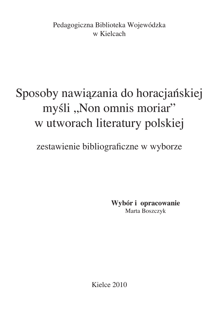 Pedagogiczna Biblioteka Wojewódzka w Kielcach Sposoby nawiązania do horacjańskiej myśli „Non omnis moriar” w utworach literatury polskiej zestawienie bibliograficzne w wyborze Wybór i opracowanie Marta Boszczyk Kielce 2010 2 Literatura podmiotu 1. Kochanowski, Jan : Pieśni / Jan Kochanowski ; oprac. Ludwika Szczerbicka-Ślęk. – Wyd.4 zmien. – Wrocław : Zakład Narodowy im. Ossolińskich, 1998. – S. 88-89 : „Pieśń XXIV” Sygn. 224334 Czytelnia 2. Miłosz, Czesław : Wiersze. T. 3 / Czesław Miłosz. – Kraków : „Znak” : Wydawnictwo Literackie, 2003. – S. 168-173 : „Oskarżyciel” Sygn. 236499 Czytelnia 3. Przerwa-Tetmajer, Kazimierz : „Evviva l`arte” // W : Panorama literatury polskiej XX wieku. T. 1, Poezja / wybór i oprac. Karl Dedecius ; [wstępem opatrzył Jan Zieliński]. – Warszawa : Noir sur Blanc, 2001. – S. 44 Sygn. 242218 Czytelnia 4. Staff, Leopold : „Ostatni z mego pokolenia” // W : Od Staffa do Wojaczka : poezja polska 1939-1988 : antologia T. 1 / [wybór] Bohdan Drozdowski, Bohdan Urbankowski ; [noty o aut. oprac. Wiesława Kruszka, Agnieszka Rapacka-Furtek.. – Łódź : Wydaw. Łódzkie, 1991. – S. 39 Sygn. 211143 Czytelnia 5. Szymborska, Wisława : Poezje / Wisława Szymborska ; przedm. Jerzy Kwiatkowski. – Warszawa : Państwowy Instytut Wydawniczy, 1977. – S. 85 : „Wieczór autorski” ; S. 86 : „Nagrobek” Sygn. 132684-132685 Wypożyczalnia 6. Tuwim, Julian : Wiersze wybrane / Julian Tuwim ; oprac. Michał Głowiński. – Wydanie 3 zm. – Wrocław : Zakład Narodowy im. Ossolińskich, 1973. – S. 136-137 : „Do losu” Sygn. 97861 Czytelnia 3 Literatura przedmiotu Zagadnienia ogólne 7. Bukowiec, Paweł : 150 tematów maturalnych : motywy, wątki, problemy / Paweł Bukowiec. – Kraków : „Znak”, 2000. – S. 127-129 : Nieśmiertelność Sygn. 229854 Czytelnia 8. Lisiecka, Zofia : Starożytność : materiały edukacyjne / Zofia Lisiecka. – Białystok : „Elan”, 2001. – S. 393-394 : Horacy Sygn. 239132 Czytelnia 9. Mackiewicz, Antoni : Z historii motywu „exegi monumentum” w poezji polskiej // W : Literatura i dzieje : o procesie historyczno-literackim w edukacji szkolnej : materiały sesji naukowej zorganizowanej przez Oddział Doskonalenia Nauczycieli dnia 10-11 XII 1982 we Wrocławiu i 15 I 1983 w Wałbrzychu / pod red. Mieczysława Inglota ; Instytut Doskonalenia Nauczycieli im. Władysława Spasowskiego w Warszawie. Oddział Doskonalenia Nauczycieli we Wrocławiu. – Wrocław : IKN.ODN, 1983. – S. 33-61 Sygn. 168856 Czytelnia 10. Wojtysiak, Jacek : W cieniu śmierci / Jacek Wojtysiak // „Zeszyty Szkolne”. – 2005, nr 1, s. 82-85 [Dwie strategie podejścia do czekającej na wszystkich śmierci. Pierwsza z nich wyraża wezwanie z „Pieśni Horacego”: carpe diem (chwytaj dzień), druga non omnis moriar (nie wszystek umrę)] Kochanowski Pieśń XXIV (Księgi wtóre) 11. Borowski, Andrzej : Literatura polska i powszechna : starożytność - oświecenie : podręcznik dla klasy 1 liceum ogólnokształcącego, liceum profilowanego, technikum : zakres podstawowy i rozszerzony / Andrzej Borowski. – Kraków : Wydaw. Literackie, 2002. – S. 224-225 : Pieśń XXIV Sygn. : 233659 Czytelnia 4 12. Dziurowa, Krystyna : Język polski : literatura w motywach / Krystyna Dziurowa. – Warszawa : Kram, 2004. – S. 25-26 Sygn. 239068 Czytelnia 13. Korniłłowicz, Norbert : Melancholia w „Pieśni XXIV” Jana Kochanowskiego / Norbert Karniłłowicz // „Ruch Literacki”. – 1997, nr 6, s. 883892 14. Pecl, Janusz : Kochanowski : szczyt renesansu w literaturze polskiej / Janusz Pelc. – Warszawa : Wydawnictwo Naukowe PWN, 2001. – S. 288-289, 459-460 Sygn. 235018 Czytelnia Sygn. 235019 Wypożyczalnia 15. Pietrzyk, Dariusz : Opracowania lektur i wierszy : liceum / Dariusz Pietrzyk, Rychlicki Robert, Anna Marzec. – Kraków : „Greg”, 2004/2005. – S. 353 Sygn. 239000 podr. Czytelnia Miłosz Czesław „Oskarżyciel” 16. Poznawanie Miłosza : studia i szkice o twórczości poety / pod red. nauk. Jerzego Kwiatkowskiego. – Kraków ; Wrocław : Wydawnictwo Literackie, 1985. – S. 224-227 : „Oskarżyciel” Sygn. 180597 Czytelnia Sygn. 180598-180599 Wypożyczalnia Przerwa-Tetmajer Kazimierz „Evviva L`arte” 17. Nowacka, Teresa : Co potrzeba do matury z języka polskiego / Teresa Nowacka. – Warszawa : Verbum, 2005. – S. 173 - 180 : Kazimierz Przerwa-Tetmajer - wybór wierszy Sygn. 240216 podr. Czytelnia 5 18. Białek , Małgorzata : Jak analizować i interpretować wiersze? : poradnik dla maturzystów / Małgorzata Białek. – Warszawa : Telbit , 2007. – S. 141 : Kazimierz Przerwa-Tetmajer - „Evviva l’arte!” Sygn. 243410 Czytelnia Sygn. 243411 Wypozyczalnia 19. Jakóbczyk, Jan : Z młodopolskim artystą na przekór mieszczaństwu („Evviva l`arte K. Przerwy-Tetmajera) // W : Poezja polska : interpretacje / pod red. Krystyny Heskiej-Kwaśniewicz i Bogdana Zelera . – Katowice : Książnica, 2000. – S. 171-173 Sygn. 228055 Czytelnia Sygn. 228056 Wypożyczalnia 20. Pietrzyk, Dariusz : Opracowania lektur i wierszy : liceum / Dariusz Pietrzyk, Rychlicki Robert, Anna Marzec. – Kraków : „Greg”, 2004/2005. – S. 385 Sygn. 239000 podr. Czytelnia Staff Leopold „Ostatni z mego pokolenia” 21. Adamiec, Marek : Czytamy polskie wiersze współczesne / Marek Adamiec. – Gdańsk : Harmonia, 1997. – 16-22 Sygn. 223550 Czytelnia 22. Białek, Małgorzata : Jak analizować i interpretować wiersze? : poradnik dla maturzystów / Małgorzata Białek. – Warszawa : Telbit, 2007. – S. 162 : Leopold Staff - [„Ostatni z mego pokolenia”] Sygn. 243410 Czytelnia Sygn. 243411 Wypożyczalnia 23. Kosyra-Cieślak, Teresa : Poeci o swym życiu, twórczości i pośmiertnej sławie. Dokonaj analizy i interpretacji porównawczej wierszy : Juliana Tuwima „Do losu” oraz Leopolda Staffa „Ostatni z mego pokolenia...” // W : Wiek XX : przewodnik dla licealistów : cz.1 / pod red. Ka