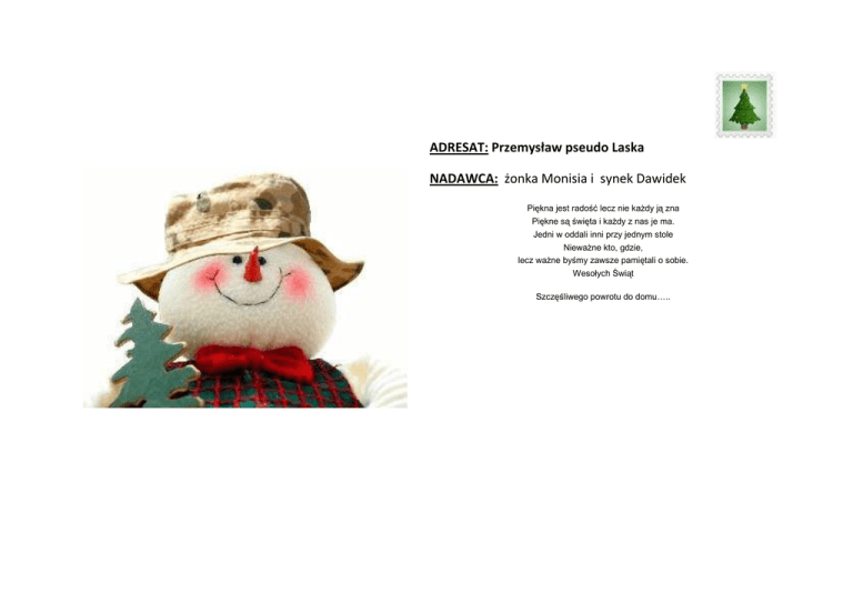 ADRESAT: Przemysław pseudo Laska NADAWCA: żonka Monisia i synek Dawidek Piękna jest radość lecz nie kaŜdy ją zna Piękne są święta i kaŜdy z nas je ma. Jedni w oddali inni przy jednym stole NiewaŜne kto, gdzie, lecz waŜne byśmy zawsze pamiętali o sobie. Wesołych Świąt Szczęśliwego powrotu do domu…..