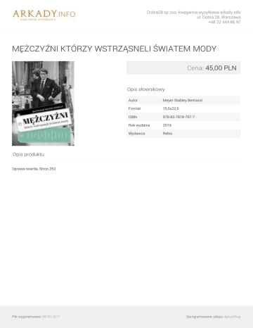 Dobra28 sp zoo. księgarnia wysyłkowa arkady.info ul. Dobra 28, Warszawa +48 22 444 86 97 MĘŻCZYŹNI KTÓRZY WSTRZĄSNELI ŚWIATEM MODY Cena: 45,00 PLN Opis słownikowy Autor Meyer-Stabley Bertrand Format 15,5x22,5 ISBN 978-83-7818-767-7 Rok wydania 2016 Wydawca Rebis Opis produktu Oprawa twarda, Stron 352 Plik wygenerowano: 08-03-2017 Powered by TCPDF (www.tcpdf.org) Oprogramowanie sklepu: AptusShop