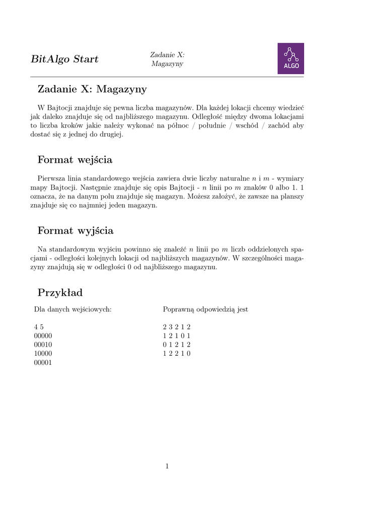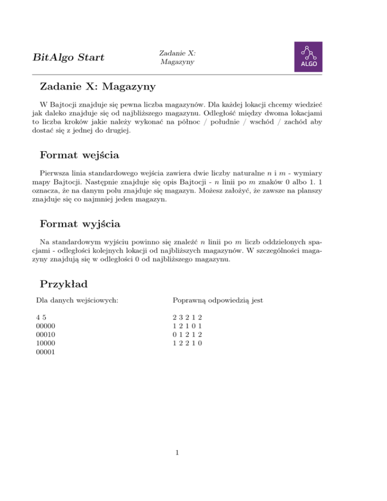 BitAlgo Start Zadanie X: Magazyny Zadanie X: Magazyny W Bajtocji znajduje się pewna liczba magazynów. Dla każdej lokacji chcemy wiedzieć jak daleko znajduje się od najbliższego magazynu. Odległość między dwoma lokacjami to liczba kroków jakie należy wykonać na północ / południe / wschód / zachód aby dostać się z jednej do drugiej. Format wejścia Pierwsza linia standardowego wejścia zawiera dwie liczby naturalne n i m - wymiary mapy Bajtocji. Następnie znajduje się opis Bajtocji - n linii po m znaków 0 albo 1. 1 oznacza, że na danym polu znajduje się magazyn. Możesz założyć, że zawsze na planszy znajduje się co najmniej jeden magazyn. Format wyjścia Na standardowym wyjściu powinno się znaleźć n linii po m liczb oddzielonych spacjami - odległości kolejnych lokacji od najbliższych magazynów. W szczególności magazyny znajdują się w odległości 0 od najbliższego magazynu. Przykład Dla danych wejściowych: Poprawną odpowiedzią jest 45 00000 00010 10000 00001 2 1 0 1 3 2 1 2 1 2 1 2 2 1 0 1 1 2 1 2 0