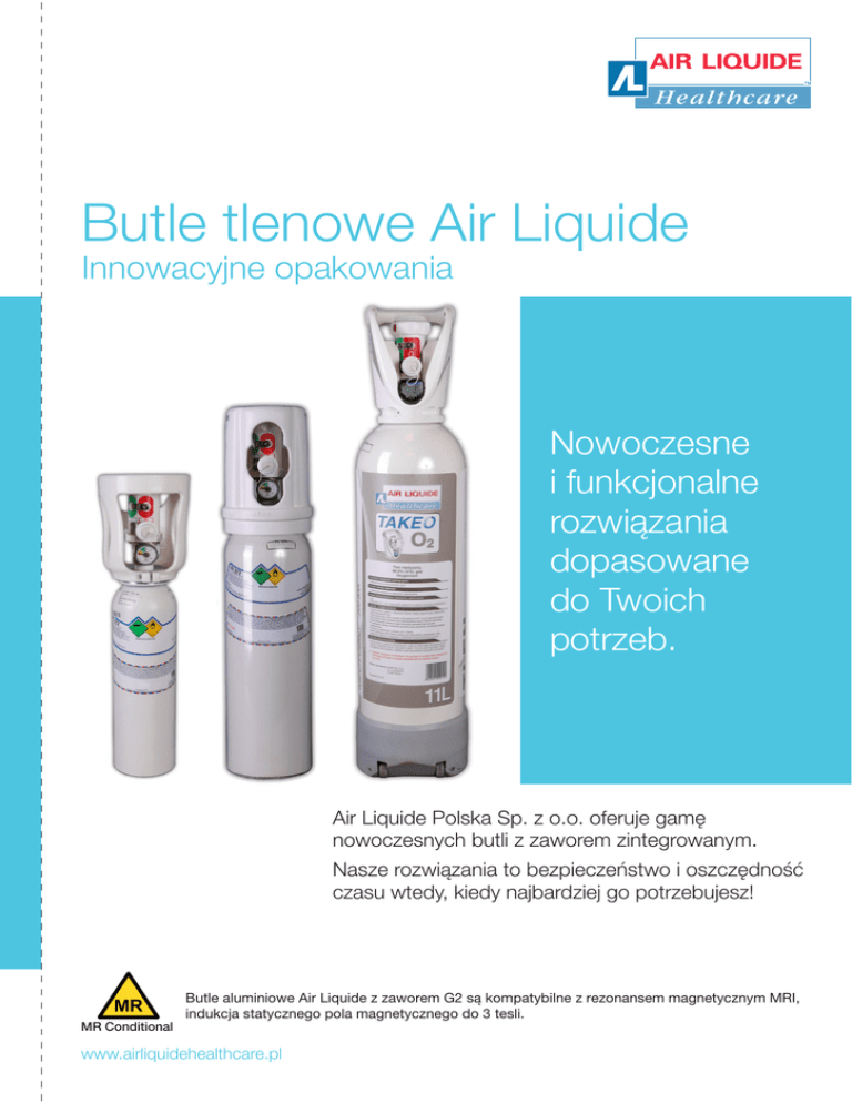 Butle tlenowe Air Liquide Innowacyjne opakowania Nowoczesne i funkcjonalne rozwiązania dopasowane do Twoich potrzeb. Air Liquide Polska Sp. z o.o. oferuje gamę nowoczesnych butli z zaworem zintegrowanym. Nasze rozwiązania to bezpieczeństwo i oszczędność czasu wtedy, kiedy najbardziej go potrzebujesz! MR Conditional Butle aluminiowe Air Liquide z zaworem G2 są kompatybilne z rezonansem magnetycznym MRI, indukcja statycznego pola magnetycznego do 3 tesli. www.airliquidehealthcare.pl Poznaj nasze rozwiązania! TAKEO™, PRESENCE™ i RESPIREO to: ● lekkie butle wykonane z bardzo wytrzymałego aluminium, ● wyposażone na stałe w bezpieczny zawór zintegrowany G2, reduktor oraz przepływomierz, przez co korzystanie z gazu jest jeszcze szybsze i wygodniejsze, ● 10 poziomów ustawień przepływu od 0 do 15 L/min, ● bezpośrednie podłączenie kaniuli z wąsami lub maską, ● pobór tlenu poprzez gniazdo ciśnienia AGA lub DIN ze stałym zredukowanym ciśnieniem nominalnym 5 bar, ● wszystkie przyłącza oraz wskaźniki znajdują się w jednej linii, z przodu dla wygody użytkownika i przejrzystości odczytów. Takie ułożenie ułatwia prawidłowe podłączenie przewodów podających gaz do pacjenta i zapewnia czytelność odczytu wskaźników. RESPIREO ● ● ● ● oznaczenie 3 stref barwnych na manometrze – czytelny wskaźnik ilości gazu, kompaktowa butla o pojemności 2L, dopasowana do przenośnych respiratorów, średnica butli 102 mm. PRESENCE™ ● ● ● ● ● oznaczenie 3 stref barwnych na manometrze – czytelny wskaźnik ilości gazu, praktyczny uchwyt do powieszenia na poręczy łóżka, ergonomiczna rączka ułatwiająca przenoszenie, dostępne w trzech różnych pojemnościach: 2L, 5L, 11L, butla B11 oryginalnie wyposażona w kółka ułatwiające transport. TAKEO™ ● ● ● ● ● ● ● wyposażone w wyjątkowy system z inteligentnym rozpoznawaniem czasu TIPI™, miękki w dotyku, ergonomiczny, zaokrąglony uchwyt, specjalnie zaprojektowany kołpak zapobiegający toczeniu się butli, konstrukcja kołpaka ułatwiająca czyszczenie, praktyczny hak do bezpiecznego powieszenia przy łóżku, dostępne w trzech różnych pojemnościach: 2L, 5L, 11L, butla B11 oryginalnie wyposażona w kółka ułatwiające transport. AIR LIQUIDE POLSKA Sp. z o.o., ul. J. Conrada 63, 31-357 Kraków tel.: +48 12 627 93 00, fax.: +48 12 627 93 33, e-mail: [email protected]