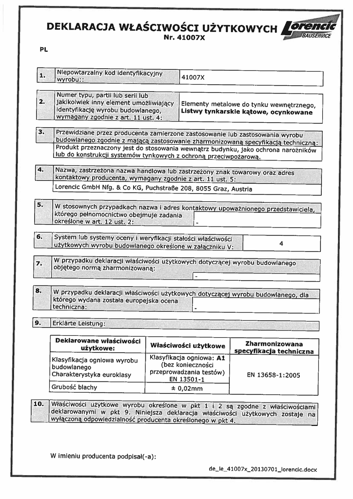 DEKLARACJA WLA~CIWOkI U±YTKOWYcH Lo~e11cIc Nr. 41007X BAUSERVICE PL ~ Niepowtarzalny kod identyflkacyjny wyrobu:: 41007X Numer typu, partil lub serii lub jakikolwiek inny element umo±Iiwiajftcy identyflkacj~ wyrobu budowlanego, ‘magany zgodnie z art. 11 ust. 4: Elementy metalowe do tynku wewn~trznego, Listwy tynkarskie k4towe, ocynkowane 3. Przewidziane przez producenta zamierzone zastosowanie lub zastosowanla wyrobu budowlanego zgodnie z majpc4 zastosowanle zharmonizowanp specyflkacj4 technicznp: Produkt przeznaczony jest do stosowania wewnfttrz budynku, jako ochrona naro±nik6w lub do konstrukcjj systemäw tynkowych z ochron~ przeciwpo±arowp. 4. Nazwa, zastrze±ona nazwa handlowa lub zastrze±ony znak towarowy oraz adres kontaktowy producenta, wymagany zgodnie z art. 11 ust. 5: Lorencic GmbH Nfg. & Co KG, Puchstraße 208, 8055 Graz, Austria 5. W stosownych przypadkach nazwa i adres kontaktowy upowa±nionego przedstawicieja, kt6rego petnomocnictwo obejmuje zadania okre~Ione w art. 12 ust. 2: - 6. System lub systemy oceny i weryfikacji stato&i wta≤ciwoki u±ytkowych wyrobu budowlanego okreglone w zalpcznjku V: 7 W przypadku deklaracji wta&iwoki u±ytkowych dotyczftcej wyrobu budowlanego obj~tego norm~ zharmonizowanft: ~ 8. 4 w przypadku deklaracji wta~ciwoki u±ytkowych dotyczpcej wyrobu budowlanego, dIa~ kt6rego wydana zostata europejska ocena techniczna: - j 9. Erklärte Leistung: Deklarowane wta&jwo&j uzytkowe: Wta&iwofrj utytkowe Klasyflkacja ogniowa wyrobu Klasyfikacja ogniowa: Al (bez konieczno~cj Charaktery~tyka euroklasy P~p . . ~ Grubo~ blachy 10. iat~5t0¼‘) * Zharmonizowana specytikacja techniczna EN 13658-1:2005 0,O2mm Wta&iwoki u±ytkowe wyrobu okre~lone w pkt 1 i 2 s~ zgodne z wta~ciwo&iamFj deklarowanymi w pkt 9. Niniejsza deklaracja wta&iwoki u±ytkowych zostaje na wytpczon4 odpowIedzialno~ producenta okre~Ionego w pkt 4. W imieniu producenta podpisat(-a) de_Ie_4lOO7x2ol3o7olIorencjc.doa DEKLARACJA WLA~CIWO~CI U2YTKOWYCH Nr. LORENCI P0 Mag. :11 Lorencic GmbH Nfg. & Co KG KA Sp. z 0.0. Ii M-tt Mag. Elisab-th Mattulik (E Graz, 01.07.2013 CE de_Ie_41007x_2Ol3o7ollorencjc. docx