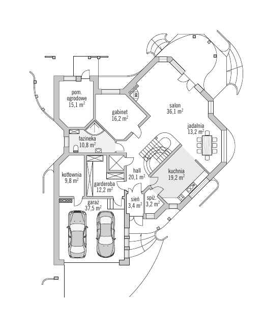 pom. ogrodowe 15,1 m2 salon 36,1 m2 gabinet 16,2 m2 jadalnia 13,2 m2 łazineka 10,8 m2 kotłownia 9,8 m2 hall 20,1 m2 garderoba 12,2 m2 garaż 37,5 m2 sień spiż. 2 3,4 m2 3,2 m kuchnia 19,2 m2