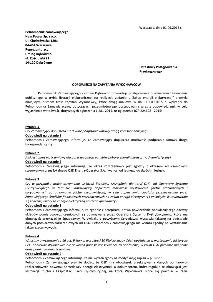 Warszawa, dnia 01.09.2015 r. Pełnomocnik Zamawiającego New Power Sp. z o.o. Ul. Chełmżyńska 180a 04-464 Warszawa Reprezentujący Gminę Dąbrówno ul. Kościuszki 21 14-120 Dąbrówno Uczestnicy Postępowania Przetargowego ODPOWIEDZI NA ZAPYTANIA WYKONAWCÓW Pełnomocnik Zamawiającego - Gminy Dąbrówno prowadząc postępowanie o udzieleniu zamówienia publicznego w trybie licytacji elektronicznej na realizację zadania: „ Zakup energii elektrycznej” przesyła niniejszym pismem treść zapytań Wykonawcy, które drogą mailową w dniu 01.09.2015 r. wpłynęły do Pełnomocnika Zamawiającego, dotyczących przedmiotowego postępowania wraz z odpowiedziami, w celu wyjaśnienia wątpliwości dotyczących ogłoszenia L-281-2015, nr ogłoszenia BZP 224698 - 2015; Pytanie 1 Czy Zamawiający dopuszcza możliwość podpisania umowy drogą korespondencyjną? Odpowiedź na pytanie 1 Pełnomocnik Zamawiającego informuje, że Zamawiający dopuszcza możliwość podpisania umowy drogą korespondencyjną Pytanie 2 Jaki jest okres rozliczeniowy dla poszczególnych punktów poboru energii miesięczny, dwumiesięczny? Odpowiedź na pytanie 2 Pełnomocnik Zamawiającego informuje, że okres rozliczeniowy jest zgodny z okresem rozliczeniowym stosowanym przez lokalnego OSD Energa-Operator S.A. i wynosi od jednego do dwóch miesięcy. Pytanie 3 Czy w przypadku braku otrzymania wskazań liczników szczególnie dla taryf C1X od Operatora Systemu Dystrybucyjnego w terminie Zamawiający dopuszcza możliwość wystawienia faktur szacunkowych ( korygowanych po otrzymaniu faktur rzeczywistych), w celu zapewnienia ciągłości przekazywania przez Zamawiającego środków finansowych przeznaczonych na zakup energii elektrycznej i uniknięcia skumulowania się znacznej kwoty za energię elektryczną na rzecz Sprzedawcy? Odpowiedź na pytanie 3 Pełnomocnik Zamawiającego informuje, że zgodnie z przepisami prawa powszechnie obowiązującego odczyty układów pomiarowo-rozliczeniowych są dokonywane przez Operatora Systemu Dystrybucyjnego, który ma obowiązek przekazać je Sprzedawcy. W związku z powyższym Sprzedawca wystawia fakturę na podstawie danych pomiarowo-rozliczeniowych od OSD. Pełnomocnik Zamawiającego nie wyraża zgodny na wystawianie faktur szacunkowych. Pytanie 4 Wnosimy o wykreślenie z §6 ust. 9 kary w wysokości 10 PLN za każdy dzień opóźnienia w wystawieniu faktury za PPE, ponieważ Wykonawca nie powinien ponosić konsekwencji za opóźnienie, w jakim OSD przekaże mu pełne dane pomiarowo-rozliczeniowe. Odpowiedź na pytanie 4 Pełnomocnik Zamawiającego informuje, że nie wyraża zgody na modyfikację zapisu w § 6 ust. 9. Pełnomocnik Zamawiajacego pragnie dodać, że OSD ma obowiązek przekazywania danych pomiaroworozliczeniowych nowemu sprzedawcy energii elektrycznej, a dokumentem, który reguluje te obowiązki jest Instrukcja Ruchu i Eksploatacji Sieci Dystrybucyjnej, na którą Wykonawca może się powołać w razie 1 nieprzestrzegania instrukcji przez OSD. Jeżeli Wykonawca pomimo starań nie otrzyma odczytów od OSD, i tym samym nie będzie mógł wystawić faktury zgodnie z terminem umownym, kara umowna nie zostanie naliczona. Wykonawca będzie jednak zobowiązany udowodnić na piśmie Zamawiającemu, iż nie mógł pozyskać danych i rzeczywiście nie wystawił faktury nie z własnej winy. W związku z powyższym zapis § 6 ust. 9 Projektu umowy pozostaje bez zmian. Pytanie 5 Wnosimy o wykreślenie z projektu umowy z §11 ust. 3, ponieważ wszystkie niezbędne dane do przeprowadzenia procesu zmiany sprzedawcy powinny być podane przez Zamawiającego. Odpowiedź na pytanie 5 Pełnomocnik Zamawiającego informuje, że na podstawie § 11 pkt. 3 Wykonawca nie jest zobligowany do pozyskania danych niezbędnych do zgłoszenia zmiany sprzedawcy, gdyż otrzyma je od Pełnomocnika Zamawiającego. Wykonawca, aby skutecznie przeprowadzić zmianę sprzedawcy zobowiązany jest natomiast do kontaktu z OSD chociażby w kwestii negatywnych weryfikacji punktów poboru. Mając wiedze, iż w obrębie któregokolwiek punktu poboru występują negatywne weryfikacje, Wykonawca zobligowany jest do niezwłocznego przekazania takiej informacji Zamawiającemu, aby ten mógł na bieżąco wyjaśniać nieprawidłowości. Zapis §11 ust. 3 pozostaje bez zmian. Pytanie 6 Wnosimy o ustalenie ekwiwalentnej kary za odstąpienie od umowy z winy Zamawiającego? Odpowiedź na pytanie 6 Pełnomocnik Zamawiającego informuje, iż nie wyraża zgody na ustalenie ekwiwalentnej kary za odstąpienie od umowy z winy Zamawiającego. /-/Ewa Pacek Pełnomocnik Zamawiającego 2