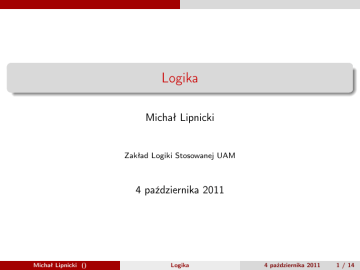 Logika Michał Lipnicki Zakład Logiki Stosowanej UAM 4 października 2011 Michał Lipnicki () Logika 4 października 2011 1 / 14 Wprowadzenie ogólne Co to takiego „logika” Zdroworozsądkowe wprowadzenie W codziennym życiu na pewno nieraz zdarzyło się Państwu użyć wyrażenia „logika”, „logiczny”, np. „Kobiety są bardziej logiczne od mężczyzn” „Logika władzy to kłamstwa i represje” „To co Pan mówi jest całkowicie nielogiczne” W jakim znaczeniu w powyższych przykładach użyty został termin „logika”? Potoczne rozumienie terminu logika nie do końca jest tożsame z technicznym, naukowym znaczeniem terminu LOGIKA. Michał Lipnicki () Logika 4 października 2011 2 / 14 Wprowadzenie ogólne Co to takiego „logika” Garść definicji Wręcz przeciwnie — ciągnął Tweedledee — jeżeli tak było, to mogło być, a gdyby tak było, to by było; ale skoro tak nie jest, to nie jest. To jest logiczne. (L. Carroll, Alicja po drugiej stronie lustra) Logika — to analiza języka i czynności badawczych (rozumowanie (wnioskowanie), definiowanie, klasyfikowanie, itd.) w celu podania takich reguł posługiwania się językiem i wykonywania owych czynności, które uczyniły by tę działalność jak najbardziej skuteczną. (Mała encyklopedia logiki) Logika jest systematycznym badaniem prawd logicznych. Natomiast zdanie jest logicznie prawdziwe, jeżeli każde zdanie mające jego strukturę gramatyczną jest prawdziwe. (W. O. Quine, Filozofia logiki) Michał Lipnicki () Logika 4 października 2011 3 / 14 Paradoksy Paradoksy Paradoks — (sofizmat, antynomia) pozornie poprawne rozumowanie prowadzące do sprzeczności lub do konkluzji nie zgodnych z doświadczeniem. Achilles i żółw — Przypuśćmy, że Achillesa dzieli od żółwia 100 m i Achilles biegnie 100 razy szybciej niż żółw. Kiedy Achilles przebiegnie 100 m, żółw przejdzie jeden metr; kiedy Achilles przebiegnie 1 m, żółw przesunie się o jeden centymetr, itd. Zatem Achilles nigdy nie dogoni żółwia. Michał Lipnicki () Logika 4 października 2011 4 / 14 Paradoksy Paradoksy wzrokowe Niemożliwy trójkąt przestrzenny Michał Lipnicki () Niekończące się schody Logika 4 października 2011 5 / 14 Paradoksy Paradoksy Paradoks Protagorasa. Protagoras zgodził się przyjąć ucznia bez opłaty pod warunkiem, że gdy ten wygra swoją pierwszą sprawę, to zapłaci Protagorasowi pewną sumę. Uczeń co prawda ukończył naukę, ale nie występował w żadnym procesie. Po pewnym czasie Protagoras zaskarżył go do sądu o zapłatę. Jak wyglądałyby argumenty stron? Michał Lipnicki () Logika 4 października 2011 6 / 14 Wprowadzenie szczegółowe Problematyka logiczna Zadaniem logiki jest dostarczanie wiadomości, które pozwalają na sprawdzenie poprawności przeprowadzonych przez nas wnioskowań. Wnioskowanie — to proces myślowy polegający na uzasadnianiu na podstawie pewnych zdań (przesłanek) innego zdania (wniosku). Wnioskowanie opiera się na założeniu, że między przesłankami a wnioskiem zachodzi stosunek wynikania logicznego (o którym jeszcze wiele sobie powiemy). Wnioskowanie w odróżnieniu od obserwacji jest uzasadnieniem pośrednim. Uwaga! Badanie wnioskowania nie jest analizą zjawisk psychicznych! Michał Lipnicki () Logika 4 października 2011 7 / 14 Wprowadzenie szczegółowe Wnioskowanie Wnioskowanie niezawodne Jeżeli wniosek wynika logicznie z przesłanek i przesłanki są prawdziwe, to i wniosek jest prawdziwy. Czyli badając wnioskowania na gruncie logiki ogranicza się do badania, czy między przesłankami a wnioskiem zachodzi stosunek wynikania logicznego. Każdy, kto żyje z cudzego nieszczęścia jest łajdakiem. Każdy lekarz żyje z cudzego nieszczęścia. A zatem każdy lekarz jest łajdakiem. We współczesnej logice można wyróżnić trzy grupy problemowe: logika formalna, której zgłębianiu poświęcimy bieżący rok akademicki 2010/2011; semiotyka logiczna; metodologia nauk. Michał Lipnicki () Logika 4 października 2011 8 / 14 Wprowadzenie szczegółowe Logiczna teoria języka Pojęcie języka Język — system znaków służący do przekazywania myśli, bądź informacji (Malinowski, Logika ogólna). Wyróżniamy języki: naturalne; sztuczne; mieszane. Podstawowe elementy języka: Słownik — zasób słów danego języka; Wyrażenia — słowa oraz ich konfiguracje budowane zgodnie z regułami składni danego języka; Reguły składniowe — określają w jaki sposób z wyrażeń prostych tworzyć złożone; Reguły semantyczne — określają przedmioty, do których odnosi się dane wyrażenie. Michał Lipnicki () Logika 4 października 2011 9 / 14 Wprowadzenie szczegółowe Logiczna teoria języka Język przedmiotowy i metajęzyk Wyrażenia języka przedmiotowego odnoszą się do rzeczywistości pozajęzykowej. Natomiast wyrażenia metajęzyka opisują rzeczywistość językową. Metajęzyk danego języka przedmiotowego zazwyczaj jest ten sam język. Uwaga! Każde stwierdzenie fałszywości jakiegoś zdania jest wypowiedzią metajęzykową. Paradoks kłamcy: To zdanie jest fałszywe. Paradoksalność powyższego zdania wynika właśnie z pomieszania dwóch poziomów języka — języka przedmiotowego z metajęzykiem. Michał Lipnicki () Logika 4 października 2011 10 / 14 Wprowadzenie szczegółowe Logiczna teoria języka Zagadka Jedno z często spotykanych sformułowań paradoksu kłamcy brzmi: Pewien Kreteńczyk powiedział, że wszyscy Kreteńczycy kłamią. Pytania: Czym różni się to sformułowanie od poprzedniego? Czy nadal jest to paradoks? Michał Lipnicki () Logika 4 października 2011 11 / 14 Wprowadzenie szczegółowe Logiczna teoria języka Kategorie składniowe Wyrażenia językowe można podzielić na: sensowne — zbudowane zgodnie z regułami składniowymi; bezsensowne — nie zbudowane zgodnie z regułami składniowymi. Mówimy, że wyrażenia należą do tej samej kategorii składniowej (syntaktycznej), jeżeli zastęp