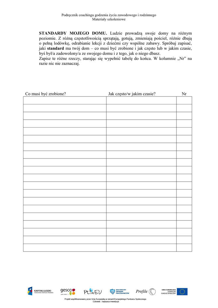 Podręcznik coachingu godzenia życia zawodowego i rodzinnego Materiały szkoleniowe STANDARDY MOJEGO DOMU. Ludzie prowadzą swoje domy na różnym poziomie. Z różną częstotliwością sprzątają, gotują, zmieniają pościel, różnie dbają o pełną lodówkę, odrabianie lekcji z dziećmi czy wspólne zabawy. Spróbuj zapisać, jaki standard ma twój dom – co musi być zrobione i jak często lub w jakim czasie, byś był/a zadowolony/a ze swojego domu i z tego, jak o niego dbasz. Zapisz te różne rzeczy, starając się wypełnić tabelę do końca. W kolumnie „Nr” na razie nic nie zaznaczaj. Co musi być zrobione? Jak często/w jakim czasie? Nr Podręcznik coachingu godzenia życia zawodowego i rodzinnego Materiały szkoleniowe A teraz zastanów się – jak to może wyglądać inaczej? Czego może być więcej lub co może być robione częściej, a czego może być mniej lub może dziać się rzadziej? Z czego na pewno i zdecydowanie nie możesz i nie chcesz zrezygnować? Przy tej czynności postaw w kolumnie „Nr”: 1. Z czego mógłbyś/mogłabyś zrezygnować tylko na jakiś czas – np. na parę miesięcy, na rok? Przy tej czynności postaw w kolumnie „Nr”: 2. A z czego mógłbyś/mogłabyś zrezygnować w zasadzie na dłużej? Przy tej czynności postaw w kolumnie „Nr”: 3. Jeśli w Twojej kolumnie „Nr” zdecydowanie przeważają jedynki, wypełnij tę kolumnę jeszcze raz, ale zaznacz jedynką tylko 10 rzeczy, dwójką – 5 rzeczy i trójką – także 5 rzeczy. Porozmawiaj ze swoim partnerem/partnerką, domownikami – jak widzą standardy waszego domu? ZANOTUJ: Co mogę zmienić w prowadzeniu mojego domu, by zmniejszyć ilość pracy w nim wykonywanej? Które standardy mogę obniżyć?