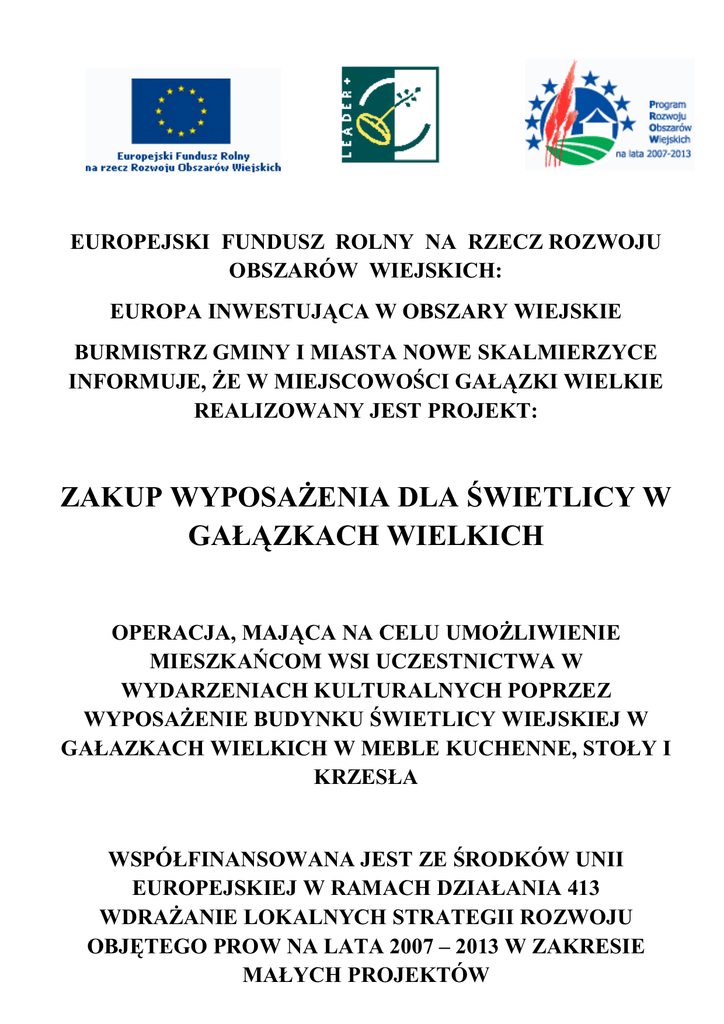 EUROPEJSKI FUNDUSZ ROLNY NA RZECZ ROZWOJU OBSZARÓW WIEJSKICH: EUROPA INWESTUJ¥CA W OBSZARY WIEJSKIE BURMISTRZ GMINY I MIASTA NOWE SKALMIERZYCE INFORMUJE, ÝE W MIEJSCOWOÚCI GA£¥ZKI WIELKIE REALIZOWANY JEST PROJEKT: ZAKUP WYPOSAÝENIA DLA ÚWIETLICY W GA£¥ZKACH WIELKICH OPERACJA, MAJ¥CA NA CELU UMOÝLIWIENIE MIESZKAÑCOM WSI UCZESTNICTWA W WYDARZENIACH KULTURALNYCH POPRZEZ WYPOSAÝENIE BUDYNKU ÚWIETLICY WIEJSKIEJ W GA£AZKACH WIELKICH W MEBLE KUCHENNE, STO£Y I KRZES£A WSPÓ£FINANSOWANA JEST ZE ÚRODKÓW UNII EUROPEJSKIEJ W RAMACH DZIA£ANIA 413 WDRAÝANIE LOKALNYCH STRATEGII ROZWOJU OBJÆTEGO PROW NA LATA 2007 – 2013 W ZAKRESIE MA£YCH PROJEKTÓW