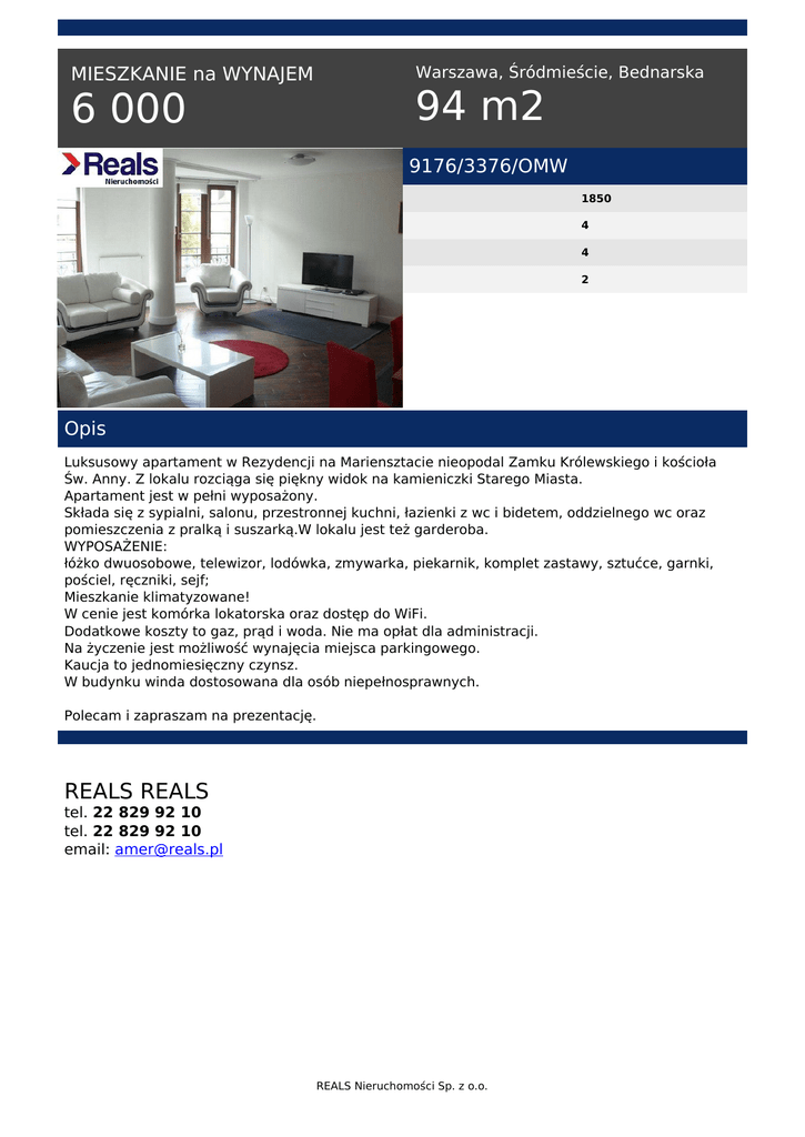 MIESZKANIE na WYNAJEM 6 000 Warszawa, Śródmieście, Bednarska 94 m2 9176/3376/OMW 1850 4 4 2 Opis Luksusowy apartament w Rezydencji na Mariensztacie nieopodal Zamku Królewskiego i kościoła Św. Anny. Z lokalu rozciąga się piękny widok na kamieniczki Starego Miasta. Apartament jest w pełni wyposażony. Składa się z sypialni, salonu, przestronnej kuchni, łazienki z wc i bidetem, oddzielnego wc oraz pomieszczenia z pralką i suszarką.W lokalu jest też garderoba. WYPOSAŻENIE: łóżko dwuosobowe, telewizor, lodówka, zmywarka, piekarnik, komplet zastawy, sztućce, garnki, pościel, ręczniki, sejf; Mieszkanie klimatyzowane! W cenie jest komórka lokatorska oraz dostęp do WiFi. Dodatkowe koszty to gaz, prąd i woda. Nie ma opłat dla administracji. Na życzenie jest możliwość wynajęcia miejsca parkingowego. Kaucja to jednomiesięczny czynsz. W budynku winda dostosowana dla osób niepełnosprawnych. Polecam i zapraszam na prezentację. REALS REALS tel. 22 829 92 10 tel. 22 829 92 10 email: [email protected] REALS Nieruchomości Sp. z o.o. Powered by TCPDF (www.tcpdf.org)