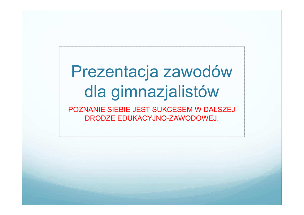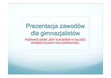 Prezentacja zawodów dla gimnazjalistów POZNANIE SIEBIE JEST SUKCESEM W DALSZEJ DRODZE EDUKACYJNO-ZAWODOWEJ. Gimnazjalisto. Cukiernik CUKIERNIK MĄKI BIERZE PARĘ DEKA I SŁODKOŚCI Z NIEJ WYPIEKA. PIECZE TORTY, PĄCZKI ,BABY Z LUKRU, KREMU ,CZEKOLADY. CZASEM ROBI TEŻ CUKIERKICZEKOLADKI CZY KARMELKI. Z CUKRU TWORZY ISTNE CUDA, KAŻDY DESER MU SIĘ UDA . Dziennikarz DZIENNIKARZ TO OD NIEGO SIĘ DOWIECIE, CO ZDARZYŁO SIĘ NA ŚWIECIEZ RADIA ALBO Z TELEWIZJI NA ANTENIE LUB NA WIZJI. Z MIKROFONEM CZĘSTO STAJE INNYM PYTAŃ STO ZADAJE. W CZASOPIŚMIE LUB GAZECIE JEGO TEKSTY ODNAJDZIECIE . Sędzia SĘDZIA SIEDZI W SĄDZIE W CZARNEJ TODZE, I PRZESTĘPCÓW KARZE SRODZE. OSKARŻENI, ZGODNIE Z PRAWEM, JUŻ CZEKAJĄ NA ROZPRAWĘ. TEN, KTO POSTĘPUJE ŹLE, Z KARY NIE WYWINIE SIĘ, KTO MA DOWÓD NIEWINNOŚCI, TEN SIĘ ZNAJDZIE NA WOLNOŚCI. Malarz MALARZ PRZY SZTALUGACH GO ZNAJDZIECIE FARBY MIESZA NA PALECIE. A RODZAJÓW MA ICH WIELESĄ OLEJNE , AKWARELE… WYBÓR PĘDZLI MA TEŻ WIELKIMAŁY ,DUŻY, GRUBY, CIENKI. OBRAZ NIMI NAMALUJE, KTÓRY PÓZNIEJ KTOŚ KUPUJE. Piosenkarka PIOSENKARKA Z MIKROFONEM WYSTĘPUJE, GDY NA SCENIE KONCERTUJE. NA WYSTĘPACH, KTÓRE DAJE, PRZED PUBLIKĄ WIELKĄ STAJE. MA PIOSENKI ROZMAITE, CZASEM NAGRA JE NA PŁYTĘ. A W JEJ GŁOSIE WIERNI FANI SĄ PO PROSTU ZAKOCHANI. Weterynarz WETERYNARZ LECZY WSZYSTKIE CZWORONOGI, TE CO MAJĄ ŁAPY, ROGI. OPATRUJE SKRZYDŁA PTASIE, GDYŻ NA ZDROWIU ZWIERZĄT ZNA SIĘ. Z SIERŚCI TEŻ PRZEGONI PCHŁY, ABY BUREK NIE BYŁ ZŁY. Listonosz LISTONOSZ SETKI LISTÓW, MAŁE PACZKI, NOSI W TORBIE PRZEPEŁNIONEJ, NA RAMIENIU ZAWIESZONEJ. RANO Z POCZTY JE ZABIERA, WPROST DO SKRZYNKI TWEJ DOCIERA. ADRES BOWIEM MA PODANY, NA PRZESYŁCE NAPISANY.