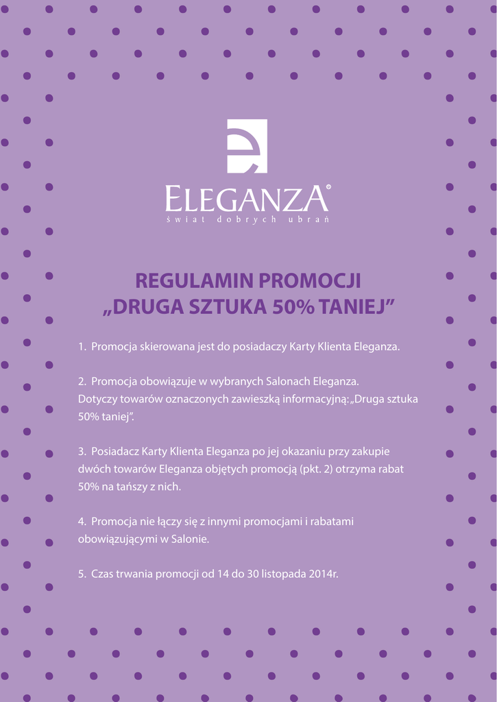 REGULAMIN PROMOCJI „DRUGA SZTUKA 50% TANIEJ” 1. Promocja skierowana jest do posiadaczy Karty Klienta Eleganza. 2. Promocja obowiązuje w wybranych Salonach Eleganza. Dotyczy towarów oznaczonych zawieszką informacyjną: „Druga sztuka 50% taniej”. 3. Posiadacz Karty Klienta Eleganza po jej okazaniu przy zakupie dwóch towarów Eleganza objętych promocją (pkt. 2) otrzyma rabat 50% na tańszy z nich. 4. Promocja nie łączy się z innymi promocjami i rabatami obowiązującymi w Salonie. 5. Czas trwania promocji od 14 do 30 listopada 2014r.