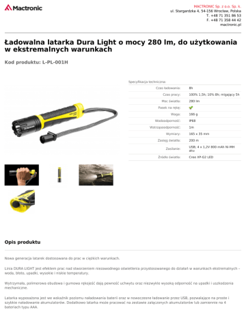 MACTRONIC Sp. z o.o. Sp. k. ul. Stargardzka 4, 54-156 Wrocław, Polska T. +48 71 351 86 53 F. +48 71 358 44 42 mactronic.pl Ładowalna latarka Dura Light o mocy 280 lm, do użytkowania w ekstremalnych warunkach Kod produktu: L-PL-001H Specyfikacja techniczna: Czas ładowania: Czas pracy: Moc światła: 8h 100% 1,5h; 10% 8h; migający 5h 280 lm Pasek na rękę: Waga: Wodoodporność: Wstrząsoodporność: Wymiary: Zasięg światła: Zasilanie: Źródło światła: 166 g IP68 1m 165 x 35 mm 200 m USB; 4 x 1,2V 800 mAh Ni-MH aku Cree XP-G2 LED Opis produktu Nowa generacja latarek dostosowana do prac w ciężkich warunkach. Linia DURA LIGHT jest efektem prac nad stworzeniem niezawodnego oświetlenia przystosowanego do działań w warunkach ekstremalnych – woda, błoto, upadki, wysokie i niskie temperatury. Wytrzymała, polimerowa obudowa i gumowa rękojeść dają pewność uchwytu oraz niezwykle wysoką odporność na upadki i uszkodzenia mechaniczne. Latarka wyposażona jest we wskaźnik poziomu naładowania baterii oraz w nowoczesne ładowanie przez USB, pozwalające na proste i szybkie naładowanie akumulatorów. Dodatkowo latarka może pracować na zestawie załączonych akumulatorów lub zamiennie na 4 bateriach typu AAA. Silne światło (280 lm i 500 lm), długi czas pracy oraz wysoka odporność (IP68) potwierdzone standardem ANSI czyni z latarek linii DURA LIGHT niezawodne światło w każdej sytuacji. Copyright ©2011 by Mactronic Sp. z o.o. S.k. All inclusive by pimago.pl