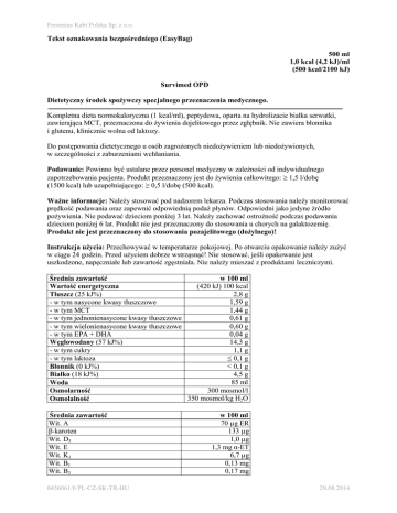 Fresenius Kabi Polska Sp. z o.o. Tekst oznakowania bezpośredniego (EasyBag) 500 ml 1,0 kcal (4,2 kJ)/ml (500 kcal/2100 kJ) Survimed OPD Dietetyczny środek spożywczy specjalnego przeznaczenia medycznego. Kompletna dieta normokaloryczna (1 kcal/ml), peptydowa, oparta na hydrolizacie białka serwatki, zawierająca MCT, przeznaczona do żywienia dojelitowego przez zgłębnik. Nie zawiera błonnika i glutenu, klinicznie wolna od laktozy. Do postępowania dietetycznego u osób zagrożonych niedożywieniem lub niedożywionych, w szczególności z zaburzeniami wchłaniania. Podawanie: Powinno być ustalane przez personel medyczny w zależności od indywidualnego zapotrzebowania pacjenta. Produkt przeznaczony jest do żywienia całkowitego: 1,5 l/dobę (1500 kcal) lub uzupełniającego: ≥ 0,5 l/dobę (500 kcal). Ważne informacje: Należy stosować pod nadzorem lekarza. Podczas stosowania należy monitorować prędkość podawania oraz zapewnić odpowiednią podaż płynów. Odpowiedni jako jedyne źródło pożywienia. Nie podawać dzieciom poniżej 3 lat. Należy zachować ostrożność podczas podawania dzieciom poniżej 6 lat. Produkt nie jest przeznaczony do stosowania u chorych na galaktozemię. Produkt nie jest przeznaczony do stosowania pozajelitowego (dożylnego)! Instrukcja użycia: Przechowywać w temperaturze pokojowej. Po otwarciu opakowanie należy zużyć w ciągu 24 godzin. Przed użyciem dobrze wstrząsnąć! Nie stosować, jeśli opakowanie jest uszkodzone, napęczniałe lub zawartość zgęstniała. Nie należy mieszać z produktami leczniczymi. Średnia zawartość w 100 ml (420 kJ) 100 kcal Wartość energetyczna Tłuszcz (25 kJ%) 2,8 g - w tym nasycone kwasy tłuszczowe 1,59 g - w tym MCT 1,44 g - w tym jednonienasycone kwasy tłuszczowe 0,61 g - w tym wielonienasycone kwasy tłuszczowe 0,60 g - w tym EPA + DHA 0,04 g Węglowodany (57 kJ%) 14,3 g - w tym cukry 1,1 g - w tym laktoza ≤ 0,1 g Błonnik (0 kJ%) < 0,1 g Białko (18 kJ%) 4,5 g 85 ml Woda 300 mosmol/l Osmolarność 350 mosmol/kg H2O Osmolalność Średnia zawartość Wit. A β-karoten Wit. D3 Wit. E Wit. K1 Wit. B1 Wit. B2 0456061/0 PL-CZ-SK-TR-HU w 100 ml 70 µg ER 133 µg 1,0 µg 1,3 mg α-ET 6,7 µg 0,13 mg 0,17 mg 29.08.2014 Fresenius Kabi Polska Sp. z o.o. Niacyna Wit. B6 Wit. B12 Kwas pantotenowy Biotyna Kwas foliowy Wit. C Cholina 1,6 mg EN 0,16 mg 0,27 µg 0,47 mg 5,0 µg 26,7 µg 8,0 mg 36,7 mg Średnia zawartość Sód (Na) Potas (K) Chlorki (Cl) Wapń (Ca) Magnez (Mg) Fosfor (P) Żelazo (Fe) Cynk (Zn) Miedź (Cu) Mangan (Mn) Jod (I) Fluorki (F) Chrom (Cr) Molibden (Mo) Selen (Se) w 100 ml 80 mg 200 mg 83 mg 65 mg 25 mg 48 mg 1,3 mg 1,2 mg 133 μg 0,27 mg 13,3 μg 0,13 mg 6,7 μg 10 μg 6,7 μg Skład: woda, maltodekstryna, hydrolizat białka serwatki, trójglicerydy o średniej długości łańcucha (MCT), oleje roślinne (olej rzepakowy, olej szafranowy), wodorofosforan dipotasu, cytrynian wapnia, olej rybny, chlorek sodu, stabilizatory (E 460, E 466), wit. C, chlorek choliny, tlenek magnezu, chlorek potasu, emulgator (E 472c), siarczan żelaza, siarczan cynku, niacyna, wit. E, chlorek manganu, kwas pantotenowy, siarczan miedzi, fluorek sodu, wit. B1, wit. B2, wit. B6, β-karoten, wit. A, kwas foliowy, chlorek chromu, molibdenian sodu, selenin sodu, biotyna, wit. K1, jodek potasu, wit. D3, wit. B12. Najlepiej spożyć przed końcem: data i numer partii na opakowaniu. [logo Fresenius Kabi] [na opakowaniu umieszczona jest skala, kod EAN oraz numer partii produkcyjnej] EasyBag Producent: Fresenius Kabi Deutschland GmbH D-61346 Bad Homburg/Niemcy www.fresenius-kabi.com Dystrybutor: Fresenius Kabi Polska Sp. z o.o. ul. Hrubieszowska 2 01-209 Warszawa 0456061/0 0456061/0 PL-CZ-SK-TR-HU 29.08.2014