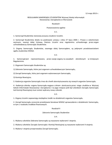 12 maja 2013 r. REGULAMIN SAMORZĄDU STUDENTÓW Wyższej Szkoły Informatyki Stosowanej i Zarządzania w Warszawie Rozdział I Postanowienia ogólne § 1. 1. Samorząd Studentów stanowią wszyscy studenci Uczelni. 2. Samorząd Studentów działa na podstawie ustawy z dnia 27 lipca 2005 r. Prawo o szkolnictwie wyższym, zwanej dalej Ustawą, Statutu Uczelni oraz regulaminu uchwalonego przez organ uchwałodawczy Samorządu Studentów. 3. Organy Samorządu Studentów, zwanego dalej Samorządem, są jedynymi przedstawicielami ogółu studentów WSISiZ. § 2. 1. Samorząd jest Regulaminie. reprezentowany przez swoje organy na zasadach określonych w niniejszym 2. Organami Samorządu Studentów są: 1) Zebranie Samorządu, które jest organem uchwałodawczym Samorządu, 2) Zarząd Samorządu, który jest organem wykonawczym Samorządu, 3) Komisja Rewizyjna. 3. Kadencja organów Samorządu trwa do chwili ukonstytuowania się nowych organów Samorządu. 4. Kadencja członka organu Samorządu wygasa z dniem ukończenia przez niego studiów w Wyższej Szkole Informatyki Stosowanej i Zarządzania i na jego miejsce jeśli był członkiem Zarządu Samorządu lub Komisji Rewizyjnej musi zostać wybrany nowy członek. § 3. 1. Organy Uczelni zapewniają niezbędne środki na działalność organów Samorządu. 2. Zarząd Samorządu corocznie przedstawia Senatowi WSISiZ sprawozdanie z działalności Samorządu, w tym z rozdziału środków finansowych. Rozdział II Zebranie Samorządu Studentów § 4. 1. Wybory członków Zebrania Samorządu są nazywane wyborami I stopnia. 2. Wybory członków Zarządu Samorządu i Komisji Rewizyjnej są nazywane wyborami II stopnia. 3. Wybory I stopnia przeprowadza Zarząd Samorządu. 4. Termin wyborów I stopnia ogłasza Zarząd Samorządu. Wybory I stopnia muszą zakończyć się do 15 stycznia w roku akademickim wyborów. 5. Wybory II stopnia odbywają się na pierwszym posiedzeniu nowo wybranego Zebrania Samorządu. Pierwsze posiedzenie nowo wybranego Zebrania Samorządu musi być zwołane przez ustępujący Zarząd Samorządu w ciągu 14 dni od daty zakończenia wyborów I stopnia. 6. Wybory I stopnia członków Zebrania Samorządu odbywają się według następujących zasad: 1) w wyborach biorą udział wszyscy studenci WSISiZ, przydzieleni do grup studenckich, 2) każda grupa studencka może członka Zebrania Samorządu, wybrać w głosowaniu jawnym 3) wybory w grupach studenckich organizują członkowie przedstawiciele Samorządu w organach kolegialnych WSISiZ, 4) wybory są organizowane w dniu, studenckiej. w którym ze swego organów grona jednego Samorządu odbywają się zajęcia dydaktyczne danej lub grupy 7. Wybory członków Zebrania Samorządu są ważne, jeśli w wyborach przeprowadzonych według zasad określonych w pkt. 6, zostało wybranych co najmniej 20 członków Zebrania Samorządu. W wypadku przeciwnym Zarząd Samorządu ogłasza i przeprowadza wybory uzupełniające w tych grupach studenckich, które nie wyłoniły swoich przedstawicieli, aż do osiągnięcia wymaganej liczby członków Zebrania Samorządu. § 5. 1. Do kompetencji Zebrania Samorządu należy: 1) Uzgadnianie z Senatem WSISiZ regulaminu studiów, 2) Uchwalanie Regulaminu Samorządu i jego zmian, 3) Uzgadnianie z Rektorem zmian w regulaminie stypendialnym 4) Powoływanie i odwoływanie przewodniczącego i członków Zarządu Samorządu, Komisji Rewizyjnej oraz Sądu Koleżeńskiego, 5) Powoływanie i odwoływanie przedstawicieli Samorządu do Senatu WSISiZ w liczbie określonej przez Statut WSISiZ i ustawie prawo o szkolnictwie wyższym, 6) Powoływanie i odwoływanie przedstawicieli Samorządu do Rad Wydziałów w liczbie określonej przez Statut WSISiZ ustawę prawo o szkolnictwie wyższym, 7) Powoływanie i odwoływanie przedstawicieli Samorządu do Rady Bibliotecznej, Komisji Dyscyplinarnej ds. studentów i Odwoławczej Komisji Dyscyplinarnej ds.studentów oraz przedstawiciela Samorządu do Komisji Dyscyplinarnej ds. nauczycieli akademickich, 8) Podejmowanie decyzji o podjęciu i formie akcji protestacyjnej, 9) Nadzór nad działalnością Zarządu Samorządu, 10) Uchylanie sprzecznych z prawem lub postanowieniami niniejszego Regulaminu decyzji organów Samorządu, 11) Rozpatrywanie wniosków Komisji Rewizyjnej 12) Wyrażanie opinii środowiska studenckiego i bronienie jego praw. § 6. 1. Zebranie Samorządu wybiera ze swego grona 5 członków Zarządu Samorządu, z przewodniczącym oraz 3 członków Komisji Rewizyjnej, w tym jej przewodniczącego. łącznie 2. Uchwały, opinie i zalecenia Zebrania Samorządu wymagają dla swej ważności uzyskania zwykłej większości w głosowaniu przy obecności, co najmniej połowy członków Zebrania Samorządu, poza przypadkami wymienionymi poniżej. 3. Uchwały dotyczące odwołania przewodniczącego Zarządu Samorządu, członków Zarządu Samorządu, członków Komisji Rewizyjnej, Sądu Koleżeńskiego, a także przedstawicieli do Senatu i Rad Wydziałów, zapadają większością 3/5 głosujących przy obecności co najmniej połowy członków Zebrania Samorządu. 4. Uchwały dotyczące zmiany niniejszego Regulaminu zapadają większością 2/3 wszystkich członków Zebrania lub jednogłośnie przez wszystkich członków Zarządu Samorządu Studentów. 5. Wszystkie pisemne wnioski wymagają poparcia przynajmniej 4 członków Zebrania Samorządu. § 7. 1. Posiedzenia Zebrania Samorządu zwołuje przewodniczący Zarządu Samorządu: 1) z własnej inicjatywy, 2) na wniosek przynajmniej 4 członków Zebrania, 3) na wniosek Komisji Rewizyjnej. 2. Posiedzenie musi odbyć się nie wcześniej niż 14 dni i nie później niż 28 dni od daty złożenia pisemnego wniosku o zwołanie posiedzenia Zebrania. 3. Posiedzenia Zebrania Samorządu musi odbywać się co najmniej 2 razy w roku. 4. Wszyscy członkowie Zebrania Samorządu powinni zostać powiadomieni o terminie i miejscu posiedzenia w sposób zwyczajowo przyjęty. 5. Termin posiedzenia