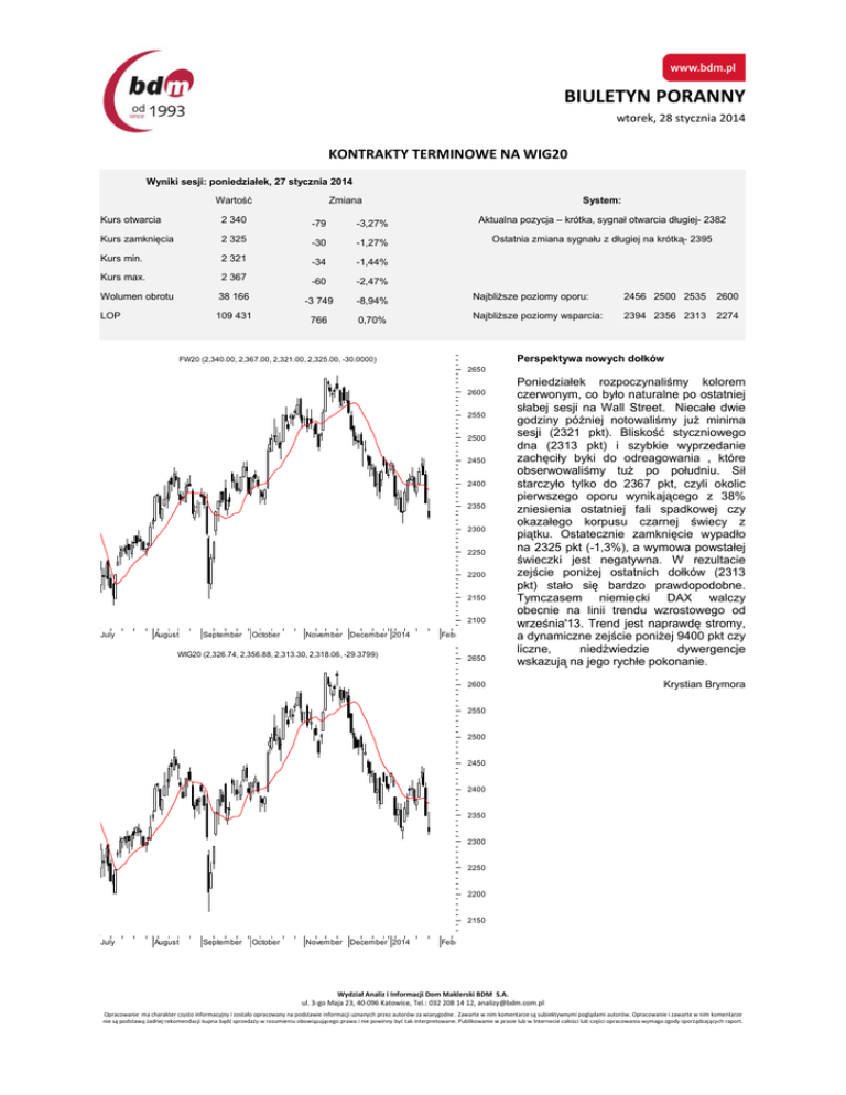 BIULETYN PORANNY wtorek, 28 stycznia 2014 KONTRAKTY TERMINOWE NA WIG20 Wyniki sesji: poniedziałek, 27 stycznia 2014 Wartość Zmiana System: Kurs otwarcia 2 340 -79 -3,27% Aktualna pozycja – krótka, sygnał otwarcia długiej- 2382 Kurs zamknięcia 2 325 -30 -1,27% Ostatnia zmiana sygnału z długiej na krótką- 2395 Kurs min. 2 321 -34 -1,44% Kurs max. 2 367 -60 -2,47% Wolumen obrotu 38 166 -3 749 -8,94% LOP 109 431 766 0,70% Najbliższe poziomy oporu: 2456 2500 2535 2600 Najbliższe poziomy wsparcia: 2394 2356 2313 2274 Perspektywa nowych dołków FW20 (2,340.00, 2,367.00, 2,321.00, 2,325.00, -30.0000) 2650 2600 2550 2500 2450 2400 2350 2300 2250 2200 2150 2100 July August September October November December 2014 Febr WIG20 (2,326.74, 2,356.88, 2,313.30, 2,318.06, -29.3799) 2650 Poniedziałek rozpoczynaliśmy kolorem czerwonym, co było naturalne po ostatniej słabej sesji na Wall Street. Niecałe dwie godziny później notowaliśmy już minima sesji (2321 pkt). Bliskość styczniowego dna (2313 pkt) i szybkie wyprzedanie zachęciły byki do odreagowania , które obserwowaliśmy tuż po południu. Sił starczyło tylko do 2367 pkt, czyli okolic pierwszego oporu wynikającego z 38% zniesienia ostatniej fali spadkowej czy okazałego korpusu czarnej świecy z piątku. Ostatecznie zamknięcie wypadło na 2325 pkt (-1,3%), a wymowa powstałej świeczki jest negatywna. W rezultacie zejście poniżej ostatnich dołków (2313 pkt) stało się bardzo prawdopodobne. Tymczasem niemiecki DAX walczy obecnie na linii trendu wzrostowego od września'13. Trend jest naprawdę stromy, a dynamiczne zejście poniżej 9400 pkt czy liczne, niedźwiedzie dywergencje wskazują na jego rychłe pokonanie. 2600 Krystian Brymora 2550 2500 2450 2400 2350 2300 2250 2200 2150 July August September October November December 2014 Febr Wydział Analiz i Informacji Dom Maklerski BDM S.A. ul. 3‐go Maja 23, 40‐096 Katowice, Tel.: 032 208 14 12, [email protected] Opracowanie ma charakter czysto informacyjny i zostało opracowany na podstawie informacji uznanych przez autorów za wiarygodne . Zawarte w nim komentarze są subiektywnymi poglądami autorów. Opracowanie i zawarte w nim komentarze nie są podstawą żadnej rekomendacji kupna bądź sprzedaży w rozumieniu obowiązującego prawa i nie powinny być tak interpretowane. Publikowanie w prasie lub w Internecie całości lub części opracowania wymaga zgody sporządzających raport. BIULETYN PORANNY wtorek, 28 stycznia 2014 RYNEK AKCJI Wyniki sesji: poniedziałek, 27 stycznia 2014 52 tygodnie Indeks Kurs otwarcia Kurs zamknięcia Zmiana [%] Kurs min. Kurs max. Zakres wahań Wartość obrotów [mln PLN] Kurs max. Kurs min. WIG20 2 625,8 2 150,8 2 326,74 2 318,06 -1,25% 2 313,30 2 356,88 43,6 824,0 WIG30 2 764,4 2 435,3 2 460,32 2 450,93 -1,19% 2 442,24 2 482,11 39,9 878,0 sWIG80 15 156,8 10 183,5 14 055,85 14 005,47 -0,76% 13 874,30 14 055,85 181,6 35,4 mWIG40 3 599,3 2 453,4 3 329,01 3 327,46 -1,01% 3 294,96 3 329,01 34,1 115,0 WIG-PL 56 438,7 43 438,1 50 900,97 50 991,50 -1,13% 50 900,97 51 141,19 240,2 - WIG 55 384,8 42 842,1 50 188,76 50 041,93 -1,09% 49 865,08 50 492,99 627,9 1 010,0 Spółka Cena [PLN] Mkt Cap [mln PLN] ALIOR BANK 86,20 ASSECOPOL AZOTY TARNÓW zmiana % zmiana % względem WIG30 dzienna 1M 3M 6M dzienna 1M 3M 6M 6 029 -0,7% 6,7% 5,2% 0,0% 0,5% 10,1% 14,9% -2,1% 45,59 3 784 -0,8% -0,9% -11,1% 1,3% 0,4% 2,5% -1,4% -0,8% 49,39 4 899 3,7% -21,0% -41,7% -25,1% 4,8% -17,6% -32,0% -27,1% BANK HANDLOWY 102,40 13 380 -4,3% -2,5% -16,7% 7,8% -3,1% 0,9% -7,0% 5,7% BOGDANKA 124,50 4 235 -0,4% 2,7% 6,1% 22,2% 0,8% 6,1% 15,8% 20,1% BORYSZEW 0,51 1 122 0,0% 0,0% -1,9% 6,3% 1,2% 3,4% 7,8% 4,2% BRE 496,00 20 919 0,4% 1,2% -3,0% 21,0% 1,6% 4,6% 6,7% 18,9% BZ WBK 378,00 35 360 -3,7% -2,5% -2,1% 22,7% -2,5% 0,9% 7,6% 20,6% CCC 117,00 4 493 -0,8% 0,0% -13,3% 29,3% 0,4% 3,4% -3,6% 27,2% CYFROWY POLSAT 19,60 6 828 -1,5% -1,5% -14,8% -7,9% -0,3% 1,9% -5,1% -10,0% ENEA 12,50 5 518 -2,4% -8,1% -16,9% -9,3% -1,2% -4,7% -7,2% -11,4% EUROCASH 39,50 5 469 -2,7% -17,7% -19,6% -33,7% -1,5% -14,4% -9,9% -35,8% GTC 7,15 2 512 -1,8% -3,2% -10,7% -10,6% -0,6% 0,1% -1,0% -12,7% ING BSK 114,55 14 903 -2,8% 2,3% -3,7% 16,9% -1,6% 5,6% 6,0% 14,8% JSW 45,02 5 286 -4,2% -16,8% -34,2% -31,6% -3,0% -13,4% -24,5% -33,7% KERNEL 40,50 3 227 1,3% 6,4% -3,9% -21,1% 2,4% 9,8% 5,8% -23,1% KGHM 110,00 22 000 0,0% -5,8% -10,6% -1,8% 1,2% -2,5% -0,9% -3,9% LOTOS 36,03 4 679 -0,4% 2,6% -6,4% 5,4% 0,8% 6,0% 3,3% 3,3% 8 939,90 16 370 -1,5% 2,2% -0,7% 31,5% -0,3% 5,5% 9,0% 29,4% LPP NETIA 4,90 1 705 -2,0% -7,0% -5,4% 11,4% -0,8% -3,7% 4,3% 9,3% PEKAO 176,10 46 221 -2,6% -2,2% -9,7% 9,4% -1,4% 1,1% 0,0% 7,3% PGE 16,50 30 851 -0,6% -0,2% -11,1% 10,1% 0,6% 3,2% -1,5% 8,0% PGNIG 4,77 28 143 0,8% -7,2% -16,5% -21,9% 2,0% -3,8% -6,8% -24,0% PKNORLEN 37,98 16 244 -2,6% -7,4% -16,0% -11,7% -1,4% -4,1% -6,3% -13,8% PKOBP 40,10 50 125 -1,0% 1,5% -2,2% 10,8% 0,2% 4,9% 7,5% 8,7% PZU 417,35 36 039 -1,3% -8,0% -11,2% -7,1% -0,1% -4,6% -1,5% -9,2% SYNTHOS 5,15 6 815 -0,8% -8,0% 1,0% 17,6% 0,4% -4,7% 10,7% 15,5% TAURON 4,11 7 203 1,7% -8,1% -16,1% -3,3% 2,9% -4,7% -6,4% -5,4% TPSA 9,70 12 730 1,0% 0,0% -4,9% 26,1% 2,2% 3,4% 4,8% 24,1% TVN 14,99 5 195 0,3% 2,0% -3,0% 40,6% 1,5% 5,3% 6,7% 38,5% Wydział Analiz i Informacji Dom Maklerski BDM S.A. ul. 3‐go Maja 23, 40‐096 Katowice, Tel.: 032 208 14 12, [email protected] Opracowanie ma charakter czysto informacyjny i zostało opracowany na podstawie informacji uznanych przez autorów za wiarygodne . Zawarte w nim komentarze są subiektywnymi poglądami autorów. Opracowanie i zawarte w nim komentarze nie są podstawą żadnej rekomendacji kupna bądź sprzedaży w rozumieniu obowiązującego prawa i nie powinny być tak interpretowane. Publikowanie w prasie lub w Internecie całości lub części opracowania wymaga zgody sporządzających raport. BIULETYN PORANNY wtorek, 28 stycznia 2014 KOMENTARZE Komentarz po sesji Komentarz przed sesją: Turecka lira pierwszą