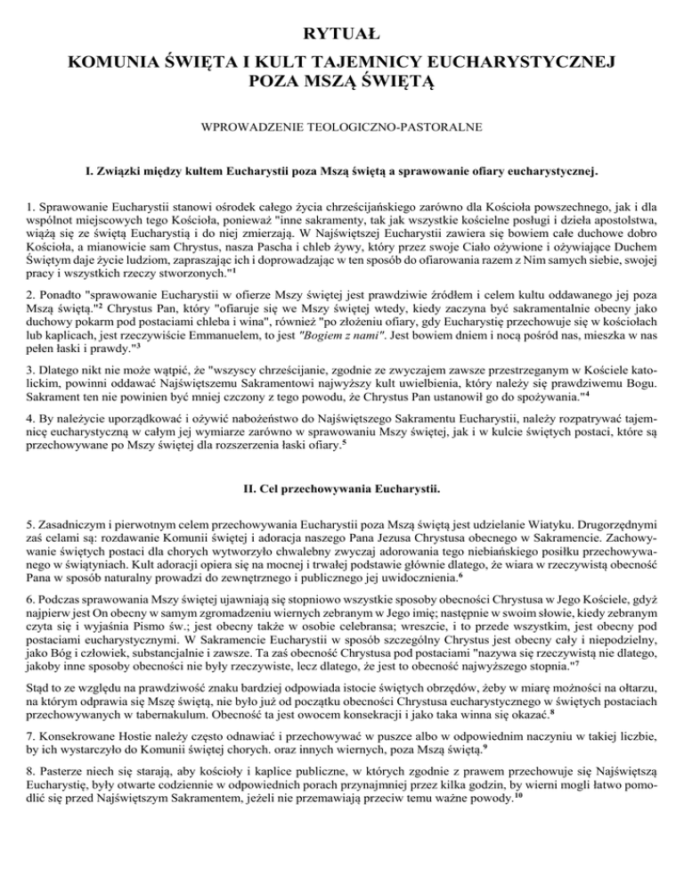 RYTUAŁ KOMUNIA ŚWIĘTA I KULT TAJEMNICY EUCHARYSTYCZNEJ POZA MSZĄ ŚWIĘTĄ WPROWADZENIE TEOLOGICZNO-PASTORALNE I. Związki między kultem Eucharystii poza Mszą świętą a sprawowanie ofiary eucharystycznej. 1. Sprawowanie Eucharystii stanowi ośrodek całego życia chrześcijańskiego zarówno dla Kościoła powszechnego, jak i dla wspólnot miejscowych tego Kościoła, ponieważ "inne sakramenty, tak jak wszystkie kościelne posługi i dzieła apostolstwa, wiążą się ze świętą Eucharystią i do niej zmierzają. W Najświętszej Eucharystii zawiera się bowiem całe duchowe dobro Kościoła, a mianowicie sam Chrystus, nasza Pascha i chleb żywy, który przez swoje Ciało ożywione i ożywiające Duchem Świętym daje życie ludziom, zapraszając ich i doprowadzając w ten sposób do ofiarowania razem z Nim samych siebie, swojej pracy i wszystkich rzeczy stworzonych."1 2. Ponadto "sprawowanie Eucharystii w ofierze Mszy świętej jest prawdziwie źródłem i celem kultu oddawanego jej poza Mszą świętą."2 Chrystus Pan, który "ofiaruje się we Mszy świętej wtedy, kiedy zaczyna być sakramentalnie obecny jako duchowy pokarm pod postaciami chleba i wina", również "po złożeniu ofiary, gdy Eucharystię przechowuje się w kościołach lub kaplicach, jest rzeczywiście Emmanuelem, to jest "Bogiem z nami". Jest bowiem dniem i nocą pośród nas, mieszka w nas pełen łaski i prawdy."3 3. Dlatego nikt nie może wątpić, że "wszyscy chrześcijanie, zgodnie ze zwyczajem zawsze przestrzeganym w Kościele katolickim, powinni oddawać Najświętszemu Sakramentowi najwyższy kult uwielbienia, który należy się prawdziwemu Bogu. Sakrament ten nie powinien być mniej czczony z tego powodu, że Chrystus Pan ustanowił go do spożywania."4 4. By należycie uporządkować i ożywić nabożeństwo do Najświętszego Sakramentu Eucharystii, należy rozpatrywać tajemnicę eucharystyczną w całym jej wymiarze zarówno w sprawowaniu Mszy świętej, jak i w kulcie świętych postaci, które są przechowywane po Mszy świętej dla rozszerzenia łaski ofiary.5 II. Cel przechowywania Eucharystii. 5. Zasadniczym i pierwotnym celem przechowywania Eucharystii poza Mszą świętą jest udzielanie Wiatyku. Drugorzędnymi zaś celami są: rozdawanie Komunii świętej i adoracja naszego Pana Jezusa Chrystusa obecnego w Sakramencie. Zachowywanie świętych postaci dla chorych wytworzyło chwalebny zwyczaj adorowania tego niebiańskiego posiłku przechowywanego w świątyniach. Kult adoracji opiera się na mocnej i trwałej podstawie głównie dlatego, że wiara w rzeczywistą obecność Pana w sposób naturalny prowadzi do zewnętrznego i publicznego jej uwidocznienia.6 6. Podczas sprawowania Mszy świętej ujawniają się stopniowo wszystkie sposoby obecności Chrystusa w Jego Kościele, gdyż najpierw jest On obecny w samym zgromadzeniu wiernych zebranym w Jego imię; następnie w swoim słowie, kiedy zebranym czyta się i wyjaśnia Pismo św.; jest obecny także w osobie celebransa; wreszcie, i to przede wszystkim, jest obecny pod postaciami eucharystycznymi. W Sakramencie Eucharystii w sposób szczególny Chrystus jest obecny cały i niepodzielny, jako Bóg i człowiek, substancjalnie i zawsze. Ta zaś obecność Chrystusa pod postaciami "nazywa się rzeczywistą nie dlatego, jakoby inne sposoby obecności nie były rzeczywiste, lecz dlatego, że jest to obecność najwyższego stopnia."7 Stąd to ze względu na prawdziwość znaku bardziej odpowiada istocie świętych obrzędów, żeby w miarę możności na ołtarzu, na którym odprawia się Mszę świętą, nie było już od początku obecności Chrystusa eucharystycznego w świętych postaciach przechowywanych w tabernakulum. Obecność ta jest owocem konsekracji i jako taka winna się okazać.8 7. Konsekrowane Hostie należy często odnawiać i przechowywać w puszce albo w odpowiednim naczyniu w takiej liczbie, by ich wystarczyło do Komunii świętej chorych. oraz innych wiernych, poza Mszą świętą.9 8. Pasterze niech się starają, aby kościoły i kaplice publiczne, w których zgodnie z prawem przechowuje się Najświętszą Eucharystię, były otwarte codziennie w odpowiednich porach przynajmniej przez kilka godzin, by wierni mogli łatwo pomodlić się przed Najświętszym Sakramentem, jeżeli nie przemawiają przeciw temu ważne powody.10 III. Miejsce przechowywania Eucharystii. 9. Miejsce przechowywania Najświętszej Eucharystii powinno się szczególnie wyróżniać. Należy bardzo troszczyć się o to, aby ułatwiało ono prywatną adorację i modlitwę tak, by wierni mogli dogodnie i z pożytkiem oddawać ustawicznie prywatną cześć Panu obecnemu w Najświętszym Sakramencie. Cel ten łatwiej można osiągnąć przez przygotowanie kaplicy oddzielonej od nawy środkowej, zwłaszcza w tych kościołach, gdzie częściej odbywają się śluby lub pogrzeby oraz w tych, które są licznie nawiedzane przez pielgrzymów czy przez turystów zwiedzających zabytki sztuki i historii. 10. Najświętszy Sakrament należy przechowywać w jednym tabernakulum nieruchomym, mocnym i nieprzeźroczystym. Ma ono być tak zamknięte, aby wykluczało niebezpieczeństwo profanacji. Dlatego w każdym kościele powinno być zwykle tylko jedno tabernakulum umieszczone w takiej części kościoła lub kaplicy, która jest dostojna, dobrze widoczna, należycie ozdobiona i sprzyjająca modlitwie. Ten, kto ma pod opieką kościół lub kaplicę, powinien bardzo pilnie strzec klucza od tabernakulum, w którym przechowuje się Najświętszą Eucharystię.11 11. Obecność Najświętszej Eucharystii w tabernakulum należy zaznaczyć przez konopeum lub w inny odpowiedni sposób określony przez kompetentną władzę. Według przyjętego zwyczaju przed tabernakulum, w którym przechowuje się Najświętszy Sakrament, winna nieustannie płonąć specjalna lampka, aby wskazywać na obecność Chrystusa i pobudzać do Jego czci. Zgodnie z tradycją lampka powi
