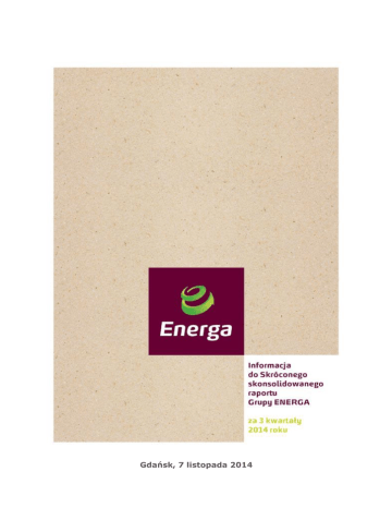 Gdańsk, 7 listopada 2014 roku Spis treści PODSUMOWANIE 3 KWARTAŁU 2014 ROKU ........................................................................................................................ 3 WYBRANE SKONSOLIDOWANE DANE FINANSOWE GRUPY ENERGA...................................................................................... 5 WYBRANE JEDNOSTKOWE DANE FINANSOWE ENERGA SA ................................................................................................... 6 1. OPIS ORGANIZACJI GRUPY KAPITAŁOWEJ ENERGA .............................................................................................. 8 2. DZIAŁALNOŚĆ GRUPY KAPITAŁOWEJ ENERGA ..................................................................................................... 10 2.1 OPIS DZIAŁALNOŚCI GRUPY W PODZIALE NA SEGMENTY DZIAŁALNOŚCI ........................................................................................ 2.2 KLUCZOWE DANE OPERACYJNE GRUPY ............................................................................................................................ 2.2.1 SEGMENT DYSTRYBUCJI ....................................................................................................................................... 2.2.2 SEGMENT SPRZEDAŻY......................................................................................................................................... 2.2.3 SEGMENT WYTWARZANIE ..................................................................................................................................... 2.3 REALIZACJA PROGRAMU INWESTYCYJNEGO ....................................................................................................................... 3. 10 12 12 13 14 16 CZYNNIKI I ZDARZENIA MAJĄCE WPŁYW NA OSIĄGNIĘTE WYNIKI FINANSOWE ................................................. 17 3.1 3.2 3.3 4. SYTUACJA MAKROEKONOMICZNA .................................................................................................................................. 17 SYTUACJA NA RYNKU ELEKTROENERGETYCZNYM .................................................................................................................. 19 OTOCZENIE REGULACYJNE ......................................................................................................................................... 25 SYTUACJA FINANSOWO-MAJĄTKOWA GRUPY ENERGA ........................................................................................ 27 4.1 WYNIKI FINANSOWE GRUPY ....................................................................................................................................... 27 4.1.1 SKONSOLIDOWANY RACHUNEK ZYSKÓW I STRAT ........................................................................................................ 27 4.1.2 SKONSOLIDOWANE SPRAWOZDANIE Z SYTUACJI FINANSOWEJ ......................................................................................... 31 4.1.3 SKONSOLIDOWANE SPRAWOZDANIE Z PRZEPŁYWÓW PIENIĘŻNYCH .................................................................................... 34 4.1.4 WYBRANE WSKAŹNIKI EKONOMICZNE ....................................................................................................................... 35 4.2 SEGMENTY DZIAŁALNOŚCI ......................................................................................................................................... 35 4.2.1 DYSTRYBUCJA .......................................................................................................................................... 35 4.2.2 SPRZEDAŻ .............................................................................................................................................. 37 4.2.3 WYTWARZANIE ......................................................................................................................................... 39 4.3 PROGNOZY WYNIKÓW FINANSOWYCH ............................................................................................................................. 43 4.4 ZARZĄDZANIE RYZYKIEM FINANSOWYM I RYNKOWYM ............................................................................................................ 43 5. ISTOTNE ZDARZENIA OKRESU SPRAWOZDAWCZEGO I PO DNIU BILANSOWYM ................................................... 44 5.1 5.2 5.3 5.4 5.5 5.6 PODZIAŁ ZYSKU NETTO SPÓŁKI ENERGA SA ZA 2013 ROK .................................................................................................. ZWYCZAJNE WALNE ZGROMADZENIE ENERGA SA Z 20 MAJA 2014 ROKU ................................................................................. ZBYCIE AKCJI ENERGA SA PRZEZ SPÓŁKĘ ZALEŻNĄ ENERGA WYTWARZANIE SA ......................................................................... ROZWIĄZANIE SPÓŁKI POŚREDNIO ZALEŻNEJ OD ENERGA SA ................................................................................................ UCHYLENIE LIKWIDACJI SPÓŁKI ZALEŻNEJ OD ENERGA SA ................................................................................................... UTRZYMANIE RATINGU SPÓŁKI ENERGA PRZEZ AGENCJĘ FITCH RATINGS .................................................................................... 44 44 45 45 45 45 5.7. AKTUALIZACJA PROGRAMU INWESTYCYJNEGO NA LATA 2014-2022 .......................................................................................... 5.8 INFORMACJE O ISTOTNYCH UMOWACH I TRANSAKCJACH Z PODMIOTAMI POWIĄZANYMI ....................................................................... 5.8.1 AKTUALIZACJA SZACUNKOWEJ WARTOŚCI UMÓW GRUPY ENERGA Z PSE SA ........................................................................... 5.8.2 ZAWARCIE UMOWY ZMIENIAJĄCEJ POMIĘDZY ENERGA SA A PEKAO SA ................................................................................. 5.8.3 ZAWARCIE PRZEZ GRUPĘ ENERGA ANEKSU DO UMOWY ZNACZĄCEJ Z EUROPEJSKIM BANKIEM INWE
