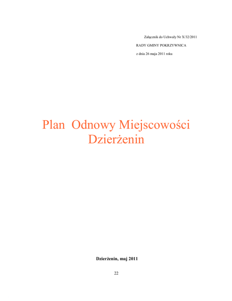 Załącznik do Uchwały Nr X/32/2011 RADY GMINY POKRZYWNICA z dnia 26 maja 2011 roku Plan Odnowy Miejscowości Dzierżenin Dzierżenin, maj 2011 22 Spis treści Wstęp........................................................................................................................... 3 I. Charakterystyka miejscowości .....................................................................5 1. Stan istniejący.................................................................................................... 12 2. Ocena mocnych i słabych stron wsi ..................................................................15 3. Wizja odnowy wsi Dzierżenin ........................................................... ............18 4. Analiza zasobów miejscowości Dzierżenin ....................................................18 5. Program odnowy wsi – plan działania a) metoda opracowania Planu odnowy ….......................................................21 b) horyzont czasowy realizacji Planu odnowy …............................................21 c) finansowanie odnowy ….............................................................................21 d) opis planowanych przedsięwzięć w perspektywie 7 lat od dnia przyjęcia Planu Odnowy Miejscowości ..................................................................21 II. Opis planowanego przedsięwzięcia –„Rozbudowa z nadbudową istniejącego budynku remizy OSP w Dzierżeninie o pomieszczenia na potrzeby świetlicy wiejskiej” ……………….................................................................………..….25 III. Szacunkowy kosztorys planowanego przedsięwzięcia .................................26 IV. Harmonogram planowanego przedsięwzięcia – „Rozbudowa z nadbudową istniejącego budynku remizy OSP w Dzierżeninie o pomieszczenia na potrzeby świetlicy wiejskiej” ……………........................................................………….27 22 WSTĘP Konieczność opracowania Planu Odnowy Miejscowości wynika z wytycznych Programu Rozwoju Obszarów Wiejskich na lata 2007 -2013. Oś 3 zakłada między innymi wspieranie działań mających wpływać na poprawę jakości życia na obszarach wiejskich przez zaspokojenie potrzeb społecznych i kulturalnych mieszkańców wsi. Plan Odnowy Miejscowości jest jednym z elementów wpływających na rozwój, odnowę wsi oraz poprawę warunków pracy i życia mieszkańców. Niniejsze opracowanie zawiera charakterystykę miejscowości, inwentaryzację zasobów służącą ujęciu stanu rzeczywistego, analizę SWOT czyli mocne i słabe strony miejscowości, planowane kierunki rozwoju, opis przedsięwzięcia wraz z szacunkowym kosztorysem i harmonogramem działań. Plan Odnowy Miejscowości Dzierżenin to dokument, który określa strategię działań w sferze społeczno – gospodarczej na lata 2010 – 2020. Podstawą opracowania planu jest Plan Rozwoju Lokalnego Gminy Pokrzywnica oraz Strategia Rozwoju Gminy Pokrzywnica. 22 22 Ι. Charakterystyka miejscowości Miejscowość Dzierżenin jest jedną z 35 miejscowości wyodrębnionych w podziale administracyjnym gminy Pokrzywnica, położonej w północnej części województwa mazowieckiego, w powiecie pułtuskim. Poniższa mapa ukazuje Gminę Pokrzywnica na tle powiatu pułtuskiego. Najstarsza wzmianka o Dzierżeninie występuje w inwentarzu dóbr ziemskich biskupa płockiego, zachowanym w dokumencie księcia Konrada Mazowieckiego z lat 1230 – 1244. Rozpoczyna się spisem wsi klucza pułtuskiego, należącego do biskupa płockiego wraz z wszelkimi dochodami kasztelańskimi. Występuje tam co najmniej 36 zidentyfikowanych wsi, wśród których są i wsie należące do parafii Dzierżenin. Nazwy wsi wymienione w dokumencie to m. in. Dziersimino lub Durzimino, a więc nazwa Dzierżenin najprawdopodobniej pochodzi od staropolskiego imienia Dzierżyma. Aktualnie wieś stale zamieszkuje 364 mieszkańców, którzy prowadzą 158 gospodarstw domowych na 328,79 h powierzchni. Wieś Dzierżenin położona jest wzdłuż drogi krajowej nr 61 relacji Warszawa – Augustów. Ponadto wieś usytuowana jest w pasie nadnarwiańskim, 22 który charakteryzuje się wysokimi walorami przyrodniczymi i stanowi wyjątkowe bogactwo fauny i flory. Tereny gminy położone w dolnej Narwi są predysponowane do rozwoju różnych form turystyki i wypoczynku. Jest to malowniczy rejon o nieprzeciętnych walorach przyrodniczo – krajobrazowych dolnego biegu rzeki Narew II i III kategorii atrakcyjności turystycznej. Pas nadnarwiański to jeden z bardziej interesujących krajobrazów w pobliskim sąsiedztwie Warszawy, występują tutaj rozległe nadrzeczne łąki, urozmaicone mokrymi starorzeczami, kępami drzew i zagajnikami. Jest to doskonałe miejsce do obserwacji przyrodniczych, a zwłaszcza dla miłośników ptaków. Tędy przechodzi szlak ptasich przelotów, a na przedwiośniu niezwykły jest widok nawołujących się setek dzikich gęsi, ciągnących w kluczach po bezchmurnym niebie. Na wyspie na Narwi urządzono w 1991 r. Rezerwat Przyrody „Dzierżenińska Kępa” (1,2 ha) chroniący miejsce lęgowe ptaków wodnych, a w szczególności kolonię lęgową rybitw. 22 Widok z lotu ptaka na teren miejscowości Dzierżenin Dzięki tak wspaniałym walorom przyrodniczym na terenie wsi, która częściowo stanowi otulinę Nadbużańskiego Parku Krajobrazowego, rozwija się turystyka krajoznawcza, letniskowo – wypoczynkowa i specjalistyczna (ekoturystyka i wędkarstwo). Jadąc z Pułtuska do Serocka niemal cały czas mamy malownicze doliny Narwi z rozlewiskami będącymi odległym krańcem Zalewu Zegrzyńskiego. Zapewne nie ustrzeżemy przed okiem pięknego neogotyckiego kościóła św. Tomasza w Dzierżeninie, wzniesionego w latach 1910 – 1917 przez znakomitego architekta Józefa Dziekońskiego. 22 Kościół parafialny pw. św. Tomasza w Dzierżeninie Kościół zbudowany z czerwonej cegły z użyciem ciosów granitowych, nie jes