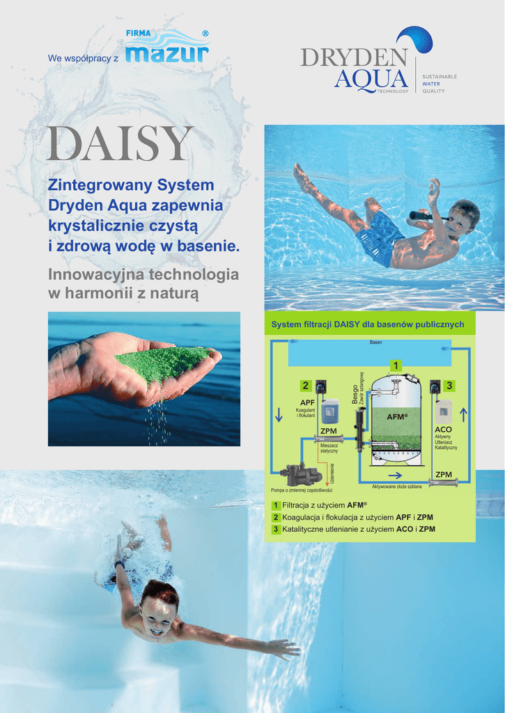 We współpracy z DAISY Zintegrowany System Dryden Aqua zapewnia krystalicznie czystą i zdrową wodę w basenie. Innowacyjna technologia w harmonii z naturą System filtracji DAISY dla basenów publicznych Basen Zawór sztangowy 1 3 Besgo 2 APF Koagulant i flokulant AFM® ACO ZPM Aktywny Utleniacz Katalityczny Uziemienie Mieszacz statyczny Pompa o zmiennej częstotliwości ZPM Aktywowane złoże szklane 1 Filtracja z użyciem AFM® 2 Koagulacja i flokulacja z użyciem APF i ZPM 3 Katalityczne utlenianie z użyciem ACO i ZPM Informacje na temat Dryden Aqua Nasze podejście: Kto kryje się pod nazwą Dryden Aqua? Zamiast zabijać bakterie lepiej jest zapobiegać ich rozwojowi Jesteśmy biologami morskimi specjalizującymi się w oczyszczaniu basenów kąpielowych. Naszą misją jest eliminacja toksycznego chloru i zapewnienie najlepszej jakości powietrza i wody. Zanim skutecznie wprowadziliśmy naszą technologię basenową przez ponad 30 lat pracowaliśmy nad systemami chlorowania basenów dla delfinów i innych ssaków wodnych. Obecnie o wydajności, bezpieczeństwie i korzyściach ze stosowania naszego zintegrowanego systemu oczyszczania wody, może świadczyć ponad 100‘000 basenów na całym świecie stosujących nasze produkty. Dr Dryden jest biologiem morskim, który posiada unikalną wiedzę z zakresu biologii, chemii i technologii. Jest twórcą aktywnego, biologicznie odpornego materiału filtracyjnego AFM®. Co oznacza nazwa Dryden Aqua? Dążymy do osiągnięcia najlepszych rezultatów w postaci krystalicznie czystej wody, przy minimalnym zużyciu chloru, pozbawionej jego zapachu i innych szkodliwych produktów ubocznych dezynfekcji (DBPs). Zintegrowany system oczyszczania Dryden Aqua pozwala obniżyć koszty uzdatniania wody i połączyć przyjemność ze zdrowej kąpieli z utrzymaniem czystości środowiska naturalnego. Basen o głębokości 3 m, brak zmętnienia, zakres widoczności 25 m Uzdatnianie wody basenowej powinno zapobiegać przenoszeniu się patogenów pomiędzy kąpiącymi się osobami i minimalizować szkodliwe produkty uboczne dezynfekcji (DBP). Tradycyjne metody uzdatniania wody zwalczają przenoszenie się patogenów za pomocą coraz to silniejszych chemikaliów do dezynfekcji, napromieniania UVC i ozonu. Jednakże przenoszenie się patogenów jest problemem biologicznym, dlatego też potrzebuje biologicznego rozwiązania. Metoda zintegrowanego systemu uzdatniania wody Dryden Aqua polega dokładnie na tym, że: zamiast coraz mocniejszych środków dezynfekujących i kosztownego sprzętu, opracowaliśmy proces uzdatniania wody basenowej zmieniający właściwości wody utrudniając rozmnażanie się i przeżycie bakterii i pasożytów. Dzięki temu, że jesteśmy biologami, możemy ten cel osiągnąć. Wiemy jakie czynniki są potrzebne do rozwoju bakterii i możemy je usunąć, co jest o wiele lepszym rozwiązaniem, niż próba zabicia bakterii chemikaliami po tym, gdy już doszło do ich rozwoju w układzie wody basenowej. Właśnie dlatego jesteśmy w stanie osiągnąć taką jakość wody w basenie, że prawie w ogóle nie zawiera bakterii i pasożytów. Nasze podejście opiera się na trzech kluczowych elementach: 1. W konsekwencji bio-odporności AFM®, bakterie nie mają podłoża, na którym mogłyby się rozwijać i namnażać. 2. Za pomocą zaawansowanej koagulacji, flokulacji i filtracji usuwamy pożywkę dla bakterii. 3. DAISY: nasz Zintegrowany System Dryden Aqua odfiltrowuje z wody prawie wszystko i zmniejsza zapotrzebowanie na chlor do możliwie najniższego poziomu. Im niższe zapotrzebowanie na utlenianie chloru, tym niższe stężenie produktów ubocznych chloru z dezynfekcji w wodzie, w powietrzu i tuż nad powierzchnią wody. Nasz system DAISY zapewnia krystalicznie czystą i zdrową wodę bez toksycznych produktów ubocznych dezynfekcji (DBP), najniższe zużycie chloru i niskie koszty utrzymania. 2 DRYDEN AQUA Dryden Aqua: chcemy uczynić świat trochę lepszym Misją Dryden Aqua jest uczynić świat trochę lepszym. Zaczęliśmy od poprawy bezpieczeństwa basenów i od tego, aby były one przyjazne dla środowiska. Angażujemy się w walkę z zanieczyszczeniem środowiska i w jego ochronę przed zmianami klimatycznymi. Jesteśmy przekonani, że znaleźliśmy główny mechanizm globalnego ocieplenia. Nasza hipoteza w skrócie wygląda następująco: Wzrost zawartości CO2 w atmosferze nie jest bezpośrednio związany ze wzrostem poziomu CO2 z emisji antropogenicznych. Badania naukowe szacują, że spalanie paliw kopalnych stanowi jedynie między 1 % i maksymalnie 5 % wszystkich emisji CO2 do atmosfery. Jest to ilość znacznie mniejsza niż powszechnie się uważa. UK Royal Society przyznaje, że ilość glonów wodnych powinna się zwiększyć, aby zrekompensować wzrost emisji CO2. Jednak stało się całkiem inaczej; produktywność fitoplanktonu w oceanach spadła. Wzrost poziomu CO2 w atmosferze i zakwaszenie oceanów nie jest spowodowane emisją CO2 wskutek działalności człowieka, a raczej poprzez spadek zdolności ekosystemu do metabolizowania CO2 w atmosferze. Fitoplankton morski przetwarza dwutlenek węgla w tlen w procesie fotosyntezy. Fitoplankton przetwarza 90 % emitowanego CO2 i odpowiada za wytwarzanie tlenu. Jednakże od początku rewolucji chemicznej około 1950 roku, wiązanie dwutlenku węgla i wydajność morskiego fitoplanktonu spadła o 40 %, co jest główną przyczyną wzrostu poziomu dwutlenku węgla w atmosferze. O dziejących się poważnych zmianach w środowisku morskim może świadczyć znaczne zwiększenie liczby meduz i kalmarów i spadek populacji ryb, co zaczynamy już obserwować. Przy wartości pH 7,9 nie mogą się uformować jaja węglanowe. Biorąc pod uwagę, że większość morskich zwierząt i wiele roślin posiada muszle węglanowe, możemy być świadkami całkowitego załamania ekosystemu morskiego, ziemski ekosystem prawdopodobnie spotka podobny los. Zasadniczo obecnie w ocenach zachodz