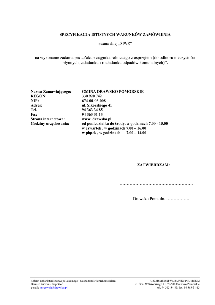 SPECYFIKACJA ISTOTNYCH WARUNKÓW ZAMÓWIENIA zwana dalej „SIWZ” na wykonanie zadania pn: „Zakup ciągnika rolniczego z osprzętem (do odbioru nieczystości płynnych, załadunku i rozładunku odpadów komunalnych)”. Nazwa Zamawiającego: REGON: NIP: Adres: Tel. Fax Strona internetowa: Godziny urzędowania: GMINA DRAWSKO POMORSKIE 330 920 742 674-00-06-008 ul. Sikorskiego 41 94 363 34 85 94 363 31 13 www. drawsko.pl od poniedziałku do środy, w godzinach 7.00 - 15.00 w czwartek , w godzinach 7.00 – 16.00 w piątek , w godzinach 7.00 – 14.00 ZATWIERDZAM: ..…………………………………………. Drawsko Pom. dn. ……………. Referat Urbanistyki Rozwoju Lokalnego i Gospodarki Nieruchomościami Dariusz Rudzki – Inspektor e-mail: [email protected] URZĄD MIEJSKI W DRAWSKU POMORSKIM ul. Gen. W Sikorskiego 41, 78-500 Drawsko Pomorskie tel. 94 363-34-85; fax. 94 363-31-13 2 I. Tryb udzielenia zamówienia publicznego: 1. Postępowanie o udzielenie zamówienia publicznego prowadzone jest w trybie przetargu nieograniczonego, na podstawie przepisów ustawy z dnia 29 stycznia 2004 r. Prawo zamówień publicznych (tj. Dz. U. z 2010 r. Nr 113, poz., 759 z późniejszymi zmianami) , zwanej dalej „ustawą Pzp” oraz aktów wykonawczych do ustawy. Wartość zamówienia nie przekracza kwoty określonej w przepisach wydanych na podstawie art. 11 ust. 8 ustawy Pzp. 2. Miejsce publikacji ogłoszenia o przetargu: - Biuletyn Zamówień Publicznych - Strona internetowa Zamawiającego – www.drawsko.pl-Informator-Przetargi - Tablica ogłoszeń w siedzibie Zamawiającego. II. Opis przedmiotu zamówienia : 1. Przedmiotem zamówienia jest dostawa loco Drawsko Pomorskie ul. Sobieskiego 9 ( teren Zakładu Usług Komunalnych ) fabrycznie nowego ciągnika o następujących parametrach: Szczegółowe wymagania co do przedmiotu zamówienia: 1) Dane techniczne: - moc maksymalna przy prędkości 2200 obr. - od 135 do 145 KM, - Pojemność silnika - maks. 4200 cm3 - typ: turbodoładowany z intercoolerem, - skrzynia biegów, sterowanie wzmacniaczem – elektrohydrauliczne, - od 55 do 65 kN, - hydraulika, udźwig podnośnika - typ sprzęgła - tarczowe mokre, - blokada mechanizmu róŜnicowego - załączana elektropneumatycznie, - sterowana elektropneumatycznie, - przednia oś napędowa - przednie koła - 14,9R – 24 - tylne koła - 18,4R – 38 - zbiornik paliwa - od 180 do 200l - waga - min. 4.300 kg - rozstaw osi - maks. 2.400 mm - lusterka zewnętrzne (prawe i lewe) podgrzewane, 2) WyposaŜenie dodatkowe: - gaśnica z atestem, - apteczka, - trójkąt ostrzegawczy lub lampy z atestem, - klucz do kół, - lampa ostrzegawcza zamontowana na dachu kabiny, - ładowacz czołowy o udźwigu min. 1800 kg, - łyŜka materiałów sypkich o obj. 0,60 m3 - widły paletowe o maks. obciąŜeniu 1250 kg - obciąŜniki przednie – 500 kg, - zaczep do przyczep i wozów asenizacyjnych - przedni TUZ. Referat Rozwoju Lokalnego i Gospodarki Nieruchomościami Dariusz Rudzki – Inspektor e-mail: [email protected] URZĄD MIEJSKI W DRAWSKU POMORSKIM ul. Gen. W Sikorskiego 41, 78-500 Drawsko Pomorskie tel. 94 363-34-85; fax. 94 363-31-13 3 3) Inne koszty i wymagania dot. przedmiotu zamówienia, które obowiązują wykonawcę: - koszty związane z transportem do siedziby Zamawiającego ponosi Wykonawca. - przekazanie pojazdu przez Wykonawcę nastąpi na podstawie protokółu zdawczo – odbiorczego z opisem stanu technicznego oraz na podstawie Ŝądanych dokumentów: - pojazd musi spełniać normy i certyfikaty przewidziane polskim prawem. - wszystkie pozycje stanowiące przedmiot zamówienia muszą być fabrycznie nowe. - dostawca jest zobowiązany do podania nazwy, marki, typu, parametrów i producenta oferowanego sprzętu oraz siedziby i adresu serwisu. - koszt przeszkolenia obsługi pojazdu 6) Wymagane dokumenty dostarczane wraz z samochodem. - ksiąŜka pojazdu lub karta pojazdu, - ksiąŜka lub karta gwarancyjna, - świadectwo homologacji, - komplet dokumentów umoŜliwiających rejestrację pojazdu we właściwym urzędzie, - instrukcja obsługi podwozia i zabudowy w języku polskim, 7) Gwarancja i serwis pogwarancyjny. Wykonawca musi posiadać na terenie Polski autoryzowany serwis gwarancyjny i pogwarancyjny. Wykonawca zobowiązany będzie do niezwłocznego, ni później niŜ w terminie 7 dni, usunięcia wszelkich usterek powstałych lub ujawnionych w okresie gwarancyjnym. W celu prawidłowej realizacji napraw gwarancyjnych Wykonawca zapewni Zamawiającemu pełen serwis części zamiennych. Wymagany okres gwarancji: kabina - min. 24 m-ce, podwozie z silnikiem - min. 24 m-ce, zabudowa - min. 24 m-ce, czas przybycia serwisu - maks. 48 godz, miejsce obsługi serwisowej - w promieniu 50 km od Zamawiającego, W okresie gwarancji, pokrycie przez wykonawcę kosztów dojazdu (transportu) do serwisu, jeŜeli naprawa nie moŜe być dokonana w siedzibie Zamawiającego. W przypadku dwukrotnej awarii tej samej części (lub zespołu), wymiana jej przez wykonawcę na fabrycznie nową. Pokrycie przez wykonawcę całkowitych kosztów okresowych przeglądów gwarancyjnych. 8) Uwagi końcowe. Pojazd wraz z osprzętem musi być fabrycznie nowy (rok produkcji 2011) wykonany zgodnie z posiadaną dokumentacją, odpowiadającą warunkom technicznym i przepisom BHP. 2. Kod CPV: 16700000-2 3. Zamawiający nie dopuszcza składania ofert wariantowych. 4. Zamawiający nie przewiduje udzielenie zamówień uzupełniających. 5. Zamawiający nie dopuszcza składania ofert częściowych. Referat Rozwoju Lokalnego i Gospodarki Nieruchomościami Dariusz Rudzki – Inspektor e-mail: [email protected] URZĄD MIEJSKI W DRAWSKU POMORSKIM ul. Gen. W Sikorskiego 41, 78-500 Drawsko Pomorskie tel. 94 363-34-85; fax. 94 363-31-13 4 III. Termin wykonania zamówienia Dostawę przedmiotu zamówienia do siedziby Zamawiającego naleŜy wykonać w terminie do dnia 2011.12.01. IV. Warunki i wymagania stawiane Wykonawcom biorącym udział w postępowaniu ora