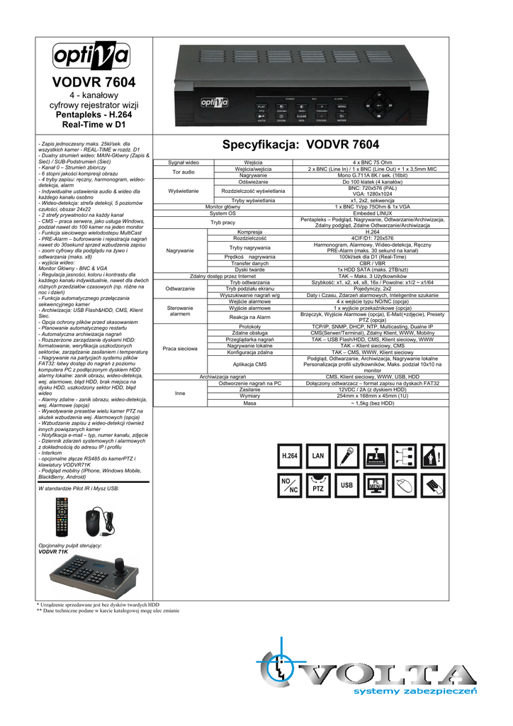 VODVR 7604 4 - kanałowy cyfrowy rejestrator wizji Pentapleks - H.264 Real-Time w D1 - Zapis jednoczesny maks. 25kl/sek. dla wszystkich kamer - REAL-TIME w rozdz. D1 - Dualny strumień wideo: MAIN-Główny (Zapis & Sieć) / SUB-Podstrumień (Sieć) - Kanał 0 – Strumień zbiorczy - 6 stopni jakości kompresji obrazu - 4 tryby zapisu: ręczny, harmonogram, wideodetekcja, alarm - Indywidualne ustawienia audio & wideo dla każdego kanału osobno - Wideo-detekcja: strefa detekcji, 5 poziomów czułości, obszar 24x22 - 2 strefy prywatności na każdy kanał - CMS – praca serwera, jako usługa Windows, podział nawet do 100 kamer na jeden monitor - Funkcja sieciowego wielodostepu MultiCast - PRE-Alarm – buforowanie i rejestracja nagrań nawet do 30sekund sprzed wzbudzenia zapisu - zoom cyfrowy dla podglądu na żywo i odtwarzania (maks. x8) - wyjścia wideo: Monitor Główny - BNC & VGA - Regulacja jasności, koloru i kontrastu dla każdego kanału indywidualnie, nawet dla dwóch różnych przedziałów czasowych (np. różne na noc i dzień) - Funkcja automatycznego przełączania sekwencyjnego kamer - Archiwizacja: USB Flash&HDD, CMS, Klient Siec. - Opcja ochrony plików przed skasowaniem - Planowanie automatycznego restartu - Automatyczna archiwizacja nagrań - Rozszerzone zarządzanie dyskami HDD: formatowanie, weryfikacja uszkodzonych sektorów, zarządzanie zasilaniem i temperaturą - Nagrywanie na partycjach systemu plików FAT32: łatwy dostęp do nagrań z poziomu komputera PC z podłączonym dyskiem HDD alarmy lokalne: zanik obrazu, wideo-detekcja, wej. alarmowe, błąd HDD, brak miejsca na dysku HDD, uszkodzony sektor HDD, błąd wideo - Alarmy zdalne - zanik obrazu, wideo-detekcja, wej. Alarmowe (opcja) - Wywoływanie presetów wielu kamer PTZ na skutek wzbudzenia wej. Alarmowych (opcja) - Wzbudzanie zapisu z wideo-detekcji również innych powiązanych kamer - Notyfikacja e-mail – typ, numer kanału, zdjęcie - Dziennik zdarzeń systemowych i alarmowych z dokładnością do adresu IP i profilu - Interkom - opcjonalne złącze RS485 do kamerPTZ i klawiatury VODVR71K - Podgląd mobilny (IPhone, Windows Mobile, BlackBerry, Android) Specyfikacja: VODVR 7604 Sygnał wideo Tor audio Wejścia Wejścia/wejścia Nagrywanie Odświeżanie Wyświetlanie Rozdzielczość wyświetlania Tryby wyświetlania Monitor główny System OS Tryb pracy Kompresja Rozdzielczość Nagrywanie Tryby nagrywania Prędkoś nagrywania Transfer danych Dyski twarde Zdalny dostęp przez Internet Tryb odtwarzania Odtwarzanie Tryb podziału ekranu Wyszukiwanie nagrań w/g Wejście alarmowe Sterowanie Wyjście alarmowe alarmem Reakcja na Alarm Praca sieciowa Protokoły Zdalne obsługa Przeglądarka nagrań Nagrywanie lokalne Konfiguracja zdalna Aplikacja CMS Inne W standardzie Pilot IR i Mysz USB: Opcjonalny pulpit sterujący: VODVR 71K * Urządzenie sprzedawane jest bez dysków twardych HDD ** Dane techniczne podane w karcie katalogowej mogę ulec zmianie Archiwizacja nagrań Odtworzenie nagrań na PC Zasilanie Wymiary Masa 4 x BNC 75 Ohm 2 x BNC (Line In) / 1 x BNC (Line Out) + 1 x 3,5mm MIC Mono G.711A 8K / sek. (16bit) Do 100 klatek (4 kanałów) BNC: 720x576 (PAL) VGA: 1280x1024 x1, 2x2, sekwencja 1 x BNC 1Vpp 75Ohm & 1x VGA Embeded LINUX Pentapleks – Podgląd, Nagrywanie, Odtwarzanie/Archiwizacja, Zdalny podgląd, Zdalne Odtwarzanie/Archiwizacja H.264 4CIF/D1: 720x576 Harmonogram, Alarmowy, Wideo-detekcja, Ręczny PRE-Alarm (maks. 30 sekund na kanał) 100kl/sek dla D1 (Real-Time) CBR / VBR 1x HDD SATA (maks. 2TB/szt) TAK – Maks. 3 Użytkowników Szybkość: x1, x2, x4, x8, 16x / Powolne: x1/2 ~ x1/64 Pojedynczy, 2x2 Daty i Czasu, Zdarzeń alarmowych, Inteligentne szukanie 4 x wejście typu NO/NC (opcja) 1 x wyjście przekaźnikowe (opcja) Brzęczyk, Wyjście Alarmowe (opcja), E-Mail(+zdjęcie), Presety PTZ (opcja) TCP/IP, SNMP, DHCP, NTP, Multicasting, Dualne IP CMS(Serwer/Terminal), Zdalny Klient, WWW, Mobilny TAK – USB Flash/HDD, CMS, Klient sieciowy, WWW TAK – Klient sieciowy, CMS TAK – CMS, WWW, Klient sieciowy Podgląd, Odtwarzanie, Archiwizacja, Nagrywanie lokalne Personalizacja profili użytkowników, Maks. podział 10x10 na monitor CMS, Klient sieciowy, WWW, USB, HDD Dołączony odtwarzacz – format zapisu na dyskach FAT32 12VDC / 2A (z dyskiem HDD) 254mm x 168mm x 45mm (1U) ~ 1,5kg (bez HDD)