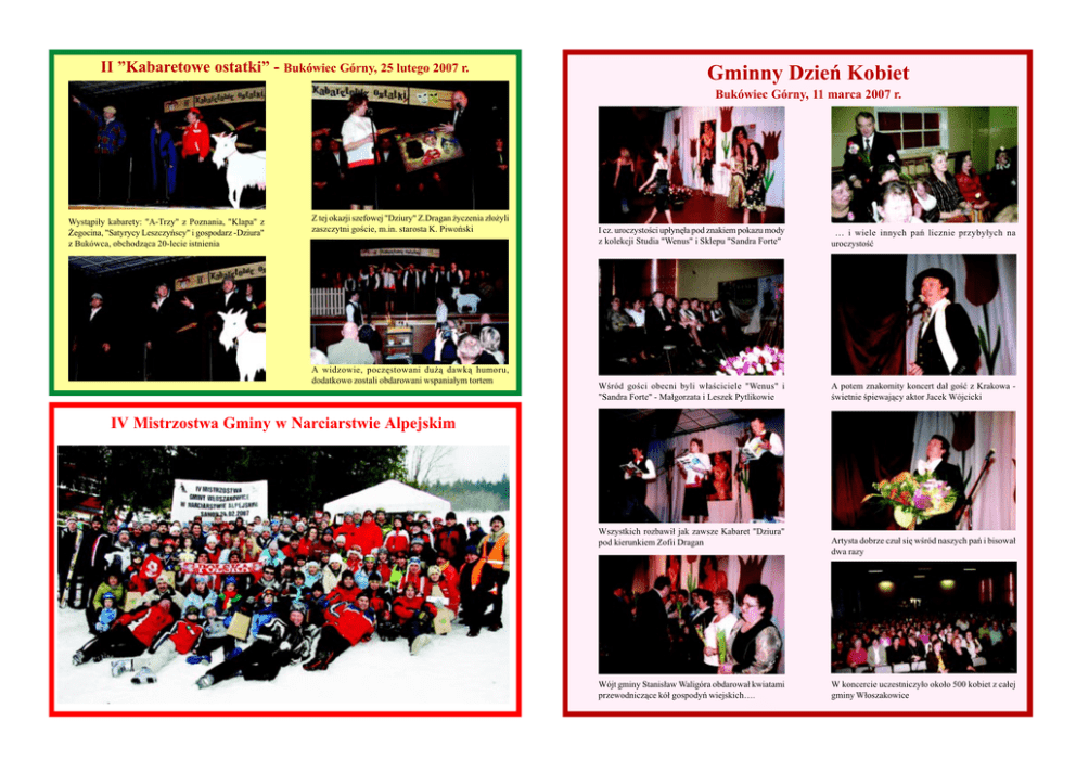 II Kabaretowe ostatki - Bukówiec Górny, 25 lutego 2007 r. Gminny Dzieñ Kobiet Bukówiec Górny, 11 marca 2007 r. Wyst¹pi³y kabarety: "A-Trzy" z Poznania, "Klapa" z ¯egocina, "Satyrycy Leszczyñscy" i gospodarz -Dziura" z Bukówca, obchodz¹ca 20-lecie istnienia Z tej okazji szefowej "Dziury" Z.Dragan ¿yczenia z³o¿yli zaszczytni gocie, m.in. starosta K. Piwoñski A widzowie, poczêstowani du¿¹ dawk¹ humoru, dodatkowo zostali obdarowani wspania³ym tortem I cz. uroczystoci up³ynê³a pod znakiem pokazu mody z kolekcji Studia "Wenus" i Sklepu "Sandra Forte" i wiele innych pañ licznie przyby³ych na uroczystoæ Wród goci obecni byli w³aciciele "Wenus" i "Sandra Forte" - Ma³gorzata i Leszek Pytlikowie A potem znakomity koncert da³ goæ z Krakowa wietnie piewaj¹cy aktor Jacek Wójcicki IV Mistrzostwa Gminy w Narciarstwie Alpejskim Wszystkich rozbawi³ jak zawsze Kabaret "Dziura" pod kierunkiem Zofii Dragan Wójt gminy Stanis³aw Waligóra obdarowa³ kwiatami przewodnicz¹ce kó³ gospodyñ wiejskich . Artysta dobrze czu³ siê wród naszych pañ i bisowa³ dwa razy W koncercie uczestniczy³o oko³o 500 kobiet z ca³ej gminy W³oszakowice
