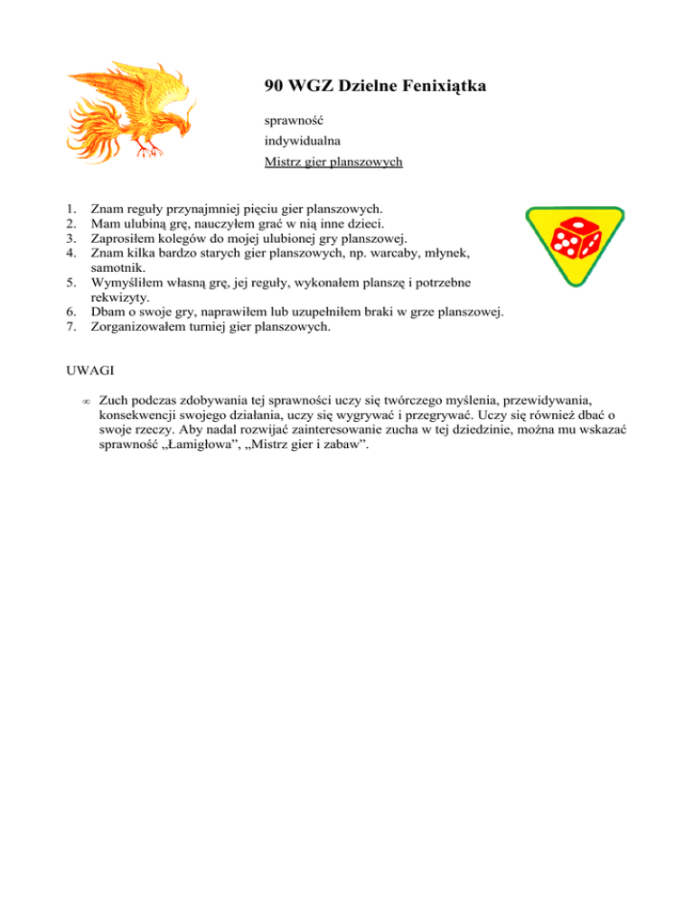 90 WGZ Dzielne Fenixiątka sprawność indywidualna Mistrz gier planszowych 1. 2. 3. 4. Znam reguły przynajmniej pięciu gier planszowych. Mam ulubiną grę, nauczyłem grać w nią inne dzieci. Zaprosiłem kolegów do mojej ulubionej gry planszowej. Znam kilka bardzo starych gier planszowych, np. warcaby, młynek, samotnik. Wymyśliłem własną grę, jej reguły, wykonałem planszę i potrzebne rekwizyty. Dbam o swoje gry, naprawiłem lub uzupełniłem braki w grze planszowej. Zorganizowałem turniej gier planszowych. 5. 6. 7. UWAGI • Zuch podczas zdobywania tej sprawności uczy się twórczego myślenia, przewidywania, konsekwencji swojego działania, uczy się wygrywać i przegrywać. Uczy się również dbać o swoje rzeczy. Aby nadal rozwijać zainteresowanie zucha w tej dziedzinie, można mu wskazać sprawność „Łamigłowa”, „Mistrz gier i zabaw”.