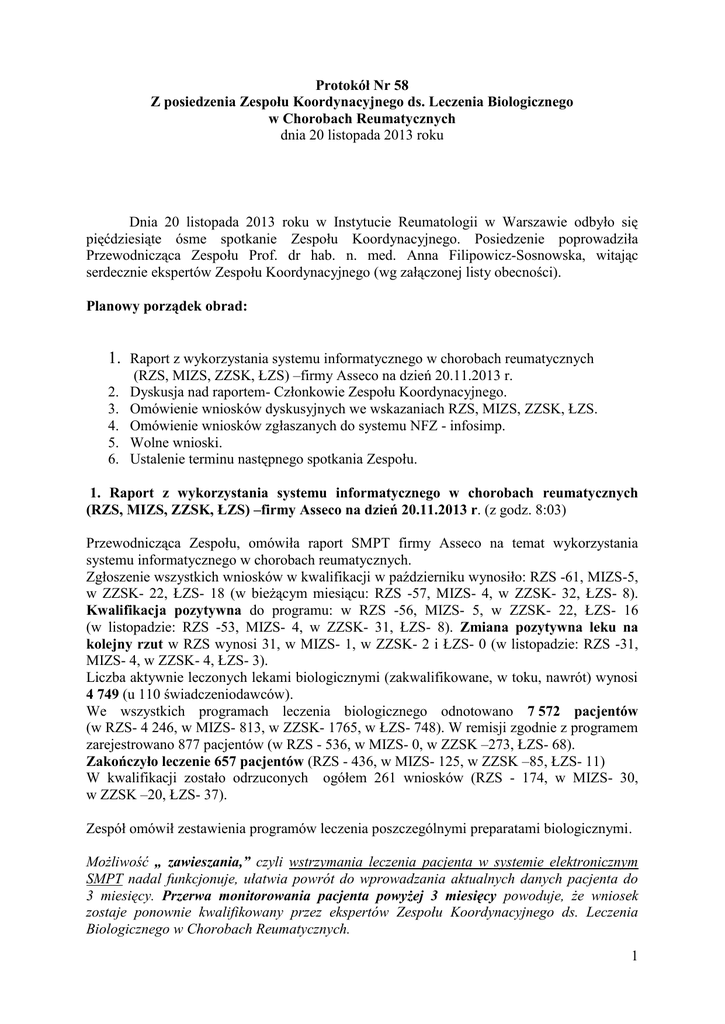 Protokół Nr 58 Z posiedzenia Zespołu Koordynacyjnego ds. Leczenia Biologicznego w Chorobach Reumatycznych dnia 20 listopada 2013 roku Dnia 20 listopada 2013 roku w Instytucie Reumatologii w Warszawie odbyło się pięćdziesiąte ósme spotkanie Zespołu Koordynacyjnego. Posiedzenie poprowadziła Przewodnicząca Zespołu Prof. dr hab. n. med. Anna Filipowicz-Sosnowska, witając serdecznie ekspertów Zespołu Koordynacyjnego (wg załączonej listy obecności). Planowy porządek obrad: 1. Raport z wykorzystania systemu informatycznego w chorobach reumatycznych 2. 3. 4. 5. 6. (RZS, MIZS, ZZSK, ŁZS) –firmy Asseco na dzień 20.11.2013 r. Dyskusja nad raportem- Członkowie Zespołu Koordynacyjnego. Omówienie wniosków dyskusyjnych we wskazaniach RZS, MIZS, ZZSK, ŁZS. Omówienie wniosków zgłaszanych do systemu NFZ - infosimp. Wolne wnioski. Ustalenie terminu następnego spotkania Zespołu. 1. Raport z wykorzystania systemu informatycznego w chorobach reumatycznych (RZS, MIZS, ZZSK, ŁZS) –firmy Asseco na dzień 20.11.2013 r. (z godz. 8:03) Przewodnicząca Zespołu, omówiła raport SMPT firmy Asseco na temat wykorzystania systemu informatycznego w chorobach reumatycznych. Zgłoszenie wszystkich wniosków w kwalifikacji w październiku wynosiło: RZS -61, MIZS-5, w ZZSK- 22, ŁZS- 18 (w bieżącym miesiącu: RZS -57, MIZS- 4, w ZZSK- 32, ŁZS- 8). Kwalifikacja pozytywna do programu: w RZS -56, MIZS- 5, w ZZSK- 22, ŁZS- 16 (w listopadzie: RZS -53, MIZS- 4, w ZZSK- 31, ŁZS- 8). Zmiana pozytywna leku na kolejny rzut w RZS wynosi 31, w MIZS- 1, w ZZSK- 2 i ŁZS- 0 (w listopadzie: RZS -31, MIZS- 4, w ZZSK- 4, ŁZS- 3). Liczba aktywnie leczonych lekami biologicznymi (zakwalifikowane, w toku, nawrót) wynosi 4 749 (u 110 świadczeniodawców). We wszystkich programach leczenia biologicznego odnotowano 7 572 pacjentów (w RZS- 4 246, w MIZS- 813, w ZZSK- 1765, w ŁZS- 748). W remisji zgodnie z programem zarejestrowano 877 pacjentów (w RZS - 536, w MIZS- 0, w ZZSK –273, ŁZS- 68). Zakończyło leczenie 657 pacjentów (RZS - 436, w MIZS- 125, w ZZSK –85, ŁZS- 11) W kwalifikacji zostało odrzuconych ogółem 261 wniosków (RZS - 174, w MIZS- 30, w ZZSK –20, ŁZS- 37). Zespół omówił zestawienia programów leczenia poszczególnymi preparatami biologicznymi. Możliwość „ zawieszania,” czyli wstrzymania leczenia pacjenta w systemie elektronicznym SMPT nadal funkcjonuje, ułatwia powrót do wprowadzania aktualnych danych pacjenta do 3 miesięcy. Przerwa monitorowania pacjenta powyżej 3 miesięcy powoduje, że wniosek zostaje ponownie kwalifikowany przez ekspertów Zespołu Koordynacyjnego ds. Leczenia Biologicznego w Chorobach Reumatycznych. 1 2. Dyskusja nad raportem- Członkowie Zespołu Koordynacyjnego. Zespół ekspertów po analizie danych statystycznych, przyjął do wiadomości ogólną informację o leczeniu biologicznym w Polsce. Ośrodki kierujące wnioski w formie papierowej do sekretariatu Zespołu Koordynacyjnego, po otrzymaniu decyzji Zespołu są proszone o przesłanie rozpatrzonego wniosku (mailem: [email protected]) w celu weryfikacji i odblokowania pacjenta w systemie. W sprawach technicznych Zespół prosi o zgłaszanie informacji przez stronę internetową ([email protected]) rejestrującą zgłaszane problemy dotyczące aplikacji SMPT. Zgłaszane problemy, będą szybciej realizowane przez NFZ dzięki podaniu danych osoby wnioskującej o zmianę w aplikacji (imię i nazwisko, LOGIN w aplikacji, niezbędny jest numer programu) przez lekarzy reumatologów lub dermatologów (koniecznie z dopisaniem numeru telefonu do kontaktu osoby zgłaszającej). Zgodnie z ustawą o ochronie danych osobowych http://www.giodo.gov.pl/ Zespół prosi o wskazywanie numeru programu pacjenta – (zamiast przekazywania PESEL pacjenta). 3. Omówienie wniosków dyskusyjnych we wskazaniach RZS, MIZS, ZZSK i ŁZS. Analiza wniosków niestandardowych RZS, ZZSK i ŁZS. Pani Profesor Anna Filipowicz-Sosnowska omówiła 9 wniosków dyskusyjnych. Analiza wniosków dyskusyjnych MIZS. Wiceprzewodnicząca Prof. Lidia Rutkowska-Sak przedstawiła 1 wniosek niestandardowy. Wszystkie omówione wnioski zostały rozpatrzone przez Zespół Koordynacyjny. Zespół Koordynacyjny prosi lekarzy wprowadzających wnioski indywidualnie do systemu SMPT po kwalifikacji: wpisanie do systemu SMPT komentarza (w opisie pacjenta) podając termin, numer decyzji rozpatrzenia wniosku na posiedzeniu Zespołu Koordynacyjnego (ponownie wysłać do akceptacji); scan wniosku z decyzją Zespołu należy przesłać do SMPT ([email protected])) w przypadku wystąpienia u pacjenta działań niepożądanych -wysłać wypełniony formularz działania niepożądanego bezpośrednio do: Departamentu Monitorowania Niepożądanych Działań Produktów Leczniczych Urząd Rejestracji Produktów Leczniczych, Wyrobów Medycznych i Produktów Biobójczych, ul. Ząbkowska 41, 03-736 Warszawa Formularz zgłoszenia niepożądanego działania produktu leczniczego dostępny jest na stronie: http:// www.urpl.gov.pl/formulndl.asp 2 4. Omówienie wniosków zgłaszanych do systemu NFZ. W obecnej sytuacji technicznej związanej z aplikacją odrzucenie wniosku o zmianę leku również nie daje możliwości wydania zgody na kontynuację leczenia - odrzucenie jest jednoznaczne z zakończeniem leczenia. W celu kontynuacji leczenia skutecznego w opinii lekarza prowadzącego można skorzystać z opcji zawieszenia leczenia - w tym celu należałoby anulować ostatnią ankietę monitorującą i zawiesić leczenie z datą z przed obowiązkowej ankiety (np. dzień po podaniu ostatniej dawki leku, ale data musi być wcześniejsza niż data wizyty, którą wskazuje system) - powód zawieszenia należy podać: remisja kliniczna. Nawet po okresie 2 tygodni można wrócić do leczenia i odwiesić pacjenta z podaniem aktualnej aktywności choroby, jeśli wystąpi zaostrzenie choroby. Wnioski o anulowanie ankiety powinny być przesyłane do Zespołu Koordynacyjnego z