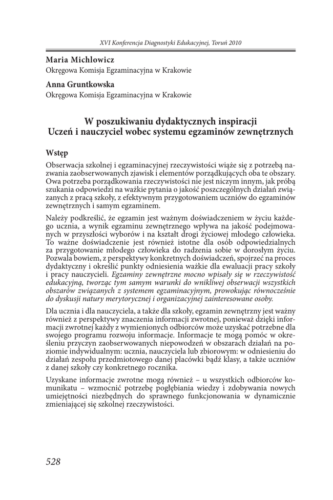 XVI Konferencja Diagnostyki Edukacyjnej, Toruń 2010 Maria Michlowicz Okręgowa Komisja Egzaminacyjna w Krakowie Anna Gruntkowska Okręgowa Komisja Egzaminacyjna w Krakowie W poszukiwaniu dydaktycznych inspiracji Uczeń i nauczyciel wobec systemu egzaminów zewnętrznych Wstęp Obserwacja szkolnej i egzaminacyjnej rzeczywistości wiąże się z potrzebą nazwania zaobserwowanych zjawisk i elementów porządkujących oba te obszary. Owa potrzeba porządkowania rzeczywistości nie jest niczym innym, jak próbą szukania odpowiedzi na ważkie pytania o jakość poszczególnych działań związanych z pracą szkoły, z efektywnym przygotowaniem uczniów do egzaminów zewnętrznych i samym egzaminem. Należy podkreślić, że egzamin jest ważnym doświadczeniem w życiu każdego ucznia, a wynik egzaminu zewnętrznego wpływa na jakość podejmowanych w przyszłości wyborów i na kształt drogi życiowej młodego człowieka. To ważne doświadczenie jest również istotne dla osób odpowiedzialnych za przygotowanie młodego człowieka do radzenia sobie w dorosłym życiu. Pozwala bowiem, z perspektywy konkretnych doświadczeń, spojrzeć na proces dydaktyczny i określić punkty odniesienia ważkie dla ewaluacji pracy szkoły i pracy nauczycieli. Egzaminy zewnętrzne mocno wpisały się w rzeczywistość edukacyjną, tworząc tym samym warunki do wnikliwej obserwacji wszystkich obszarów związanych z systemem egzaminacyjnym, prowokując równocześnie do dyskusji natury merytorycznej i organizacyjnej zainteresowane osoby. Dla ucznia i dla nauczyciela, a także dla szkoły, egzamin zewnętrzny jest ważny również z perspektywy znaczenia informacji zwrotnej, ponieważ dzięki informacji zwrotnej każdy z wymienionych odbiorców może uzyskać potrzebne dla swojego programu rozwoju informacje. Informacje te mogą pomóc w określeniu przyczyn zaobserwowanych niepowodzeń w obszarach działań na poziomie indywidualnym: ucznia, nauczyciela lub zbiorowym: w odniesieniu do działań zespołu przedmiotowego danej placówki bądź klasy, a także uczniów z danej szkoły czy konkretnego rocznika. Uzyskane informacje zwrotne mogą również – u wszystkich odbiorców komunikatu – wzmocnić potrzebę pogłębiania wiedzy i zdobywania nowych umiejętności niezbędnych do sprawnego funkcjonowania w dynamicznie zmieniającej się szkolnej rzeczywistości. 528 Teraźniejszość i przyszłość oceniania szkolnego Zatem warto podkreślić, iż znaczenie informacji zwrotnej w kształtowaniu standardów edukacyjnych jest istotne ze względu na skuteczność działań, ponieważ precyzja i skuteczność działania zależą w głównej mierze od ilości i precyzji informacji zwrotnych1. Niniejsze opracowanie zawiera rezultat analizy wypracowanych materiałów modułu drugiego Uczeń i nauczyciel wobec systemu egzaminów zewnętrznych zdalnego kursu Metodyka rozwijania umiejętności ponadprzedmiotowych. Kurs, prowadzony w trybie on-line, został zorganizowany w ramach projektu systemowego Bliżej sukcesu egzaminacyjnego realizowanego przy LSCDN w Lublinie, współfinansowanego ze środków Unii Europejskiej w ramach Europejskiego Funduszu Społecznego. Projekt obejmował swoim zasięgiem obszar województwa lubelskiego i był realizowany w ramach Priorytetu IX Rozwój wykształcenia i kompetencji w regionach, Działanie 9.4 Wysoko wykwalifikowane kadry systemu oświaty2. Cele działań dydaktycznych opisanych w ramach projektu koncentrowały się wokół zagadnień dotyczących przygotowania nauczycieli środowisk wiejskich do profesjonalnego wypełniania obowiązków nauczyciela w zakresie wykorzystania narzędzi informatycznych w różnych aspektach pracy nauczyciela, doskonalenia warsztatu pracy w zakresie metod służących kształceniu umiejętności ucznia warunkujących sukces edukacyjny, pogłębienia wiedzy o zależnościach i wzajemnym oddziaływaniu dwóch systemów oceniania szkolnego: zewnętrznego i wewnętrznego oraz ich wpływie na ocenę jakości pracy szkoły. Ważkie pytanie, jak uczyć, aby uczeń adekwatnie do swoich możliwości osiągnął sukces egzaminacyjny, pozostaje zawsze aktualne. Warto zatem podkreślić, iż szczegółowe cele drugiego modułu Uczeń i nauczyciel wobec systemu egzaminów zewnętrznych wspierające doskonalenie kultury analizowania, interpretowania i komunikowania wyników egzaminów zewnętrznych, wpisały się mocno w ogólne założenia projektu. Należy dodać, iż ogląd rzeczywistości szkolnej i egzaminacyjnej poprzez pryzmat spostrzeżeń nauczycieli biorących udział w kursie, może stać się impulsem do wprowadzenia zmian i ewaluacji przyjętych metod pracy zainteresowanych odbiorców. Nic tak nie inspiruje do twórczej pracy jak pozytywne doświadczenia kolegów nauczycieli. Niniejsze opracowanie może zatem stanowić ważny punkt odniesienia dla tych wszystkich, którzy będą formułowali pogłębione analizy osiągnięć szkolnych uczniów na podstawie uzyskanych wyników egzaminu zewnętrznego, poszukując nowego języka i nowej formuły w procesie kształcenia humanistycznego, a także poszukując odpowiedzi na istotne pytania: co należy robić? i jak to należy robić? Bernstein I. (za) Nalaskowski A, Ideologiczny gen oceny, [w:] Diagnostyka edukacyjna. Teoria i praktyka, Kraków 2004, s. 264. 1 Realizator projektu to Samorząd Województwa Lubelskiego – Lubelskie Samorządowe Centrum Doskonalenia Nauczycieli. Patronat nad projektem objął Marszałek Województwa Lubelskiego i Lubelski Kurator Oświaty. Do współpracy zaproszono również Okręgową Komisję Egzaminacyjną w Krakowie. 2 529 XVI Konferencja Diagnostyki Edukacyjnej, Toruń 2010 Charakterystyka grupy badawczej i opis II modułu kursu Propozycja tematyczna kursu została skierowana do konkretnych odbiorców nauczycieli szkół podstawowych i gimnazjów województwa lubelskiego. Na podstawie analizy raportów CKE i OKE w Krakowie z lat 2007 i 2009, badań ankietowych LSC