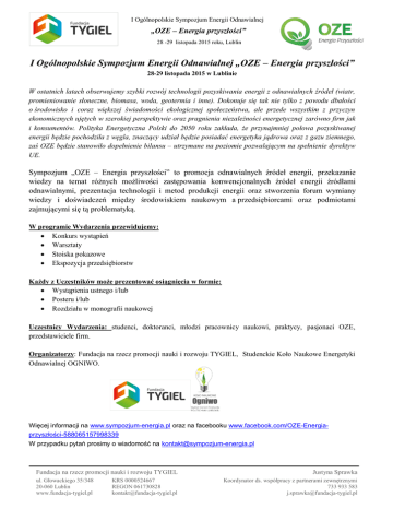 I Ogólnopolskie Sympozjum Energii Odnawialnej „OZE – Energia przyszłości” 28 -29 listopada 2015 roku, Lublin I Ogólnopolskie Sympozjum Energii Odnawialnej „OZE – Energia przyszłości” 28-29 listopada 2015 w Lublinie W ostatnich latach obserwujemy szybki rozwój technologii pozyskiwania energii z odnawialnych źródeł (wiatr, promieniowanie słoneczne, biomasa, woda, geotermia i inne). Dokonuje się tak nie tylko z powodu dbałości o środowisko i coraz większej świadomości ekologicznej społeczeństwa, ale przede wszystkim z przyczyn ekonomicznych ujętych w szerokiej perspektywie oraz pragnienia niezależności energetycznej zarówno firm jak i konsumentów. Polityka Energetyczna Polski do 2050 roku zakłada, że przynajmniej połowa pozyskiwanej energii będzie pochodziła z węgla, znaczący udział będzie posiadać energetyka jądrowa oraz z gazu ziemnego, zaś OZE będzie stanowiło dopełnienie bilansu – utrzymane na poziomie pozwalającym na spełnienie dyrektyw UE. Sympozjum „OZE – Energia przyszłości” to promocja odnawialnych źródeł energii, przekazanie wiedzy na temat różnych możliwości zastępowania konwencjonalnych źródeł energii źródłami odnawialnymi, prezentacja technologii i metod produkcji energii oraz stworzenia forum wymiany wiedzy i doświadczeń między środowiskiem naukowym a przedsiębiorcami oraz podmiotami zajmującymi się tą problematyką. W programie Wydarzenia przewidujemy: Konkurs wystąpień Warsztaty Stoiska pokazowe Ekspozycja przedsiębiorstw Każdy z Uczestników może prezentować osiągnięcia w formie: Wystąpienia ustnego i/lub Posteru i/lub Rozdziału w monografii naukowej Uczestnicy Wydarzenia: studenci, doktoranci, młodzi pracownicy naukowi, praktycy, pasjonaci OZE, przedstawiciele firm. Organizatorzy: Fundacja na rzecz promocji nauki i rozwoju TYGIEL, Studenckie Koło Naukowe Energetyki Odnawialnej OGNIWO. Więcej informacji na www.sympozjum-energia.pl oraz na facebooku www.facebook.com/OZE-Energiaprzyszłości-588065157998339 W przypadku pytań prosimy o wiadomość na [email protected] Fundacja na rzecz promocji nauki i rozwoju TYGIEL ul. Głowackiego 35/348 20-060 Lublin www.fundacja-tygiel.pl KRS 0000524667 REGON 061730828 [email protected] Justyna Sprawka Koordynator ds. współpracy z partnerami zewnętrznymi 733 933 583 [email protected]