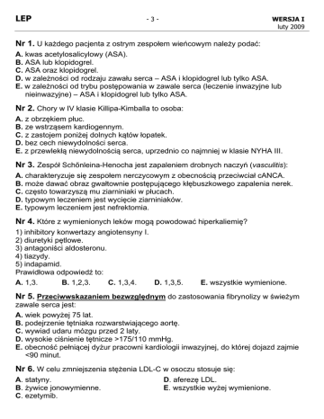 LEP -3- WERSJA I luty 2009 Nr 1. U każdego pacjenta z ostrym zespołem wieńcowym należy podać: A. kwas acetylosalicylowy (ASA). B. ASA lub klopidogrel. C. ASA oraz klopidogrel. D. w zależności od rodzaju zawału serca – ASA i klopidogrel lub tylko ASA. E. w zależności od trybu postępowania w zawale serca (leczenie inwazyjne lub nieinwazyjne) – ASA i klopidogrel lub tylko ASA. Nr 2. Chory w IV klasie Killipa-Kimballa to osoba: A. z obrzękiem płuc. B. ze wstrząsem kardiogennym. C. z zastojem poniżej dolnych kątów łopatek. D. bez cech niewydolności serca. E. z przewlekłą niewydolnością serca, uprzednio co najmniej w klasie NYHA III. Nr 3. Zespół Schőnleina-Henocha jest zapaleniem drobnych naczyń (vasculitis): A. charakteryzuje się zespołem nerczycowym z obecnością przeciwciał cANCA. B. może dawać obraz gwałtownie postępującego kłębuszkowego zapalenia nerek. C. często towarzyszą mu ziarniniaki w płucach. D. typowym leczeniem jest wycięcie ziarniniaków. E. typowym leczeniem jest nefrektomia. Nr 4. Które z wymienionych leków mogą powodować hiperkaliemię? 1) inhibitory konwertazy angiotensyny I. 2) diuretyki pętlowe. 3) antagoniści aldosteronu. 4) tiazydy. 5) indapamid. Prawidłowa odpowiedź to: A. 1,3. B. 1,2,3. C. 1,3,4. D. 1,3,5. E. wszystkie wymienione. Nr 5. Przeciwwskazaniem bezwzględnym do zastosowania fibrynolizy w świeżym zawale serca jest: A. wiek powyżej 75 lat. B. podejrzenie tętniaka rozwarstwiającego aortę. C. wywiad udaru mózgu przed 2 laty. D. wysokie ciśnienie tętnicze >175/110 mmHg. E. obecność pełniącej dyżur pracowni kardiologii inwazyjnej, do której dojazd zajmie <90 minut. Nr 6. W celu zmniejszenia stężenia LDL-C w osoczu stosuje się: A. statyny. B. żywice jonowymienne. C. ezetymib. D. aferezę LDL. E. wszystkie wyżej wymienione. LEP -4- WERSJA I luty 2009 Nr 7. Zespół objawów nasuwających podejrzenie nadciśnienia naczyniowonerkowego to: A. otyłość, senność i uczucie zmęczenia w ciągu dnia, poranny ból głowy, brak tętna na tętnicach udowych. B. zmiany zanikowe skóry z rozstępami, nadmierne owłosienie, skłonność do wybroczyn, chude kończyny. C. napadowy wzrost ciśnienia tętniczego z blednięciem powiek, zlewnymi potami, kołataniem serca i niepokojem. D. ciężkie, oporne na leczenie nadciśnienie, nadciśnienie złośliwe, zwłaszcza szmer naczyniowy w nadbrzuszu. E. rodzinne występowanie chorób nerek, nawracające zakażenia układu moczowego, nadużywanie leków przeciwbólowych. Nr 8. Najskuteczniejszym sposobem leczenia częstoskurczu nawrotnego węzłowego (AVNRT) jest: A. porada psychologa i ewentualnie terapia grupowa. B. leczenie chirurgiczne. C. ablacja przezskórna. D. leczenie antybiotykami z grupy cefalosporyn. E. leczenie atropiną. Nr 9. 28-letni mężczyzna, zawodnik klubu sportowego piłki nożnej, zgłosił się do szpitala z powodu kłującego bólu w klatce piersiowej utrzymującego się od kilku dni. Ból nasila się przy oddychaniu. W badaniu przedmiotowym nadmiernie jawny odgłos opukowy oraz osłabienie szmeru pęcherzykowego. Próba tuberkulinowa 10 mm; OB 15mm; liczba krwinek białych 8 tys.; liczba płytek 200 tys.; D-dimer 500; wskaźnik protrombinowy 90%. Które rozpoznanie jest najbardziej prawdopodobne? A. gruźlicze zapalenie opłucnej. B. jama pogruźlicza. C. przewlekła zatorowość płucna. D. odma opłucnowa. E. suche zapalenie opłucnej. Nr 10. Chora lat 46 przyjęta z powodu suchego kaszlu, z towarzyszącym uczuciem duszności, zwyżki ciepłoty ciała do 38oC. Objawy utrzymywały się od kilku dni. W badaniu przedmiotowym bez odchyleń. Dodatnie testy skórne na kurz i roztocza. W badaniu spirometrycznym FVC 70% w.n., FEV1%VC 75%, prawidłowa reaktywność mieśni gładkich. W obrazie RTG płuc obraz zmian śródmiąższowych. Hb 11g/dl, bilirubina 2 mg%, CRP 32 (n10). Które rozpoznanie jest najbardziej prawdopodobne? A. zaostrzenie astmy. D. pneumokokowe zapalenie płuc. B. zaostrzenie POChP. E. mykoplazmatyczne zapalenie płuc. C. przeziębienie. LEP -5- WERSJA I luty 2009 Nr 11. Do czynników ryzyka rozwoju raka trzustki należą: 1) palenie tytoniu; 2) ostre zapalenie trzustki; 3) przewlekłe zapalenie trzustki; Prawidłowa odpowiedź to: A. 2,3,4. B. 1,3,4. C. 1,2,3,4. 4) predyspozycja genetyczna; 5) AIDS. D. 1,2,4. E. wszystkie wymienione. Nr 12. Stłumiony odgłos opukowy świadczy o zmniejszonej powietrzności tkanki płucnej spowodowanej przez: 1) zapalenie płuc; 2) płyn w jamie opłucnej; 3) rozedmę płuc; Prawidłowa odpowiedź to: A. 1,5,6. B. 2,4. C. 1,2,4. 4) niedodmę; 5) odmę; 6) rozdęcie płuc. D. 4,5,6. E. wszystkie wymienione. Nr 13. Które z leków przeciwprątkowych zaliczamy do leków I rzutu? 1) izoniazyd; 2) etionamid; 3) streptomycyna; Prawidłowa odpowiedź to: A. 1,2,3. B. 1,2,4. C. 2,4,5. D. 1,3,5. 4) fluorochinolony; 5) etambutol. E. żadna z odpowiedzi nie jest prawidłowa. Nr 14. Skuteczność antybiotykoterapii zakażenia H. pylori za pomocą mocznikowego testu oddechowego zaleca się oceniać po zakończeniu leczenia: A. po 1 tygodniu. B. po 2 tygodniach. C. po 6 tygodniach. D. po 6 miesiącach. E. po 12 miesiącach. Nr 15. 53 - letni mężczyzna z wieloletnią chorobą refluksową przełyku skarży się na nasilenie od kilku tygodni uczucia palenia przełyku (nasilającego się w godzinach nocnych) z towarzyszącym okresowo bólem przy przełykaniu (szczególnie pokarmów stałych). Chory leczony okresowo preparatami IPP w dawkach standardowych oraz środkami zobojętniającymi kwas solny. Lekarz rodzinny powinien w tym przypadku: A. zalecić spanie w pozycji z uniesioną górną połową ciała. B. zwiększyć dawkę przyjmowanych preparatów IPP. C. zwiększyć dawkę przyjmowanych preparatów IPP oraz dołączyć przed snem preparat H2-blokera. D. zlecić pilną gastrofiberoskopię. E. zlecić rtg górnego odcinka przewodu pokarmowego. LEP -6- WERSJA I luty 2009 Nr 16. Rak tarczycy wywodzący
