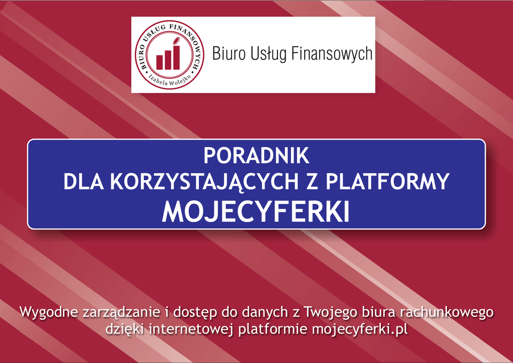 Biuro Us³ug Finansowych Biuro Us³ug Finansowych PORADNIK DLA KORZYSTAJ¥CYCH Z PLATFORMY MOJECYFERKI Wygodne zarz¹dzanie i dostêp do danych z Twojego biura rachunkowego dziêki internetowej platformie mojecyferki.pl Biuro Us³ug Finansowych Krok Krok Krok Krok Krok Krok 1. 2. 3. 4. 5. 6. Zaloguj siê do platformy mojecyferki.pl.........................2 Dodaj dokumenty i stwórz swój w³asny e-segregator..........5 Zarz¹dzaj p³atnoœciami .............................................9 Twój segregator on-line ............................................12 Zlecanie spraw do biura rachunkowego..........................13 Importowanie faktur ................................................15 Skróty nazw dokumentów..........................................16 -1- Krok 1. Zaloguj siê do platformy mojecyferki.pl Biuro Us³ug Finansowych Aby zalogowaæ siê na platformie www.mojecyferki.pl nale¿y przejœæ przez 2 etapy rejestracji. W tym celu w menu g³ównym klikamy w miejsce z opisem „Zarejestruj firmê on-line”.Pojawia nam siê okienko, w którym nale¿y wype³niæ pola obowi¹zkowe takie jak imiê i nazwisko, numer telefonu (numer ten powinien byæ aktualny gdy¿ na niego bêd¹ wysy³ane wszelkie powiadomienia z biura rachunkowego) oraz e-mail i has³o (minimum 7 znaków i jedna cyfra). Adres e-mail nale¿y podaæ w³asny, poniewa¿ na ten adres bêd¹ przychodzi³y wszelkie powiadomienia z biura oraz link aktywacyjny. Aby siê zalogowaæ nale¿y otworzyæ wiadomoœæ e-mail. Zawiera ona login do www.mojecyferki.pl (najczêœciej jest nim wpisany adres e-mail). Aby dokoñczyæ rejestracje nale¿y wype³niæ 2 etap a mianowicie uzupe³niæ dane firmy. W przypadku wpisania b³êdnych danychadministrator systemu, czyli w³aœciciel Biura mo¿e poprawiæ dane. 1. Mo¿liwoœæ zmiany jêzyka na angielski b¹dŸ rosyjski 2. Pola oznaczone gwiazdk¹ nale¿y obowi¹zkowo wype³niæ, uzupe³nienia nie wymaga pole z numer tel. stacjonarnego oraz dwie ostatnie pozycje a mianowicie kod promocyjny (w przypadku promocji) i numer polecaj¹cy ( w przypadku rejestracji z polecenia - nale¿y wpisaæ numer osoby z programu partnerskiego polecaj¹cego program). 3. Pole potwierdzaj¹ce akceptacjê regulaminu systemu z którym nale¿y zapoznaæ siê poprzez naciœniêcie myszk¹ na pogrubiony napis „regulamin”. Pole to jest obowi¹zkowe do przejœcia do dalszej rejestracji. 4. Nale¿y przepisaæ numer weryfikacyjny w pole znajduj¹ce siê obok. 5. W sytuacji gdy system bêdzie odrzuca³ dany kod nale¿y go odœwie¿yæ u¿ywaj¹c przycisku obok „odœwie¿” 6. Potwierdzenie naszych danych oraz has³a i maila. -2- Krok 1. Zaloguj siê do platformy mojecyferki.pl Biuro Us³ug Finansowych Po nastêpuj¹cych czynnoœciach powinno pojawiæ siê okienko informuj¹ce nas o potrzebie aktywacji linku poprzez odebranie poczty na wskazany przez nas adres e-mail. Teraz nale¿y przejœæ do swojego programu pocztowego e-mail, odnaleŸæ e-maila z platformy mojecyferki.pl i potwierdziæ rejestracjê klikaj¹c w link, który zawarty jest w tym e-mailu. -3- Krok 1. Zaloguj siê do platformy mojecyferki.pl Biuro Us³ug Finansowych Po klikniêciu w dany link program przekierowuje nas do 2 etapu rejestracji. 1. 2. 3. 4. 5. 6. 7. Drugi etap dotyczy danych firmy, nale¿y pamiêtaæ ¿e w takie pola jak miejscowoœæ, kod pocztowy, ulica itp. wpisujemy dane firmy nie prywatne. W sytuacji spó³ki nale¿y zaznaczyæ opcjê „spó³ka”, w pozosta³ych sytuacjach pozostaj¹ domyœlnie ustawienia(osoba fizyczna). Zaznaczamy odpowiednio jeden z trzech dostêpnych wariantów rozliczenia podatkowego. W sytuacji gdy ktoœ jest p³atnikiem VAT powinien zaznaczyæ opcjê „tak”, w przeciwnym wypadku opcjê drug¹. Mo¿liwoœæ do³¹czenia skanu dowolnego pliku zapisanego na komputerze poprzez skorzystanie z opcji przegl¹daj. Po czym znajdujemy nasz plik w komputerze i klikamy na niego, po czym powinien za³adowaæ siê on automatycznie. Jak w etapie poprzednim mo¿liwoœæ przeczytania umowy poprzez naciœniecie na miejsce ”umowa” po czym nale¿y zaznaczyæ ”akceptujê umowê” Klikamy na „dalej” aby zakoñczyæ rejestracjê. -4- Krok 2. Dodaj dokumenty i stwórz swój w³asny e-segregator Biuro Us³ug Finansowych Za pomoc¹ platformy www.mojeCyferki.pl mo¿esz samodzielnie wprowadziæ swoje dokumenty ksiêgowe dziêki czemu oszczêdzasz 20% w op³acie za us³ugi ksiêgowe oraz tworzysz swój e-segregator, do którego masz dostêp zawsze gdy mo¿esz skorzystaæ z internetu. Platforma umo¿liwia wprowadzenie: - faktur zakupu, - faktur sprzeda¿y, - faktur sprzeda¿y- mar¿a, - zestawieñ sprzeda¿y z kasy fiskalnej, - wyci¹gów bankowych (dla potrzebuj¹cych dyskrecji: tylko prowizji i odsetek bankowych) - importu faktur (dla firm korzystaj¹cych z programów magazynowych wf-mag WAPRO i EwaStreamsoftu) automatyczny transfer dokumentów magazynowych zakupu i sprzeda¿y - rachunków lub umów kupna-sprzeda¿y dokumentów nie-vatowskich - potwierdzeñ przelewów zus i podatków (niezbêdnych do przygotowania deklaracji miesiêcznych i rocznych) -5- Krok 2. Dodaj dokumenty i stwórz swój w³asny e-segregator Biuro Us³ug Finansowych Po op³aceniu ZUS-u/podatku powinieneœ przes³aæ do biura rachunkowego potwierdzenie tej op³aty/przelewu. W tym celu korzystasz z zak³adki e-ksiêgowoœæ z której wybierasz wiersz „potwierdzenie przelewu ZUS/podatki” poprzez 2-krotne klikniêcie na niego kursorem myszki. 1. 2. 3. 4. 5. 6. 7. dodaj skan dowolnego dokumentu zapisanego na komputerze, poprzez 2krotne naciœniecie na niego po uprzednim odnalezieniu jego, wybierz typ p³atnoœci z dostêpnych wariantów, okreœl jakiego okresu dotyczy p³atnoœæ, mo¿esz dodaæ w³asne uwagi, po wype³nieniu wszystkich pól zatwierdŸ dokument, mo¿esz u¿yæ podpisu elektronicznego je¿eli masz tak¹ mo¿liwoœæ, je¿eli chcesz potwierdziæ dodanie dokumentu i utworzyæ kolejny Dokument w ten sposób wprowadzony znajdzi