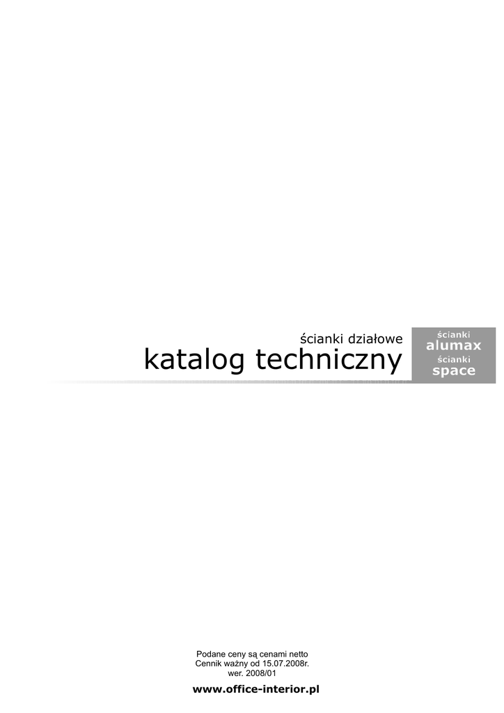 ścianki działowe katalog techniczny Podane ceny są cenami netto Cennik ważny od 15.07.2008r. wer. 2008/01 www.office-interior.pl ścianki alumax ścianki space ALUMAX - przegrody OPIS KONSTRUKCJI szyba bezpieczna, dźwiękochłonna, za dopłatą dodatkowo żaluzje płyta wiórowa, tapicerowana pianką i tkaniną konstrukcja aluminiowa malowana proszkowo na kolor RAL 9006 klip zamykający o przekroju 1/2 koła przegrody ALUMAX WIDOK I RZUT OBIEKTU h A tkanina szyba 4mm hartowana h WYMIARY (cm) NUMER KATALOGOWY CENA NETTO PLN Szer. A Wys. 70 150 Pal 01 art.01 900 80 150 Pal 01 art.02 960 120 150 Pal 01 art.03 1100 140 150 Pal 01 art.04 1180 160 150 Pal 01 art.05 1260 70 150 Pal 02 art.01 1210 80 150 Pal 02 art.02 1300 120 150 Pal 02 art.03 1450 140 150 Pal 02 art.04 1600 160 150 Pal 02 art.05 1700 70 150 Pal 03 art.01 1260 80 150 Pal 03 art.02 1350 120 150 Pal 03 art.03 1620 140 150 Pal 03 art.04 1790 160 150 Pal 03 art.05 1950 80 50 Pal 04 art.01 640 120 50 Pal 04 art.02 900 140 50 Pal 04 art.03 980 160 50 Pal 04 art.04 1040 tkanina A szyba 4mm hartowana wraz z żaluzją h tkanina A przegroda blat biurka słupek łączący 60mm x 60mm x 1mb słupek łączący fi 80 mm x 1mb 120 zł /mb 150 zł / mb ścianki PAL 01, 02, 03 posiadają wypełnienie dwustronne 3 ALUMAX - ściany działowe OPIS KONSTRUKCJI szyba bezpieczna, dźwiękochłonna lub płyta melaminowana, wypełnienie jednostronne konstrukcja aluminiowa malowana proszkowo na kolor RAL 9006 alumax ściany - możliwośa wysokość zabudowy max do 2,8m - szklenie jednostronne szybą bezpieczną oraz dźwiękochłonną - dolne wypełnienie płyta melaminowa 18mm wg. wzornika DF - kolor konstrukcji standardowy RAL 9006 - maksymalna szerokość pomiędzy słupkami 140cm - możliwość zamontowania żaluzji regulowanej - opcjonalnie piaskowanie szyb wg. wzoru dostarczonego przez klienta (format pliku .cdr) alumax drzwi skrzydłowe - bez poprzeczki, bez progu, wyposażone w zamek, klamkę i zawiaz, drudie skrzydło nieaktywne, blokowane ryglami - drzwi jednoskrzydłowe rozwierne - światło przejścia 80cm x 90cm x 100cm - drzwi dwuskrzydłowe rozwierne _ światło przejścia (po otwarciu) 125cm x 175cm x 225cm alumax drzwi przesuwne - bez poprzeczki, wyposażone w zamek hakowy, pochwyt kubełkowy, mechanizm przesuwny (wózki do drzwi przesuwnych + prowadnica i listwa maskująca z zaślepkami) drzwi wyposażone w uszczelkę szczotkową - drzwi jednoskrzydłowe przesuwne - światło przejścia 80cm x 90cm x 100cm - drzwi dwuskrzydłowe przesuwne - światło przejścia 175cm x 225cm ściany działowe ALUMAX WYMIARY (cm) WIDOK I RZUT OBIEKTU A Wys. NUMER KATALOGOWY CENA NETTO PLN Szer. A 400 250 Alu 01 art.01 6500 400 280 Alu 01 art.02 7280 cena jednostkowa od 650 do 800 za m w zależności od rodzaju wypełnień Alu 01 2 moduł alumax A 80 210 Alu 02 art.01 2450 90 210 Alu 02 art.02 2550 100 210 Alu 02 art.03 2650 150 210 Alu 03 art.01 4250 200 210 Alu 03 art.02 4550 250 210 Alu 03 art.03 5050 100 210 Alu 04 art.01 2750 110 210 Alu 04 art.02 2850 120 210 Alu 04 art.03 2950 200 210 Alu 05 art.01 4650 250 210 Alu 05 art.02 5050 podchwyt dodatek_01 440 samodomykacz dodatek_02 480 piaskowanie szyb dodatek_03 160/m2 żaluzja dodatek_04 170/m2 Alu 02 drzwi jednoskrzydłowe A Alu 03 drzwi dwuskrzydłowe A Alu 04 drzwi przesuwne jednoskrzydłowe A Alu 05 drzwi przesuwne dwuskrzydłowe dodatki do ścianek ALUMAX 5 SPACE OPIS KONSTRUKCJI Poliwenglan komorowy słupek łączący wypełnienie laminat bądź tkanina wg. wzornika DF Krawędzie wykończone PCV, kolorystyka wg. Wzornika DF melamina kolorystyka tkaniny: wg. wzornika DF kolorystyka PCV: wg. Wzornika DF melamina kolorystyka laminatuHPL: wg. wzornika DF 6 ścianki SPACE WYMIARY (cm) WIDOK I RZUT OBIEKTU h A 70 150 Space 01 art.01 580 80 150 Space 01 art.02 660 120 150 Space 01 art.03 990 70 150 Space 02 art.01 735 80 150 Space 02 art.02 840 120 150 Space 02 art.03 1260 140 150 Space 03 art.01 1470 160 150 Space 03 art.02 1680 180 150 Space 03 art.03 1890 Tkanina poliwenglan komorowy h A NUMER KATALOGOWY CENA NETTO PLN Szer. A Wys. tkanina poliwenglan komorowy h A słupek łączący 110mm x 110mm tkanina Słupek SPACE 120 cm 420 Słupek SPACE 150 cm 450 Stopa ścianki wolnostojącej 100 7 ścianki SPACE WYMIARY (cm) WIDOK I RZUT OBIEKTU Szer. A 70 80 h 120 laminat HPL 140 160 A NUMER KATALOGOWY CENA NETTO PLN 150 120 Space 04 art.01 Space 04 art.02 Space 04 art.03 Space 04 art.04 Space 04 art.05 Space 04 art.06 Space 04 art.07 550 690 630 780 940 1170 1100 120 Space 04 art..08 1250 120 150 120 Space 05 art.01 Space 05 art.02 Space 05 art.03 Space 05 art.04 Space 05 art.05 Space 05 art.06 Space 05 art.07 590 740 680 840 1010 1260 1180 120 Space 05 art..08 1350 Wys. 120 150 120 150 120 Przy szerokościach 140 i 160 usłojenie poziome 70 10cm 80 h 120 laminat HPL 140 przefrezowanie dwustronne na zewnętrznych i wewnętrznych płaszczyznach ścianki A Przy szerokościach 140 i 160 usłojenie poziome słupek łączący 110mm x 110mm 160 150 120 150 120 Słupek SPACE 120 cm 420 Słupek SPACE 150 cm 450 Stopa ścianki wolnostojącej 100 8
