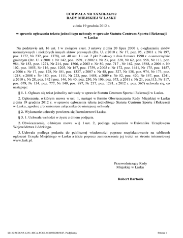 UCHWAŁA NR XXXIII/332/12 RADY MIEJSKIEJ W ŁASKU z dnia 19 grudnia 2012 r. w sprawie ogłoszenia tekstu jednolitego uchwały w sprawie Statutu Centrum Sportu i Rekreacji w Łasku Na podstawie art. 16 ust. 1 w związku z ust. 3 ustawy z dnia 20 lipca 2000 r. o ogłaszaniu aktów normatywnych i niektórych innych aktów prawnych (Dz. U. z 2010 r. Nr 17, poz. 95, z 2011 r. Nr 197, poz. 1172, Nr 232, poz. 1378), art. 40 ust. 1 i ust. 2 pkt 2 ustawy z dnia 8 marca 1990 r. o samorządzie gminnym (Dz. U. z 2001 r. Nr 142, poz. 1591, z 2002 r. Nr 23, poz. 220, Nr 62, poz. 558, Nr 113, poz. 984, Nr 153, poz. 1271, Nr 214, poz. 1806, z 2003 r. Nr 80, poz. 717 , Nr 162, poz. 1568, z 2004 r. Nr 102, poz. 1055, Nr 116, poz. 1203, Nr 167, poz. 1759, z 2005 r. Nr 172, poz. 1441, Nr 175, poz. 1457, z 2006 r. Nr 17, poz. 128, Nr 181, poz. 1337, z 2007 r. Nr 48, poz. 327, Nr 138, poz. 974, Nr 173, poz. 1218, z 2008 r. Nr 180, poz. 1111, Nr 223, poz. 1458, z 2009 r. Nr 52, poz. 420, Nr 157, poz. 1241, z 2010 r. Nr 28, poz. 142 i poz. 146, Nr 40, poz. 230, Nr 106, poz. 675, z 2011 r. Nr 21, poz.113, Nr 117, poz. 679, Nr 134, poz. 777, Nr 149, poz. 887, Nr 217, poz. 1281, z 2012 r. poz. 567) uchwala się, co następuje: § 1. 1. Ogłasza się tekst jednolity uchwały w sprawie Statutu Centrum Sportu i Rekreacji w Łasku. 2. Ogłoszenie, o którym mowa w ust. 1, nastąpi w formie Obwieszczenia Rady Miejskiej w Łasku z dnia 19 grudnia 2012 r. w sprawie ogłoszenia tekstu jednolitego Statutu Centrum Sportu i Rekreacji w Łasku, zgodnie z brzmieniem załącznika do niniejszej uchwały. § 2. Wykonanie uchwały powierza się Burmistrzowi Łasku. § 3. 1. Uchwała wchodzi w życie z dniem podjęcia. 2. Obwieszczenie, o którym mowa w § 1 ust. 2, podlega ogłoszeniu w Dzienniku Urzędowym Województwa Łódzkiego. 3. Uchwała podlega podaniu do publicznej wiadomości poprzez rozplakatowanie na tablicach ogłoszeń Urzędu Miejskiego w Łasku a także poprzez zamieszczenie jej treści na stronie internetowej www.lask.pl. Przewodniczący Rady Miejskiej w Łasku Robert Bartosik Id: 3C5C06A9-1253-40CA-8C66-65210BDB564F. Podpisany Strona 1 Załącznik do Uchwały Nr XXXIII/332/12 Rady Miejskiej w Łasku z dnia 19 grudnia 2012 r. Obwieszczenie Rady Miejskiej w Łasku z dnia 19 grudnia 2012 r. w sprawie ogłoszenia tekstu jednolitego uchwały w sprawie Statutu Centrum Sportu i Rekreacji w Łasku 1. Na podstawie art. 16 ust. 4 ustawy z dnia 20 lipca 2000 r. o ogłaszaniu aktów normatywnych i niektórych innych aktów prawnych (Dz. U. z 2010 r. Nr 17, poz. 95, z 2011 r. Nr 197, poz. 1172, Nr 232, poz. 1378) ogłasza się tekst jednolity uchwały Nr IV/28/11 Rady Miejskiej w Łasku z dnia 26 stycznia 2011 r. w sprawie uchwalenia Statutu Centrum Sportu i Rekreacji w Łasku (Dz. Urz. Woj. Łódzkiego z 2011 r. Nr 47, poz. 417 ) z uwzględnieniem zmian wprowadzonych: 1) uchwałą Nr XIX/173/11 Rady Miejskiej w Łasku z dnia 21 grudnia 2011 r. w sprawie wprowadzenia zmiany w Statucie Centrum Sportu i Rekreacji w Łasku (Dz. Urz. Woj. Łódzkiego z 2012 r. poz. 410); 2) uchwałą Nr XXI/181/12 Rady Miejskiej w Łasku z dnia 18 stycznia 2012 r. zmieniającą uchwałę Nr XIX/173/11 w sprawie wprowadzenia zmiany w Statucie Centrum Sportu i Rekreacji w Łasku (Dz. Urz. Woj. Łódzkiego z 2012 r. poz. 411). Przewodniczący Rady Miejskiej w Łasku Robert Bartosik Id: 3C5C06A9-1253-40CA-8C66-65210BDB564F. Podpisany Strona 1 Załącznik do Obwieszczenia Rady Miejskiej w Łasku z dnia 19 grudnia 2012 r. w sparwie ogłoszenia tekstu jednolitego uchwały w sprawie Statutu Centrum Sportu i Rekreacji w Łasku UCHWAŁA NR IV/28/11 RADY MIEJSKIEJ W ŁASKU z dnia 26 stycznia 2011r. w sprawie uchwalenia Statutu Centrum Sportu i Rekreacji w Łasku Na podstawie art. 40 ust. 2 pkt. 2 ustawy z dnia 8 marca 1990 r. o samorządzie gminnym (Dz. U. z 2001 r. Nr 142, poz. 1591, z 2002 r. Nr 23, poz. 220, Nr 62, poz. 558, Nr 113, poz. 984, Nr 153, poz. 1271, Nr 214, poz. 1806, z 2003 r. Nr 80, poz. 717, Nr 162, poz. 1568, z 2004 r. Nr 102, poz. 1055, Nr 116, poz. 1203, Nr 167, poz. 1759, z 2005 r. Nr 172, poz. 1441, Nr 175, poz. 1457, z 2006 r. Nr 17, poz. 128, Nr 181, poz. 1337, z 2007 r. Nr 48, poz. 327, Nr 138, poz. 974, Nr 173, poz. 1218, z 2008 r. Nr 180, poz. 1111, Nr 223, poz. 1458, z 2009 r. Nr 52, poz. 420, Nr 157, poz. 1241, z 2010 r. Nr 28, poz. 142 i poz. 146, Nr 40, poz. 230, Nr 106, poz. 675, z 2011 r. Nr 21, poz. 113, Nr 117, poz. 679, Nr 134, poz. 777, Nr 149, poz. 887, Nr 217, poz. 1281, z 2012 r. poz. 567) oraz art. 12 ust. 1 i ust. 2 ustawy z dnia 27 sierpnia 2009 r. o finansach publicznych (Dz. U. Nr 157, poz. 1240, z 2010 r. Nr 28, poz. 146, Nr 96, poz. 620, Nr 123, poz. 835, Nr 152, poz. 1020, Nr 238, poz. 1578, Nr 257, poz. 1726, z 2011 r. Nr 185, poz. 1092, Nr 201, poz. 1183, Nr 234, poz. 1386, Nr 240, poz. 1429, Nr 291, poz. 1707) uchwala się, co następuje: § 1. Uchwala się Statut jednostki budżetowej Centrum Sportu i Rekreacji w Łasku, stanowiacy załącznik do niniejszej uchwały. § 2. Wykonanie uchwały powierza się Burmistrzowi Łasku. § 3. Traci moc załącznik do uchwały Nr XXVIII/397/05 Rady Miejskiej w Łasku z dnia 7 września 2005 r. w sprawie połączenia jednostek organizacyjnych Gminy Łask tj. "Ośrodka Sportu i Rekreacji" i Miejskiej Pływalni Krytej w "Centrum Sportu i Rekreacji" (Dz. Urz. Woj. Łódzkiego Nr 314, poz. 2912). § 4. Uchwała podlega ogłoszeniu w Dzienniku Urzędowym Województwa Łódzkiego i wchodzi w życie po upływie 14 dni od dnia ogłoszenia. STATUT CENTRUM SPORTU I REKREACJI W ŁASKU Rozdział 1. Postanowienia ogólne § 1. 1. Centrum Sportu i Rekreacji w Łasku, zwane dalej „centrum” jest jednostką budżetową Gminy Łask. 2. Bezpośredni nadzór nad centrum sprawuje Burmistrz Łasku. 3. Zakresem terytorialnego działania centrum jest Gmina Łask. 4. Siedziba centrum mieści się w Łasku przy ul. Armii Krajowej 5a. Id: 3C5C06A9-1253-40CA-8C66-65210BDB564F. Podpisany Stro