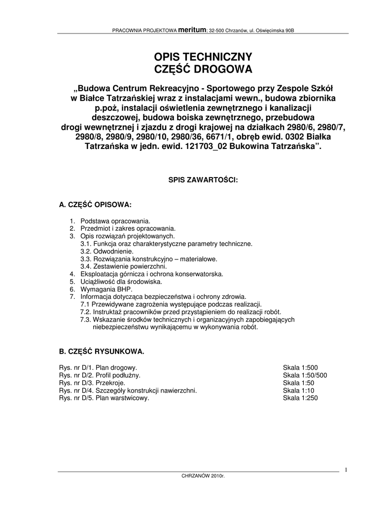 PRACOWNIA PROJEKTOWA meritum; 32-500 Chrzanów, ul. Oświęcimska 90B OPIS TECHNICZNY CZĘŚĆ DROGOWA „Budowa Centrum Rekreacyjno - Sportowego przy Zespole Szkół w Białce Tatrzańskiej wraz z instalacjami wewn., budowa zbiornika p.poż, instalacji oświetlenia zewnętrznego i kanalizacji deszczowej, budowa boiska zewnętrznego, przebudowa drogi wewnętrznej i zjazdu z drogi krajowej na działkach 2980/6, 2980/7, 2980/8, 2980/9, 2980/10, 2980/36, 6671/1, obręb ewid. 0302 Białka Tatrzańska w jedn. ewid. 121703_02 Bukowina Tatrzańska”. SPIS ZAWARTOŚCI: A. CZĘŚĆ OPISOWA: 1. Podstawa opracowania. 2. Przedmiot i zakres opracowania. 3. Opis rozwiązań projektowanych. 3.1. Funkcja oraz charakterystyczne parametry techniczne. 3.2. Odwodnienie. 3.3. Rozwiązania konstrukcyjno – materiałowe. 3.4. Zestawienie powierzchni. 4. Eksploatacja górnicza i ochrona konserwatorska. 5. Uciążliwość dla środowiska. 6. Wymagania BHP. 7. Informacja dotycząca bezpieczeństwa i ochrony zdrowia. 7.1 Przewidywane zagrożenia występujące podczas realizacji. 7.2. Instruktaż pracowników przed przystąpieniem do realizacji robót. 7.3. Wskazanie środków technicznych i organizacyjnych zapobiegających niebezpieczeństwu wynikającemu w wykonywania robót. B. CZĘŚĆ RYSUNKOWA. Rys. nr D/1. Plan drogowy. Rys. nr D/2. Profil podłużny. Rys. nr D/3. Przekroje. Rys. nr D/4. Szczegóły konstrukcji nawierzchni. Rys. nr D/5. Plan warstwicowy. Skala 1:500 Skala 1:50/500 Skala 1:50 Skala 1:10 Skala 1:250 1 CHRZANÓW 2010r. PRACOWNIA PROJEKTOWA meritum; 32-500 Chrzanów, ul. Oświęcimska 90B 1. Podstawa opracowania. 1. 2. 3. 4. Wytyczne Zamawiającego. Mapa do celów projektowych. Wizja w terenie i pomiary uzupełniające. Normy i przepisy obowiązujące w budownictwie. 2. Przedmiot i zakres opracowania. Przedmiotem opracowania jest projekt techniczny infrastruktury drogowej obsługującej projektowane centrum rekreacyjno - sportowego przy Zespole Szkół w Białce Tatrzańskiej, obejmujący: • Przebudowę istniejącego zjazdu z Drogi Krajowej nr 49, ul. Środkowej, • Budowę drogi wewnętrznej, obsługującej teren Zespołu Szkół oraz centrum rekreacyjno – sportowego, która jest jednocześnie drogą pożarową (wraz z nawrotką), • Wykonanie parkingów dla samochodów osobowych, • Wykonanie placu przy zbiorniku do poboru wody, • Budowę chodników dla pieszych, • Likwidację ogrodzeń kolidujących z projektowaną infrastrukturą, • Wykonanie ogrodzenia pomiędzy istniejącym i projektowanym budynkiem, • Wykonanie boiska wielofunkcyjnego o nawierzchni ze sztucznej trawy wraz z ogrodzeniem. 3. Opis rozwiązań projektowanych. 3.1. Funkcja oraz charakterystyczne parametry techniczne. Infrastruktura drogowa będzie składała się z następujących elementów: A. Przebudowywanego zjazdu z ul. Środkowej. Modernizacja będzie polegała na: likwidacji istniejącej nawierzchni asfaltowej, wykonanie nawierzchni utwardzonej kostką brukową oraz wykonanie wyokrąglenia przecięcia krawędzi nawierzchni zjazdu i ulicy w postaci łuku kołowego o promieniu równym 6m. B. Drogi wewnętrznej, biegnącej od modernizowanego zjazdu z ul. Środkowej, w pobliżu południowej krawędzi istniejącego budynku Zespołu Szkół oraz projektowanego budynku centrum rekreacyjno – sportowego, skręcającej następnie na północ, i kończącej się rozwidleniem na podjazd do projektowanego boiska wielofunkcyjnego oraz do istniejącego boiska trawiastego. Z projektowanej jezdni, w miejscu, w którym mija istniejący budynek, zostanie wykonany podjazd do kotłowni (w kierunku północnym) o szerokości 3,5m oraz zjazd na plac manewrowy (w kierunku południowym) znajdujący się bezpośrednio przy podziemnym zbiornikiem p.poż. oraz stanowiskach czerpania wody. Droga wewnętrzna od zjazdu do miejsca do nawracania znajdującego się przy południowo – wschodniej krawędzi projektowanego centrum rekreacyjno – sportowego będzie drogą pożarową, o szerokości 5,0 m obramowaną krawężnikami drogowymi 20x30cm. Zostanie ona wykonana po uprzedniej likwidacji istniejącej 2 CHRZANÓW 2010r. PRACOWNIA PROJEKTOWA meritum; 32-500 Chrzanów, ul. Oświęcimska 90B nawierzchni asfaltowej. Podjazd do kotłowni istniejącego budynku będzie miał szerokość 3,5m, podobnie jak droga pożarowa będzie obramowany krawężnikami drogowymi 20x30cm. Na skrzyżowaniu drogi pożarowej i podjazdu należy wykonać łuki o promieniach 6,0 i 5,0 m. Zjazd na plac manewrowy przy podziemnym zbiorniku p.poż. będzie miał szerokość 4,0m, na włączeniu do drogi pożarowej zostaną wykonane łuki o promieniu 4,0m wykonane z krawężników drogowych 20x30cm. Plac manewrowy o wymiarze 10x10m będzie obramowany od wschodu, zachodu oraz południa krawężnikami najazdowymi 15x22cm celem umożliwienia przejazdu, głównie w kierunku istniejącego lodowiska. Droga biegnąca przy wschodniej elewacji projektowanego centrum rekreacyjno – sportowego (zaczynająca się w miejscu zakończenia drogi pożarowej) i prowadząca do dwóch boisk: istniejącego oraz projektowanego, będzie wykonana w miejscu istniejącej nawierzchni żwirowej, z zachowaniem jej szerokości, która wynosi 3,45-3,85m. Droga ta na północnym końcu rozwidla się by umożliwić podjazd do dwóch boisk. Obramowanie nawierzchni zostanie wykonane krawężnikami drogowymi 20x30cm. Nawierzchnie wszystkich dróg oraz placu zostaną wykonane z szarej kostki brukowej betonowej o grubości 8cm, ułożonej na podbudowie z kruszywa. C. 40 miejsc do parkowania dla samochodów osobowych. Wszystkie miejsca do parkowania usytuowane są prostopadle do przyległej jezdni drogi wewnętrznej (pożarowej), wymiary: 2,5x4,5m dla standardowego miejsca do parkowania oraz 3,6x4,5m dla miejsca do parkowania przeznaczonego dla osób niepełnosprawnych. Nawierzchnia parkingów wykonana jest, podobnie jak nawierzchnia drogi, z kostki brukowej betonowej. Miejsca do parkowania podzielone