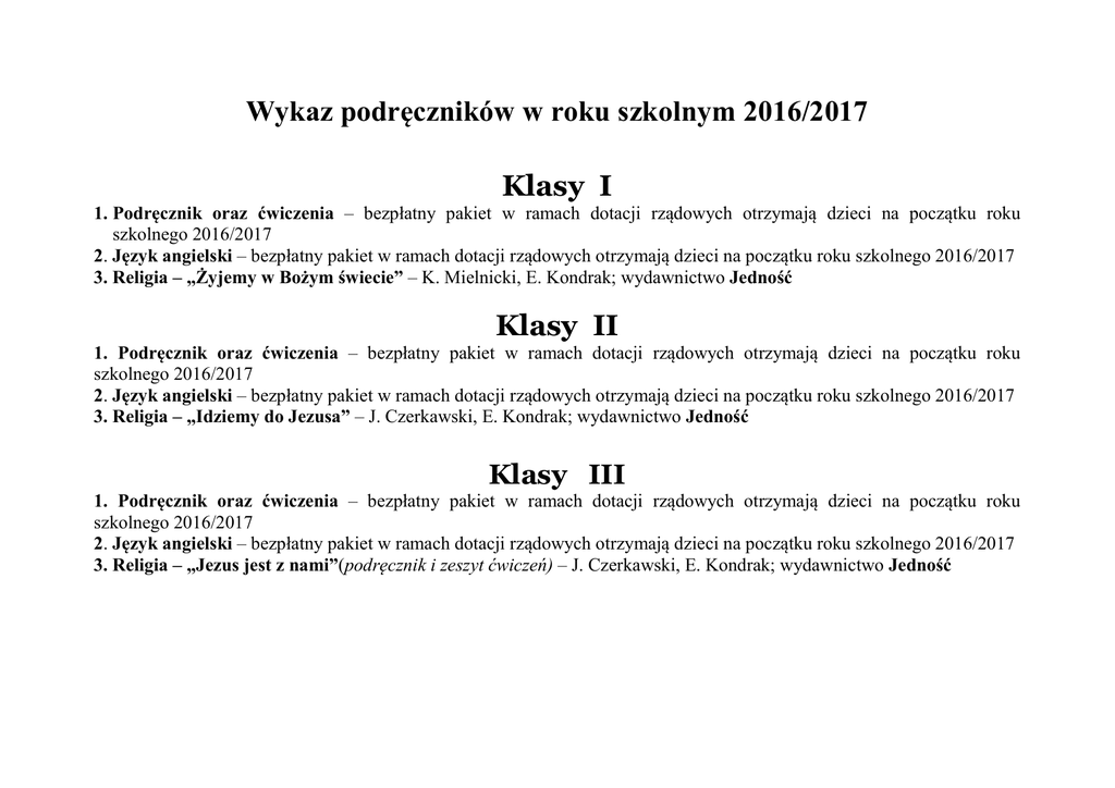Wykaz podręczników w roku szkolnym 2016/2017 Klasy I 1. Podręcznik oraz ćwiczenia – bezpłatny pakiet w ramach dotacji rządowych otrzymają dzieci na początku roku szkolnego 2016/2017 2. Język angielski – bezpłatny pakiet w ramach dotacji rządowych otrzymają dzieci na początku roku szkolnego 2016/2017 3. Religia – „Żyjemy w Bożym świecie” – K. Mielnicki, E. Kondrak; wydawnictwo Jedność Klasy II 1. Podręcznik oraz ćwiczenia – bezpłatny pakiet w ramach dotacji rządowych otrzymają dzieci na początku roku szkolnego 2016/2017 2. Język angielski – bezpłatny pakiet w ramach dotacji rządowych otrzymają dzieci na początku roku szkolnego 2016/2017 3. Religia – „Idziemy do Jezusa” – J. Czerkawski, E. Kondrak; wydawnictwo Jedność Klasy III 1. Podręcznik oraz ćwiczenia – bezpłatny pakiet w ramach dotacji rządowych otrzymają dzieci na początku roku szkolnego 2016/2017 2. Język angielski – bezpłatny pakiet w ramach dotacji rządowych otrzymają dzieci na początku roku szkolnego 2016/2017 3. Religia – „Jezus jest z nami”(podręcznik i zeszyt ćwiczeń) – J. Czerkawski, E. Kondrak; wydawnictwo Jedność