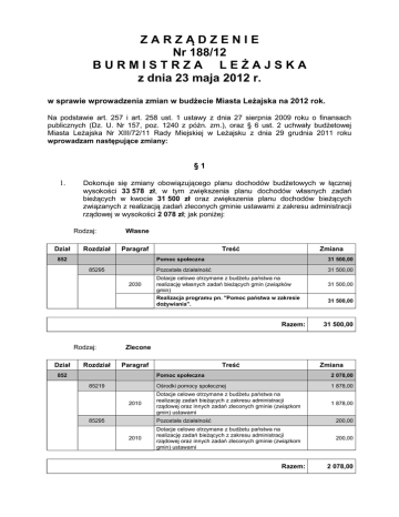 ZARZĄDZENIE Nr 188/12 BURMISTRZA LEŻAJSKA z dnia 23 maja 2012 r. w sprawie wprowadzenia zmian w budżecie Miasta Leżajska na 2012 rok. Na podstawie art. 257 i art. 258 ust. 1 ustawy z dnia 27 sierpnia 2009 roku o finansach publicznych (Dz. U. Nr 157, poz. 1240 z póżn. zm.), oraz § 6 ust. 2 uchwały budżetowej Miasta Leżajska Nr XIII/72/11 Rady Miejskiej w Leżajsku z dnia 29 grudnia 2011 roku wprowadzam następujące zmiany: §1 1. Dokonuje się zmiany obowiązującego planu dochodów budżetowych w łącznej wysokości 33 578 zł, w tym zwiększenia planu dochodów własnych zadań bieżących w kwocie 31 500 zł oraz zwiększenia planu dochodów bieżących związanych z realizacją zadań zleconych gminie ustawami z zakresu administracji rządowej w wysokości 2 078 zł; jak poniżej: Rodzaj: Dział Rozdział Własne Paragraf 852 85295 2030 Treść Zmiana Pomoc społeczna 31 500,00 Pozostała działalność 31 500,00 Dotacje celowe otrzymane z budżetu państwa na realizację własnych zadań bieżących gmin (związków gmin) Realizacja programu pn. "Pomoc państwa w zakresie dożywiania". Razem: Rodzaj: Dział Rozdział 31 500,00 31 500,00 31 500,00 Zlecone Paragraf 852 85219 2010 85295 2010 Treść Zmiana Pomoc społeczna 2 078,00 Ośrodki pomocy społecznej 1 878,00 Dotacje celowe otrzymane z budżetu państwa na realizację zadań bieżących z zakresu administracji rządowej oraz innych zadań zleconych gminie (związkom gmin) ustawami 1 878,00 Pozostała działalność 200,00 Dotacje celowe otrzymane z budżetu państwa na realizację zadań bieżących z zakresu administracji rządowej oraz innych zadań zleconych gminie (związkom gmin) ustawami 200,00 Razem: 2 078,00 2. Dział Dokonuje się zmiany obowiązującego planu wydatków budżetowych w łącznej wysokości 33 578 zł, w tym zwiększenia planu wydatków własnych zadań bieżących w ogólnej kwocie 26 926,23 zł, a także zwiększenia planu wydatków bieżących związanych z realizacją zadań zleconych gminie ustawami z zakresu administracji rządowej w wysokości 2 078 zł oraz planu wydatków inwestycyjnych w kwocie 4 573,77 zł; jak poniżej: Rozdział Paragraf 852 Treść Zmiana Pomoc społeczna 85202 4330 85214 3119 4300 85215 3110 85219 3030 85295 33 578,00 Domy pomocy społecznej 7 000,00 Zakup usług przez jednostki samorządu terytorialnego od innych jednostek samorządu terytorialnego 7 000,00 Własne 7 000,00 Zasiłki i pomoc w naturze oraz składki na ubezpieczenia emerytalne i rentowe 18 500,00 Świadczenia społeczne 15 000,00 Własne 15 000,00 Zakup usług pozostałych 3 500,00 Własne 3 500,00 Dodatki mieszkaniowe - 25 500,00 Świadczenia społeczne - 25 500,00 Własne - 25 500,00 Ośrodki pomocy społecznej 1 878,00 Różne wydatki na rzecz osób fizycznych 1 878,00 Zlecone 1 878,00 Pozostała działalność 3110 3119 4210 926 92601 6050 92604 4300 31 700,00 Świadczenia społeczne - 29 845,09 Własne - 30 045,09 Zlecone 200,00 Świadczenia społeczne 30 045,09 Własne 30 045,09 Zakup materiałów i wyposażenia 31 500,00 Własne 31 500,00 Kultura fizyczna 0,00 Obiekty sportowe 4 573,77 Wydatki inwestycyjne jednostek budżetowych 4 573,77 Własne 4 573,77 Instytucje kultury fizycznej - 4 573,77 Zakup usług pozostałych - 4 573,77 Własne - 4 573,77 Razem: 33 578,00 3. Dział Dokonuje się zmiany planu wydatków majątkowych na przyjętych do realizacji zadaniach inwestycyjnych, w tym poprzez zwiększenie obowiązującego planu o kwotę w łącznej wysokości 4 573,77 zł; jak poniżej: Rozdział Paragraf 900 90015 6050 Treść Zmiana Gospodarka komunalna i ochrona środowiska 0,00 Oświetlenie ulic, placów i dróg 0,00 Wydatki inwestycyjne jednostek budżetowych 0,00 BUDOWA OŚWIETLENIA NA PLACU ZABAW PO BYŁYM PRZEDSZKOLU 926 92601 6050 - 4 000,00 BUDOWA OŚWIETLENIA PRZY UL. B. PRUSA 4 000,00 Kultura fizyczna 4 573,77 Obiekty sportowe 4 573,77 Wydatki inwestycyjne jednostek budżetowych 4 573,77 MODERNIZACJA KORTÓW TENISOWYCH PRZY SZKOLE PODSTAWOWEJ NR 2 W LEŻAJSKU 8 500,00 MONTAŻ INSTALACJI SOLARNEJ DLA KRYTEJ PŁYWALNI I BUDYNKU ZAPLECZA SOCJALNEGO NA STADIONIE MIEJSKIM - STUDIUM WYKONALNOSCI PROJEKTU "ENERGIA SŁONECZNA W OBIEKTACH MIASTA LEŻAJSK CZYNNIKIEM POPRAWY ŚRODOWISKA NATURALNEGO". - 3 926,23 Razem 4 573,77 §2 Traci moc Zarządzenie Nr 182/12 Burmistrza Leżajska z dnia 11 maja 2012 roku w sprawie wprowadzenia zmian w budżecie Miasta Leżajska na 2012 rok. §3 Wykonanie Zarządzenia powierzam Skarbnikowi Miasta Leżajska. §4 Zarządzenie wchodzi w życie z dniem podjęcia. BURMISTRZ LEŻAJSKA mgr inż. Piotr Urban
