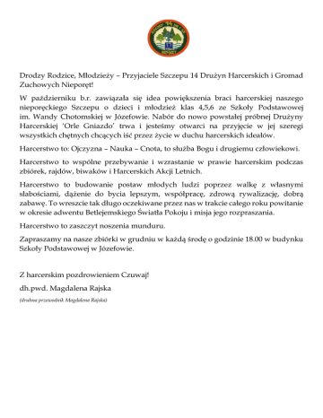 Drodzy Rodzice, Młodzieży – Przyjaciele Szczepu 14 Drużyn Harcerskich i Gromad Zuchowych Nieporęt! W październiku b.r. zawiązała się idea powiększenia braci harcerskiej naszego nieporęckiego Szczepu o dzieci i młodzież klas 4,5,6 ze Szkoły Podstawowej im. Wandy Chotomskiej w Józefowie. Nabór do nowo powstałej próbnej Drużyny Harcerskiej ‘Orle Gniazdo’ trwa i jesteśmy otwarci na przyjęcie w jej szeregi wszystkich chętnych chcących iść przez życie w duchu harcerskich ideałów. Harcerstwo to: Ojczyzna – Nauka – Cnota, to służba Bogu i drugiemu człowiekowi. Harcerstwo to wspólne przebywanie i wzrastanie w prawie harcerskim podczas zbiórek, rajdów, biwaków i Harcerskich Akcji Letnich. Harcerstwo to budowanie postaw młodych ludzi poprzez walkę z własnymi słabościami, dążenie do bycia lepszym, współpracę, zdrową rywalizację, dobrą zabawę. To wreszcie tak długo oczekiwane przez nas w trakcie całego roku powitanie w okresie adwentu Betlejemskiego Światła Pokoju i misja jego rozpraszania. Harcerstwo to zaszczyt noszenia munduru. Zapraszamy na nasze zbiórki w grudniu w każdą środę o godzinie 18.00 w budynku Szkoły Podstawowej w Józefowie. Z harcerskim pozdrowieniem Czuwaj! dh.pwd. Magdalena Rajska (druhna przewodnik Magdalena Rajska)