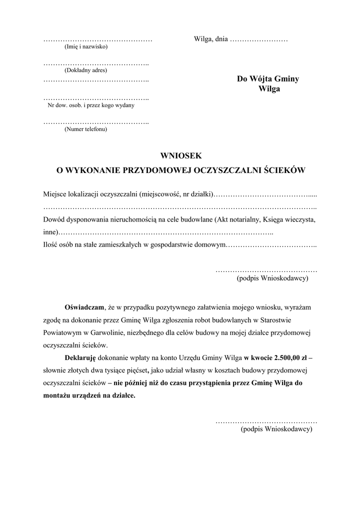 ……………………………………… Wilga, dnia …………………… (Imię i nazwisko) …………………………………….. (Dokładny adres) Do Wójta Gminy Wilga …………………………………….. …………………………………….. Nr dow. osob. i przez kogo wydany …………………………………….. (Numer telefonu) WNIOSEK O WYKONANIE PRZYDOMOWEJ OCZYSZCZALNI ŚCIEKÓW Miejsce lokalizacji oczyszczalni (miejscowość, nr działki)…………………………………..... ………………………………………………………………………………………………….. Dowód dysponowania nieruchomością na cele budowlane (Akt notarialny, Księga wieczysta, inne)…………………………………………………………………………….. Ilość osób na stałe zamieszkałych w gospodarstwie domowym……………………………….. …………………………………… (podpis Wnioskodawcy) Oświadczam, że w przypadku pozytywnego załatwienia mojego wniosku, wyrażam zgodę na dokonanie przez Gminę Wilga zgłoszenia robot budowlanych w Starostwie Powiatowym w Garwolinie, niezbędnego dla celów budowy na mojej działce przydomowej oczyszczalni ścieków. Deklaruję dokonanie wpłaty na konto Urzędu Gminy Wilga w kwocie 2.500,00 zł – słownie złotych dwa tysiące pięćset, jako udział własny w kosztach budowy przydomowej oczyszczalni ścieków – nie później niż do czasu przystąpienia przez Gminę Wilga do montażu urządzeń na działce. …………………………………… (podpis Wnioskodawcy)